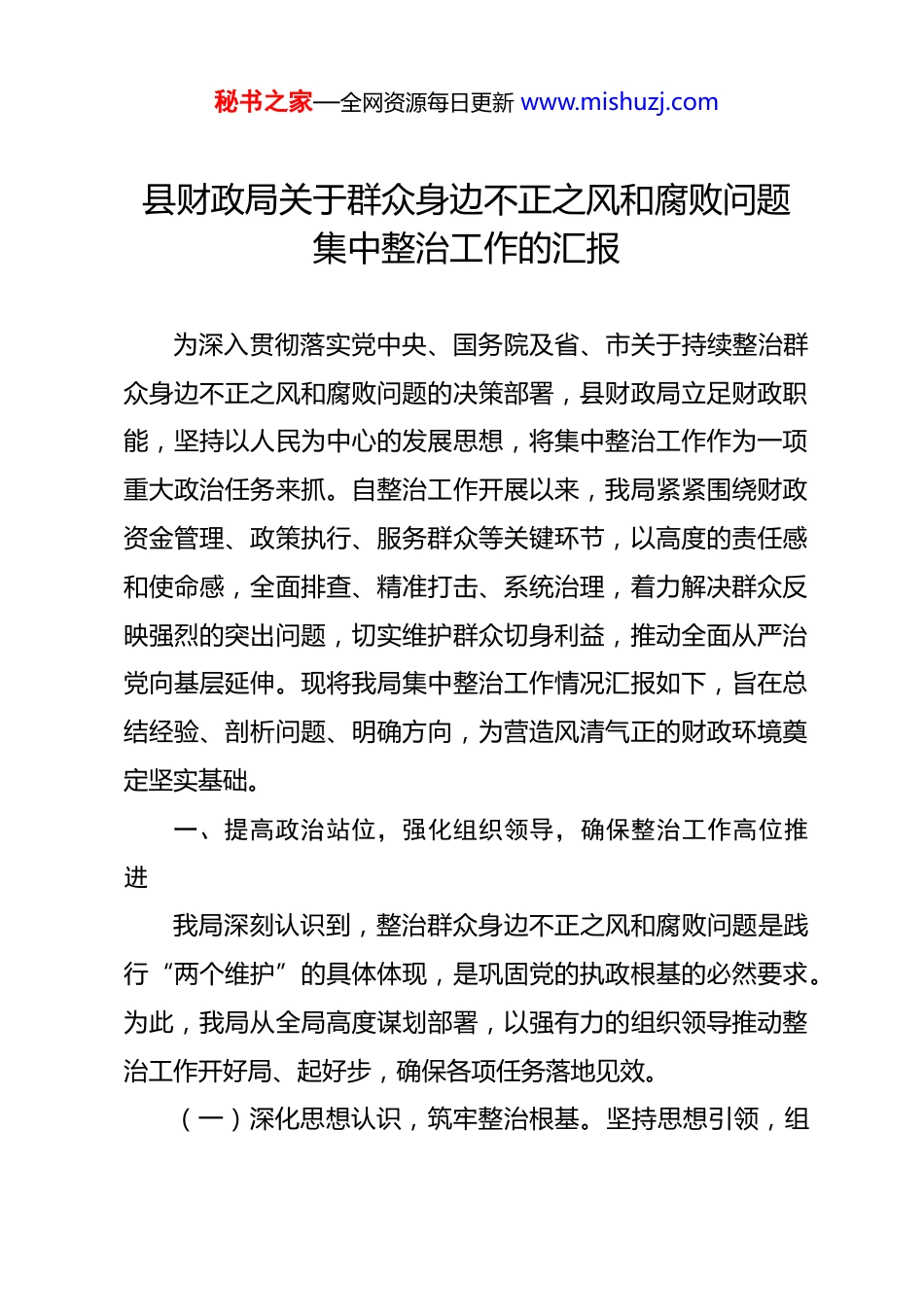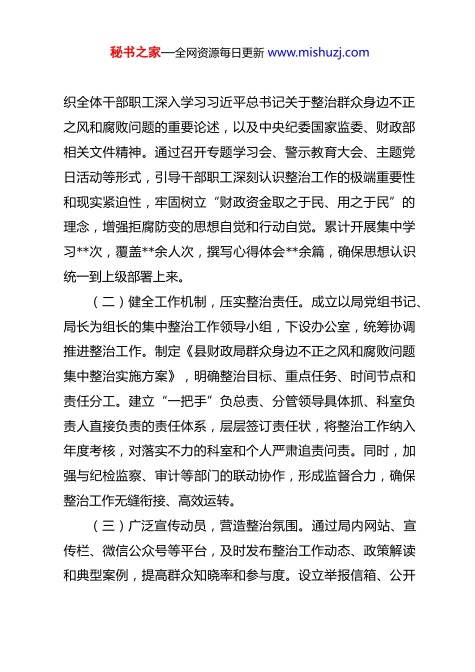 秘书之家—全网资源每日更新 www.mishuzj.com县财政局关于群众身边不正之风和腐败问题集中整治工作的汇报 为深入贯彻落实党中央、国务院及省、市关于持续整治群众身边不正之风和腐败问题的决策部署,县财政局立足财政职能,坚持以人民为中心的发展思想,将集中整治工作作为一项重大政治任务来抓。自整治工作开展以来,我局紧紧围绕财政资金管理、政策执行、服务群众等关键环节,以高度的责任感和使命感,全面排查、精准打击、系统治理,着力解决群众反映强烈的突出问题,切实维护群众切身利益,推动全面从严治党向基层延伸。现将我局集中整治工作情况汇报如下,旨在总结经验、剖析问题、明确方向,为营造风清气正的财政环境奠定坚实基础。一、提高政治站位,强化组织领导,确保整治工作高位推进我局深刻认识到,整治群众身边不正之风和腐败问题是践行“两个维护”的具体体现,是巩固党的执政根基的必然要求。为此,我局从全局高度谋划部署,以强有力的组织领导推动整治工作开好局、起好步,确保各项任务落地见效。(一)深化思想认识,筑牢整治根基。坚持思想引领,组秘书之家—全网资源每日更新 www.mishuzj.com织全体干部职工深入学习习近平总书记关于整治群众身边不正之风和腐败问题的重要论述,以及中央纪委国家监委、财政部相关文件精神。通过召开专题学习会、警示教育大会、主题党日活动等形式,引导干部职工深刻认识整治工作的极端重要性和现实紧迫性,牢固树立“财政资金取之于民、用之于民”的理念,增强拒腐防变的思想自觉和行动自觉。累计开展集中学习**次,覆盖**余人次,撰写心得体会**余篇,确保思想认识统一到上级部署上来。(二)健全工作机制,压实整治责任。成立以局党组书记、局长为组长的集中整治工作领导小组,下设办公室,统筹协调推进整治工作。制定《县财政局群众身边不正之风和腐败问题集中整治实施方案》,明确整治目标、重点任务、时间节点和责任分工。建立“一把手”负总责、分管领导具体抓、科室负责人直接负责的责任体系,层层签订责任状,将整治工作纳入年度考核,对落实不力的科室和个人严肃追责问责。同时,加强与纪检监察、审计等部门的联动协作,形成监督合力,确保整治工作无缝衔接、高效运转。(三)广泛宣传动员,营造整治氛围。通过局内网站、宣传栏、微信公众号等平台,及时发布整治工作动态、政策解读和典型案例,提高群众知晓率和参与度。设立举报信箱、公开秘书之家—全网资源每日更新 www.mishuzj.com举报电话和电子邮箱,畅通群众反映问题渠道,鼓励社会监督。组织开展“财政开放日”活动,邀请群众代表、人大代表、政协委员参与座谈,听取意见建议,营造全员参与、全员监督的浓厚氛围。累计发布宣传信息**余条,接收群众来信来访**余件,均已依法依规处理。二、聚焦重点领域,精准施策发力,推动整治工作走深走实我局紧盯财政领域群众身边不正之风和腐败问题的易发多发环节,以惠民资金、政府采购、资产管理等为重点,靶向施治、精准发力,确保整治工作取得实质性进展。(一)紧盯惠民资金,严查截留挪用。针对惠农补贴、社会保障、教育医疗等民生资金,开展专项清查行动。一是完善资金发放流程,推行“一卡通”管理,确保资金直达群众账户,减少中间环节。二是运用大数据技术,比对分析资金发放数据,筛查异常情况,及时发现截留、挪用、冒领等问题。三是深入基层走访调研,实地核查资金到位情况,听取群众呼声。整治期间,共清查惠民资金项目**项,涉及金额**亿元,发现并整改问题*个,追回违规资金**万元,处理相关责任人*名,确保每一分钱都用在刀刃上。(二)规范采购流程,防范利益输送。以政府采购为切入秘书之家—全网资源每日更新 www.mishuzj.com点,着力整治围标串标、虚假招标、内外勾结等腐败问题。一是修订完善政府采购管理制度,明确采购主体、程序、监管要求,推行电子化采购平台,实现全过程留痕、可追溯。二是加强采购项目审核,对重大采购项目进行前置审查,杜绝违规操作。三是强化供应商管理,建立黑名单制度,对违法违规供应商依法惩戒。整治期间,共审查采购项目**余个,发现问题项目*个,节约资金**万...