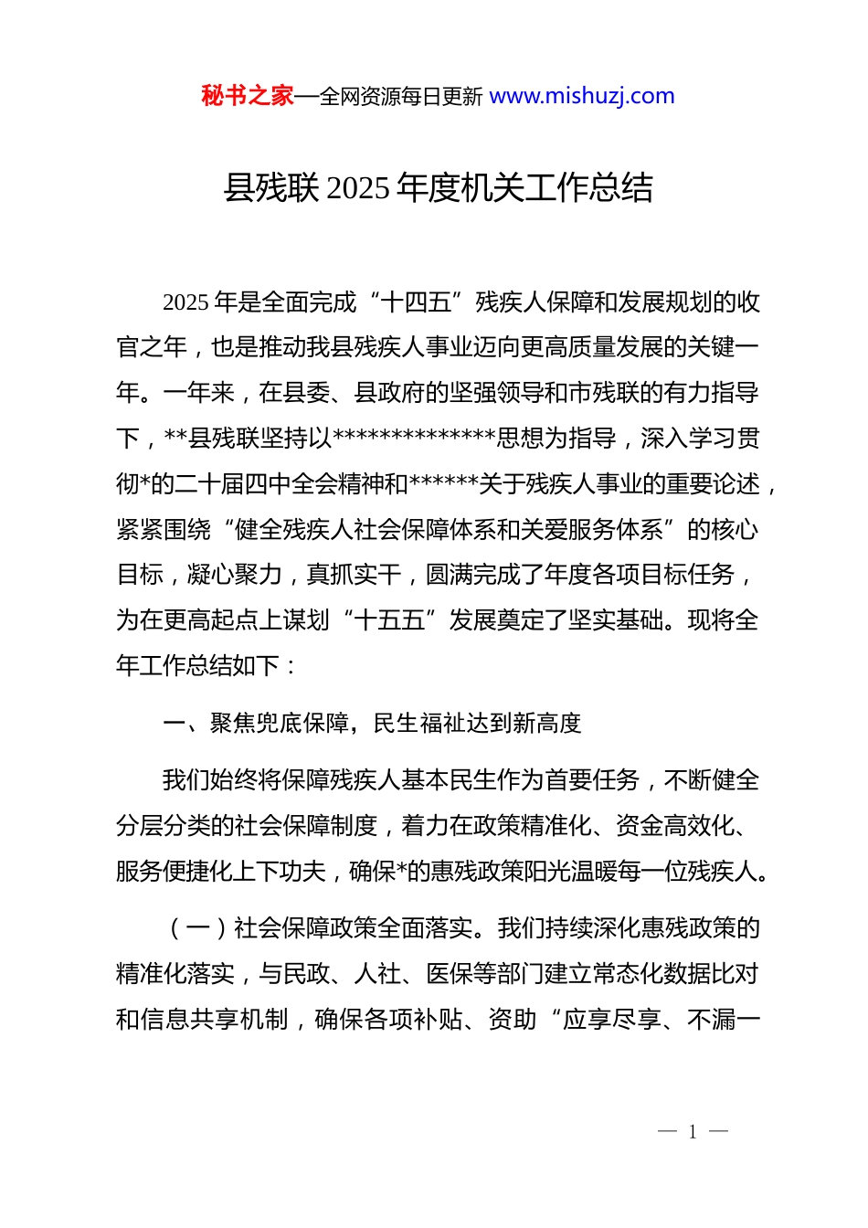 秘书之家—全网资源每日更新 www.mishuzj.com县残联 2025 年度机关工作总结2025 年是全面完成“十四五”残疾人保障和发展规划的收官之年,也是推动我县残疾人事业迈向更高质量发展的关键一年。一年来,在县委、县政府的坚强领导和市残联的有力指导下,**县残联坚持以**************思想为指导,深入学习贯彻*的二十届四中全会精神和******关于残疾人事业的重要论述,紧紧围绕“健全残疾人社会保障体系和关爱服务体系”的核心目标,凝心聚力,真抓实干,圆满完成了年度各项目标任务,为在更高起点上谋划“十五五”发展奠定了坚实基础。现将全年工作总结如下:一、聚焦兜底保障,民生福祉达到新高度我们始终将保障残疾人基本民生作为首要任务,不断健全分层分类的社会保障制度,着力在政策精准化、资金高效化、服务便捷化上下功夫,确保*的惠残政策阳光温暖每一位残疾人。(一)社会保障政策全面落实。我们持续深化惠残政策的精准化落实,与民政、人社、医保等部门建立常态化数据比对和信息共享机制,确保各项补贴、资助“应享尽享、不漏一— 1 —秘书之家—全网资源每日更新 www.mishuzj.com人”。截至 2025 年 12 月,全县累计为超过 14700 名困难残疾人发放生活补贴,总金额达 1485 万元;为近 13000 名重度残疾人发放护理补贴,总金额达 1120 万元,实现了动态管理下的精准发放。我们全额资助了全县 8850 名重度残疾人参加城乡居民基本医疗保险,为 6500 余名重度贫困残疾人代缴养老保险,有效减轻了残疾人家庭的经济负担,筑牢了基本生活保障防线。(二)财政资金使用规范高效。我们严格执行预算管理制度,确保每一笔资金都用在刀刃上。2025 年,县残联全年预算总支出约 298 万元,其中基本支出 185 万元,主要用于保障机关正常运转的人员经费和公用经费;项目支出 113 万元,重点投向残疾人康复、就业、教育、文化体育及无障碍改造等核心业务领域。我们积极争取上级补助资金,成功获得中央及省级残疾人事业发展补助资金 75 万元,全部用于实施重点民生项目,资金使用效益显著提升。通过加强内部审计和监督,确保了资金运行的安全、规范、透明。(三)关爱救助体系日益完善。我们积极拓展社会化救助渠道,动员社会力量参与扶残助残。年内,通过与本地爱心企业和公益组织合作,募集款物合计超过 30 万元,为 200 余户特困残疾人家庭送去了生活物资和慰问金。在元旦、春节、“全— 2 —秘书之家—全网资源每日更新 www.mishuzj.com国助残日”等重要节点,组织开展了形式多样的走访慰问活动,覆盖残疾人家庭超过 800 户,传递了*和政府的关怀以及社会大家庭的温暖。二、聚焦精准服务,康复质量实现新提升我们坚持以“人人享有康复服务”为目标,不断完善康复服务网络,创新服务模式,提升服务专业化水平,帮助残疾人改善功能、融入社会。(一)机构康复服务能力显著增强。县残疾人康复托养中心作为我县残疾儿童康复的主阵地,持续优化“康复照料+融合教育”服务模式。2025 年,中心共为 310 名 0-12 岁残疾儿童提供了包括物理治疗、作业治疗、言语矫治、感统训练在内的系统性康复训练服务,服务总时长超过 4 万小时。通过科学评估和个性化干预,儿童康复有效率达到 95%以上,其中 65 名儿童经过康复训练后,成功进入普通小学或幼儿园就读,实现了顺利的社会融入。中心现有 28 名专业的康复师和特教老师,为服务质量提供了有力保障。(二)辅助器具适配服务精准高效。我们深入开展残疾人辅助器具需求调查,建立了详尽的需求档案。年内,我们成功— 3 —秘书之家—全网资源每日更新 www.mishuzj.com为 1150 名残疾人适配了轮椅、护理床、助行器、坐便椅等基本型辅助器具。同时,着力提升个性化、高品质辅具的供给能力,为 35 名肢体残疾人量身定制并装配了假肢或矫形器,为 5 名听障儿童验配了数字助听器,有效提升了他们的生活自理能力和参与社会活动的能力。(三)社区与居家康复服务广泛覆盖。我们积极探索“机构+社区+家庭”三位一体的康复服务网络,将专业服务延伸至残疾人身边。通过政府购买服务的方式,我们组...