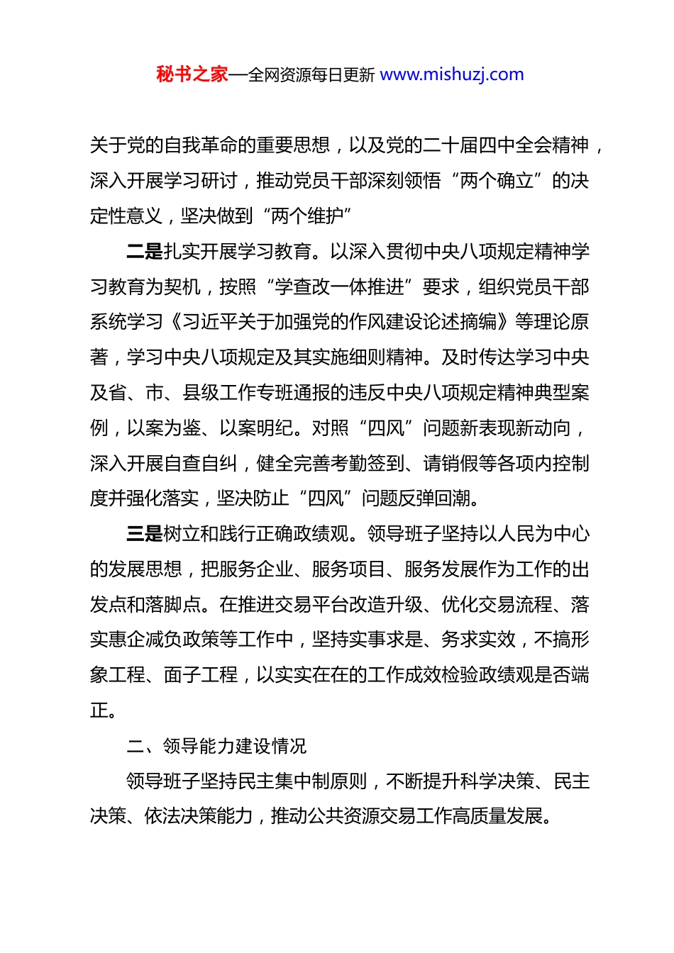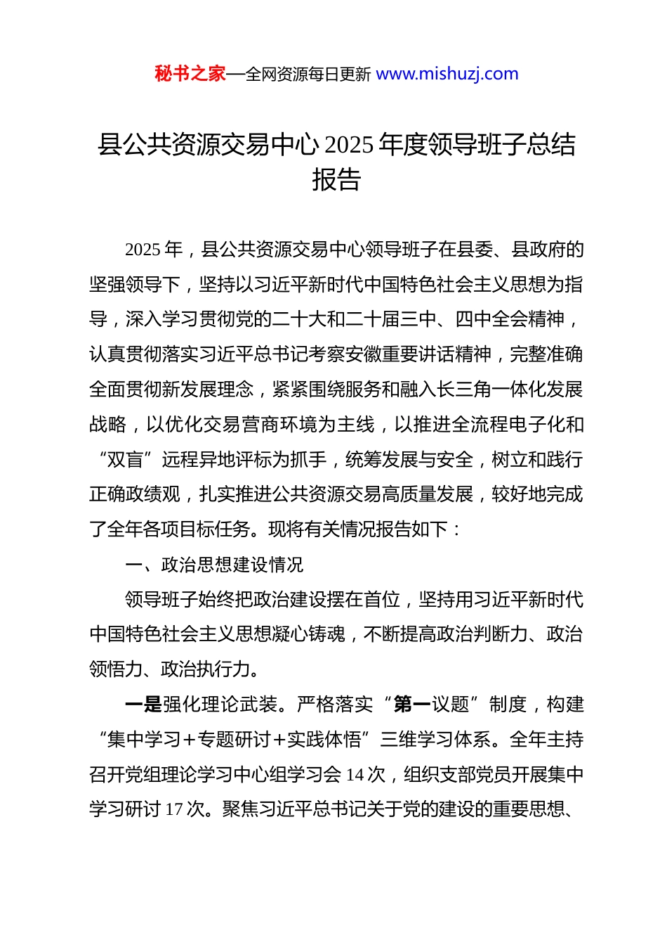 秘书之家—全网资源每日更新 www.mishuzj.com县公共资源交易中心 2025 年度领导班子总结报告 2025 年,县公共资源交易中心领导班子在县委、县政府的坚强领导下,坚持以习近平新时代中国特色社会主义思想为指导,深入学习贯彻党的二十大和二十届三中、四中全会精神,认真贯彻落实习近平总书记考察安徽重要讲话精神,完整准确全面贯彻新发展理念,紧紧围绕服务和融入长三角一体化发展战略,以优化交易营商环境为主线,以推进全流程电子化和“双盲”远程异地评标为抓手,统筹发展与安全,树立和践行正确政绩观,扎实推进公共资源交易高质量发展,较好地完成了全年各项目标任务。现将有关情况报告如下:一、政治思想建设情况领导班子始终把政治建设摆在首位,坚持用习近平新时代中国特色社会主义思想凝心铸魂,不断提高政治判断力、政治领悟力、政治执行力。一是强化理论武装。严格落实“第一议题”制度,构建“集中学习+专题研讨+实践体悟”三维学习体系。全年主持召开党组理论学习中心组学习会 14 次,组织支部党员开展集中学习研讨 17 次。聚焦习近平总书记关于党的建设的重要思想、秘书之家—全网资源每日更新 www.mishuzj.com关于党的自我革命的重要思想,以及党的二十届四中全会精神,深入开展学习研讨,推动党员干部深刻领悟“两个确立”的决定性意义,坚决做到“两个维护”二是扎实开展学习教育。以深入贯彻中央八项规定精神学习教育为契机,按照“学查改一体推进”要求,组织党员干部系统学习《习近平关于加强党的作风建设论述摘编》等理论原著,学习中央八项规定及其实施细则精神。及时传达学习中央及省、市、县级工作专班通报的违反中央八项规定精神典型案例,以案为鉴、以案明纪。对照“四风”问题新表现新动向,深入开展自查自纠,健全完善考勤签到、请销假等各项内控制度并强化落实,坚决防止“四风”问题反弹回潮。三是树立和践行正确政绩观。领导班子坚持以人民为中心的发展思想,把服务企业、服务项目、服务发展作为工作的出发点和落脚点。在推进交易平台改造升级、优化交易流程、落实惠企减负政策等工作中,坚持实事求是、务求实效,不搞形象工程、面子工程,以实实在在的工作成效检验政绩观是否端正。二、领导能力建设情况领导班子坚持民主集中制原则,不断提升科学决策、民主决策、依法决策能力,推动公共资源交易工作高质量发展。秘书之家—全网资源每日更新 www.mishuzj.com一是完善议事决策机制。严格执行“三重一大”决策制度,凡涉及重大事项、重要人事任免、重大项目安排和大额资金使用,均提交党组会议集体研究决定。全年召开党组会议 26 次,专题研究全面从严治党、党风廉政建设等党建工作 4 次,研究业务发展、平台建设等重大事项 22 次,确保各项决策科学民主、依法合规。二是强化统筹协调能力。围绕县域发展大局,主动对接重大项目、民生工程交易需求,建立全流程服务清单,按照“一项目一方案”标准定制服务方案。全年累计服务 45 个重大项目进市级平台交易,服务进场交易项目 676 个。针对紧急项目开通“绿色通道”,压缩公告发布、专家抽取等环节时限,优先安排开评标场地,有效保障项目早落地、早开工、早见效。三是推进改革创新。主动适应公共资源交易领域数字化变革新要求,积极争取改造资金,合理高效布局开评标场地改造升级,新增 3 个开标室、4 个评标室、19 个评标工位、1 个电子竞价室,开评标功能更加完备,空间利用率显著提升。常态化实施“双盲”远程异地评标,全年累计保障 382 场,有效减少本地“熟人效应”对评标公平性的影响。三、工作实绩情况领导班子坚持围绕中心、服务大局,聚焦主责主业,全力秘书之家—全网资源每日更新 www.mishuzj.com推动公共资源交易提质增效。一是交易规模稳步增长。截至 11 月底,全县进入平台交易项目共 676 项,交易额 359589.50 万元,增收节支额 54926.92万元,增收节支率 13.25%,居三县首位。与去年同期相比,交易数量增加 15.16%,交易额增加 50.07%,增收节支率增长1.49 个百分点,交易规模和质量实现双提升。二是营商环境持续优化。持续推进项目交易全...