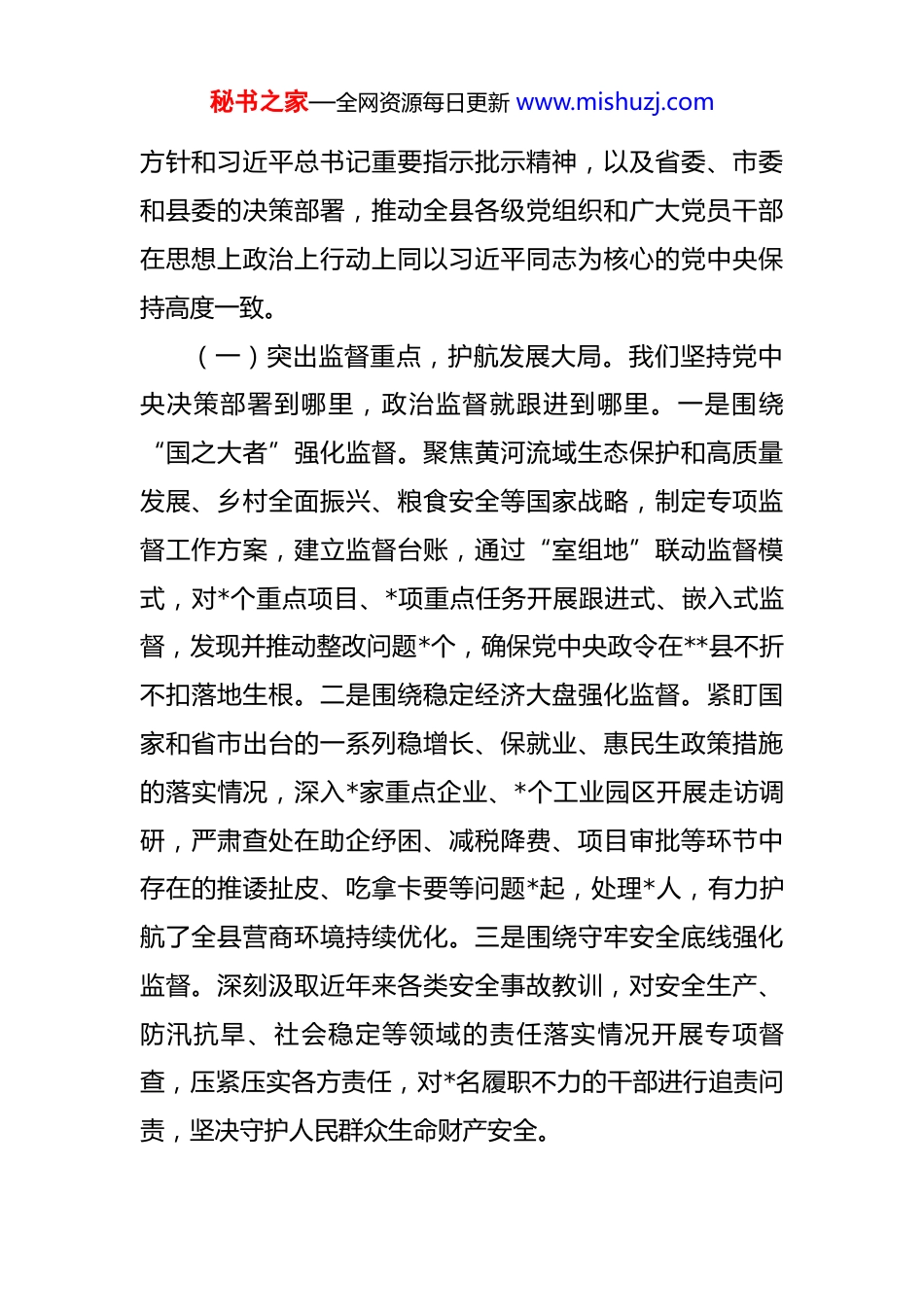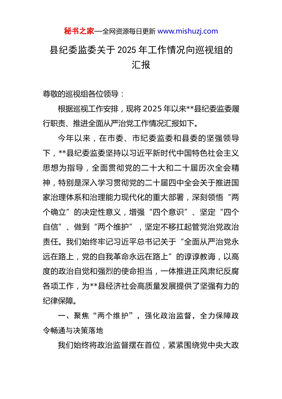 秘书之家—全网资源每日更新 www.mishuzj.com县纪委监委关于 2025 年工作情况向巡视组的汇报 尊敬的巡视组各位领导:根据巡视工作安排,现将 2025 年以来**县纪委监委履行职责、推进全面从严治党工作情况汇报如下。今年以来,在市委、市纪委监委和县委的坚强领导下,**县纪委监委坚持以习近平新时代中国特色社会主义思想为指导,全面贯彻党的二十大和二十届历次全会精神,特别是深入学习贯彻党的二十届四中全会关于推进国家治理体系和治理能力现代化的重大部署,深刻领悟“两个确立”的决定性意义,增强“四个意识”、坚定“四个自信”、做到“两个维护”,坚定不移扛起管党治党政治责任。我们始终牢记习近平总书记关于“全面从严治党永远在路上,党的自我革命永远在路上”的谆谆教诲,以高度的政治自觉和强烈的使命担当,一体推进正风肃纪反腐各项工作,为**县经济社会高质量发展提供了坚强有力的纪律保障。一、聚焦“两个维护”,强化政治监督,全力保障政令畅通与决策落地我们始终将政治监督摆在首位,紧紧围绕党中央大政秘书之家—全网资源每日更新 www.mishuzj.com方针和习近平总书记重要指示批示精神,以及省委、市委和县委的决策部署,推动全县各级党组织和广大党员干部在思想上政治上行动上同以习近平同志为核心的党中央保持高度一致。(一)突出监督重点,护航发展大局。我们坚持党中央决策部署到哪里,政治监督就跟进到哪里。一是围绕“国之大者”强化监督。聚焦黄河流域生态保护和高质量发展、乡村全面振兴、粮食安全等国家战略,制定专项监督工作方案,建立监督台账,通过“室组地”联动监督模式,对*个重点项目、*项重点任务开展跟进式、嵌入式监督,发现并推动整改问题*个,确保党中央政令在**县不折不扣落地生根。二是围绕稳定经济大盘强化监督。紧盯国家和省市出台的一系列稳增长、保就业、惠民生政策措施的落实情况,深入*家重点企业、*个工业园区开展走访调研,严肃查处在助企纾困、减税降费、项目审批等环节中存在的推诿扯皮、吃拿卡要等问题*起,处理*人,有力护航了全县营商环境持续优化。三是围绕守牢安全底线强化监督。深刻汲取近年来各类安全事故教训,对安全生产、防汛抗旱、社会稳定等领域的责任落实情况开展专项督查,压紧压实各方责任,对*名履职不力的干部进行追责问责,坚决守护人民群众生命财产安全。秘书之家—全网资源每日更新 www.mishuzj.com(二)创新监督方式,提升监督效能。为破解监督难题,我们积极探索创新监督路径,着力提升政治监督的精准性和实效性。一是推行“清单化”监督。将年度重点监督任务细化分解为*项具体清单,明确责任主体、监督内容和完成时限,实行挂图作战、销号管理,推动政治监督从“大水漫灌”向“精准滴灌”转变。二是深化“风腐同查”。在查办腐败案件的同时,深挖细查案件背后存在的政治问题、作风问题,今年以来,在查办的*起案件中,同步查处违反政治纪律和政治规矩问题*起,违反中央纪律规定精神问题*起,实现对“风”“腐”问题的“一案双查”。三是运用“大数据”赋能。积极融入全县“智慧城市”建设,探索建立民生资金、公车使用、工程项目等*个领域的大数据监督模型,通过数据比对、关联分析,精准发现异常线索*条,有效提升了发现问题的能力。(三)严肃政治纪律,净化政治生态。我们始终把严明党的政治纪律和政治规矩作为重中之重,坚决同危害党中央权威和集中统一领导的言行作斗争。一是加强对“一把手”和领导班子的监督。严格执行《中共中央关于加强对“一把手”和领导班子监督的意见》,协助县委制定了加强对“一把手”监督的*条具体措施,通过开展政治谈话、述责述廉、专项检查等方式,督促各级“一把手”严秘书之家—全网资源每日更新 www.mishuzj.com于律己、严负其责、严管所辖。今年共约谈各级“一把手”*人次。二是严肃查处违反政治纪律行为。对在贯彻执行党中央决策部署中打折扣、搞变通、做选择,以及散布政治谣言、发表不当言论等行为,坚持露头就打、从严查处。全年共查处违反政治纪律案件*件,给予党纪政务处分*人,释放了政治纪律是“带电高压线”的强烈信号。二、保持高压态势...