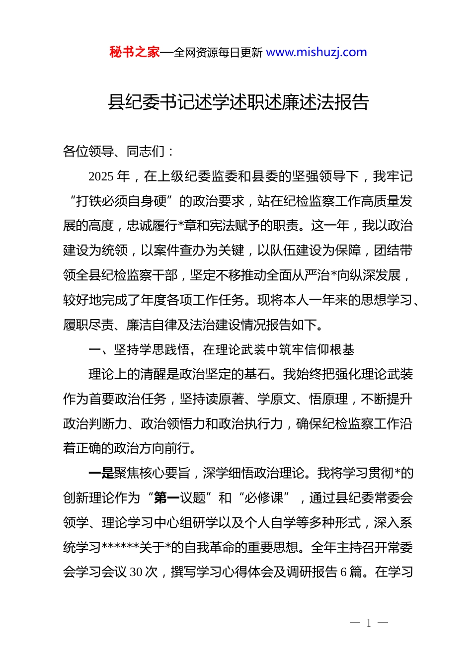 秘书之家—全网资源每日更新 www.mishuzj.com县纪委书记述学述职述廉述法报告各位领导、同志们:2025 年,在上级纪委监委和县委的坚强领导下,我牢记“打铁必须自身硬”的政治要求,站在纪检监察工作高质量发展的高度,忠诚履行*章和宪法赋予的职责。这一年,我以政治建设为统领,以案件查办为关键,以队伍建设为保障,团结带领全县纪检监察干部,坚定不移推动全面从严治*向纵深发展,较好地完成了年度各项工作任务。现将本人一年来的思想学习、履职尽责、廉洁自律及法治建设情况报告如下。一、坚持学思践悟,在理论武装中筑牢信仰根基理论上的清醒是政治坚定的基石。我始终把强化理论武装作为首要政治任务,坚持读原著、学原文、悟原理,不断提升政治判断力、政治领悟力和政治执行力,确保纪检监察工作沿着正确的政治方向前行。一是聚焦核心要旨,深学细悟政治理论。我将学习贯彻*的创新理论作为“第一议题”和“必修课”,通过县纪委常委会领学、理论学习中心组研学以及个人自学等多种形式,深入系统学习******关于*的自我革命的重要思想。全年主持召开常委会学习会议 30 次,撰写学习心得体会及调研报告 6 篇。在学习— 1 —秘书之家—全网资源每日更新 www.mishuzj.com过程中,我注重从政治高度把握全面从严治*的形势与任务,深刻领会“九个以”的实践要求,并自觉将其转化为指导纪检监察工作的具体思路和举措。针对新时期*风廉政建设出现的新特点,我反复研读******关于加强纪律建设的重要论述,努力掌握其中蕴含的立场、观点和方法,不断增强运用科学理论解决复杂问题的能力,确保在思想、政治和行动上与*中央保持高度一致。二是紧盯业务前沿,精研细读法规制度。纪检监察工作政治性、专业性强,要求我们不仅要懂政治,更要精通业务。我把业务学习作为履职的基础,带头学习《中国共产 dj 律处分条例》《中华人民共和国监察法》以及监督执纪工作规则等法律法规。结合全员培训工作,我主动走上讲台为全县纪检监察干部授课,带头开展“业务大比武”活动,营造了浓厚的比学赶超氛围。重点加强对职务犯罪调查、证据收集固定、案件审理定性等实务知识的钻研,对于疑难复杂案件,我坚持查阅法条、咨询专家,力求把每一个条款学懂弄通。通过系统学习,我对纪法贯通、法法衔接有了更深刻的认识,依规依纪依法履职的能力显著增强,为精准执纪执法奠定了坚实的专业基础。二、聚焦主责主业,在监督执纪中彰显担当作为一年来,我坚守监督基本职责,敢于斗争、善于斗争,坚— 2 —秘书之家—全网资源每日更新 www.mishuzj.com持无禁区、全覆盖、零容忍,一体推进不敢腐、不能腐、不想腐,推动全县*风廉政建设和反腐败斗争取得新成效。一是紧盯“国之大者”,做深做实政治监督。政治监督是纪检监察机关的首要职责。我将政治监督摆在突出位置,围绕乡村振兴、生态环保、耕地保护等重大决策部署的落实情况,开展专项监督检查 15 轮次。我亲自带队深入基层一线,实地走访调研,掌握第一手资料。通过监督检查,发现并纠正了一批存在的问题,确保*中央重大决策部署在我县落地见效。例如,在乡村振兴领域,重点监督产业发展项目资金使用情况,查处了多起违规挪用资金案件,保障了乡村振兴战略的顺利实施。二是保持“高压态势”,一体推进“三不腐”。在不敢腐方面,坚持有案必查、有腐必惩,加大对腐败问题的查处力度。全年共立案查处违纪违法案件 x 件,处分 x 人,其中涉及科级干部 x 人。严肃查处了一批在工程建设、土地出让、民生保障等重点领域的腐败案件,形成了强大的震慑效应。在不能腐方面,注重从制度层面堵塞漏洞,加强对权力运行的制约和监督。针对案件查办过程中发现的问题,及时向相关单位发出纪检监察建议书,督促其完善制度、加强管理。全年共发出纪检监察建议书 x 份,推动建立健全了一系列规章制度。在不想腐方面,加强廉政教育和廉洁文化建设。组织开展廉政警示教育活动 x— 3 —秘书之家—全网资源每日更新 www.mishuzj.com次,通过观看警示教育片、参观廉政教育基地等方式,教育引导*员干部增强廉洁自律意识。同时,积极推进廉洁文化进机关、进...