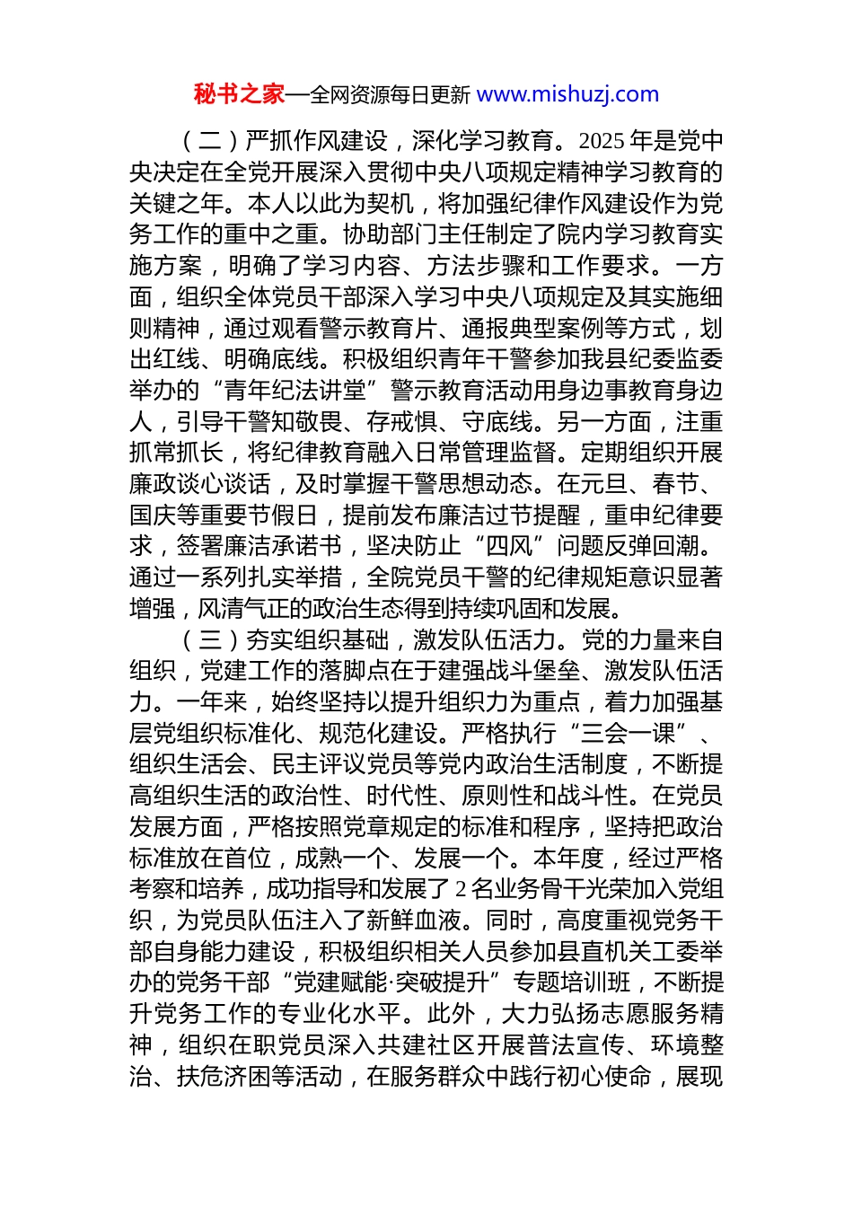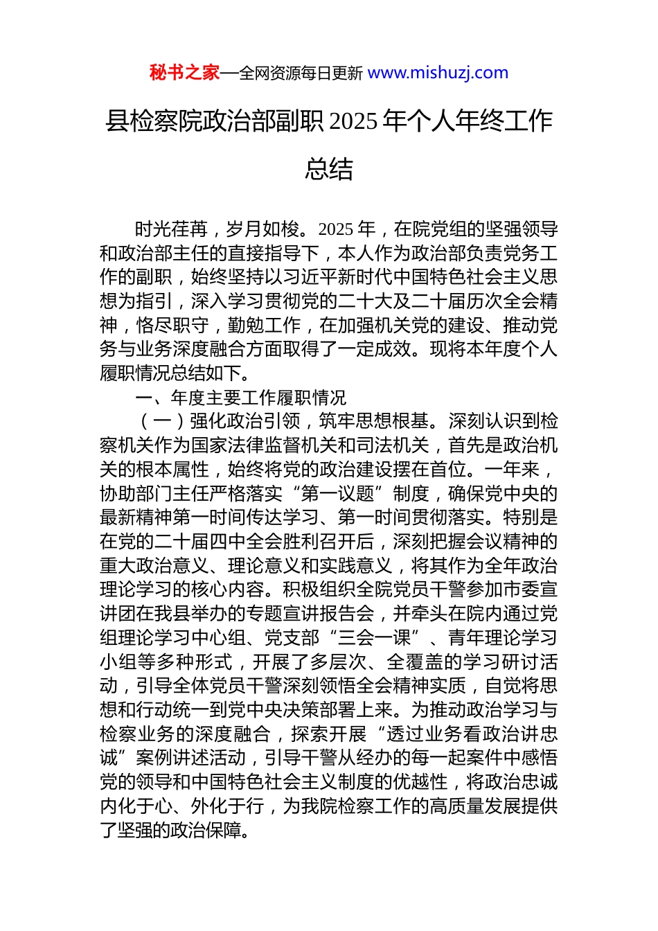 秘书之家—全网资源每日更新 www.mishuzj.com县检察院政治部副职 2025 年个人年终工作总结时光荏苒,岁月如梭。2025 年,在院党组的坚强领导和政治部主任的直接指导下,本人作为政治部负责党务工作的副职,始终坚持以习近平新时代中国特色社会主义思想为指引,深入学习贯彻党的二十大及二十届历次全会精神,恪尽职守,勤勉工作,在加强机关党的建设、推动党务与业务深度融合方面取得了一定成效。现将本年度个人履职情况总结如下。一、年度主要工作履职情况(一)强化政治引领,筑牢思想根基。深刻认识到检察机关作为国家法律监督机关和司法机关,首先是政治机关的根本属性,始终将党的政治建设摆在首位。一年来,协助部门主任严格落实“第一议题”制度,确保党中央的最新精神第一时间传达学习、第一时间贯彻落实。特别是在党的二十届四中全会胜利召开后,深刻把握会议精神的重大政治意义、理论意义和实践意义,将其作为全年政治理论学习的核心内容。积极组织全院党员干警参加市委宣讲团在我县举办的专题宣讲报告会,并牵头在院内通过党组理论学习中心组、党支部“三会一课”、青年理论学习小组等多种形式,开展了多层次、全覆盖的学习研讨活动,引导全体党员干警深刻领悟全会精神实质,自觉将思想和行动统一到党中央决策部署上来。为推动政治学习与检察业务的深度融合,探索开展“透过业务看政治讲忠诚”案例讲述活动,引导干警从经办的每一起案件中感悟党的领导和中国特色社会主义制度的优越性,将政治忠诚内化于心、外化于行,为我院检察工作的高质量发展提供了坚强的政治保障。秘书之家—全网资源每日更新 www.mishuzj.com(二)严抓作风建设,深化学习教育。2025 年是党中央决定在全党开展深入贯彻中央八项规定精神学习教育的关键之年。本人以此为契机,将加强纪律作风建设作为党务工作的重中之重。协助部门主任制定了院内学习教育实施方案,明确了学习内容、方法步骤和工作要求。一方面,组织全体党员干部深入学习中央八项规定及其实施细则精神,通过观看警示教育片、通报典型案例等方式,划出红线、明确底线。积极组织青年干警参加我县纪委监委举办的“青年纪法讲堂”警示教育活动用身边事教育身边人,引导干警知敬畏、存戒惧、守底线。另一方面,注重抓常抓长,将纪律教育融入日常管理监督。定期组织开展廉政谈心谈话,及时掌握干警思想动态。在元旦、春节、国庆等重要节假日,提前发布廉洁过节提醒,重申纪律要求,签署廉洁承诺书,坚决防止“四风”问题反弹回潮。通过一系列扎实举措,全院党员干警的纪律规矩意识显著增强,风清气正的政治生态得到持续巩固和发展。(三)夯实组织基础,激发队伍活力。党的力量来自组织,党建工作的落脚点在于建强战斗堡垒、激发队伍活力。一年来,始终坚持以提升组织力为重点,着力加强基层党组织标准化、规范化建设。严格执行“三会一课”、组织生活会、民主评议党员等党内政治生活制度,不断提高组织生活的政治性、时代性、原则性和战斗性。在党员发展方面,严格按照党章规定的标准和程序,坚持把政治标准放在首位,成熟一个、发展一个。本年度,经过严格考察和培养,成功指导和发展了 2 名业务骨干光荣加入党组织,为党员队伍注入了新鲜血液。同时,高度重视党务干部自身能力建设,积极组织相关人员参加县直机关工委举办的党务干部“党建赋能·突破提升”专题培训班,不断提升党务工作的专业化水平。此外,大力弘扬志愿服务精神,组织在职党员深入共建社区开展普法宣传、环境整治、扶危济困等活动,在服务群众中践行初心使命,展现秘书之家—全网资源每日更新 www.mishuzj.com了新时代检察干警的良好形象。(四)坚持党建引领,促进业务融合。党建工作如果脱离了业务工作,就容易成为“空中楼阁”。在工作中,始终牢固树立“抓好党建是最大政绩”的理念,积极探索党建与检察业务深度融合的有效路径。借鉴我院近年来形成的“四轮驱动”融合机制,坚持围绕中心、服务大局,将党建工作目标与检察业务发展目标同谋划、同部署、同考核。例如,在学习贯彻党的二十届四中全会关于完善中国特色社会主义法律体系、推进国家治理体系和治...