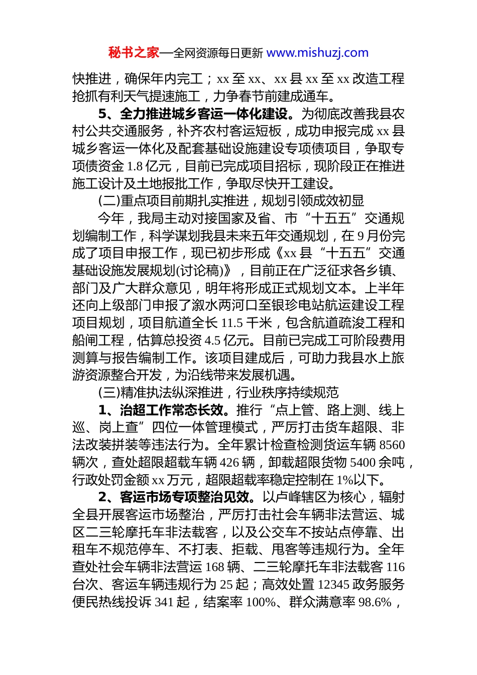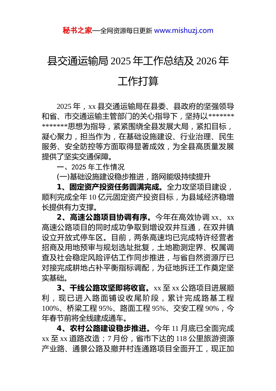 秘书之家—全网资源每日更新 www.mishuzj.com县交通运输局 2025 年工作总结及 2026 年工作打算2025 年,xx 县交通运输局在县委、县政府的坚强领导和省、市交通运输主管部门的关心指导下,坚持以**************思想为指导,紧紧围绕全县发展大局,紧扣目标,凝心聚力,担当作为,在基础设施建设、行业治理、民生服务、安全防控等方面取得显著成效,为全县高质量发展提供了坚实交通保障。一、2025 年工作情况(一)基础设施建设稳步推进,路网能级持续提升1、固定资产投资任务圆满完成。全力攻坚项目建设,顺利完成全年 10 亿元固定资产投资目标,为县域经济稳增长提供有力支撑。2、高速公路项目协调有序。今年在高效协调 xx、xx高速公路项目的同时成功争取到增设双井互通,在双井镇设立开放式停车区。目前,两条高速均已完成特许经营者招商及用地预审与规划选址批复,土地勘测定界、权属调查及社会稳定风险评估工作同步推进,与省自然资源厅已对接完成耕地占补平衡指标调配,为征地拆迁工作奠定坚实基础。3、干线公路攻坚即将收官。xx 至 xx 公路项目进展顺利,现已进入路面铺设收尾阶段,累计完成路基工程100%、桥梁工程 95%、路面工程 95%、交安工程 90%,今年春节前将全线建成通车。4、农村公路建设稳步推进。今年 11 月底已全面完成xx 至 xx 道路改造;7 月份,省市下达的 118 公里旅游资源产业路、通景公路及撤并村连通路项目全面开工,现正加秘书之家—全网资源每日更新 www.mishuzj.com快推进,确保年内完工;xx 至 xx、xx 县 xx 至 xx 改造工程抢抓有利天气提速施工,力争春节前建成通车。5、全力推进城乡客运一体化建设。为彻底改善我县农村公共交通服务,补齐农村客运短板,成功申报完成 xx 县城乡客运一体化及配套基础设施建设专项债项目,争取专项债资金 1.8 亿元,目前已完成项目招标,现阶段正在推进施工设计及土地报批工作,争取尽快开工建设。(二)重点项目前期扎实推进,规划引领成效初显今年,我局主动对接国家及省、市“十五五”交通规划编制工作,科学谋划我县未来五年交通规划,在 9 月份完成了项目申报工作,现已初步形成《xx 县“十五五”交通基础设施发展规划(讨论稿)》,目前正在广泛征求各乡镇、部门及广大群众意见,明年将形成正式规划文本。上半年还向上级部门申报了溆水两河口至银珍电站航运建设工程项目规划,项目航道全长 11.5 千米,包含航道疏浚工程和船闸工程,估算总投资 4.5 亿元。目前已完成工可阶段费用测算与报告编制工作。该项目建成后,可助力我县水上旅游资源整合开发,为沿线带来发展机遇。(三)精准执法纵深推进,行业秩序持续规范1、治超工作常态长效。推行“点上管、路上测、线上巡、岗上查”四位一体管理模式,严厉打击货车超限、非法改装拼装等违法行为。全年累计检查检测货运车辆 8560辆次,查处超限超载车辆 426 辆,卸载超限货物 5400 余吨,行政处罚金额 xx 万元,超限超载率稳定控制在 1%以下。2、客运市场专项整治见效。以卢峰辖区为核心,辐射全县开展客运市场整治,严厉打击社会车辆非法营运、城区二三轮摩托车非法载客,以及公交车不按站点停靠、出租车不规范停车、不打表、拒载、甩客等违规行为。全年查处社会车辆非法营运 168 辆、二三轮摩托车非法载客 116台次、客运车辆违规行为 25 起;高效处置 12345 政务服务便民热线投诉 341 起,结案率 100%、群众满意率 98.6%,秘书之家—全网资源每日更新 www.mishuzj.com城区交通环境显著改善。3、水运执法全面强化。深刻汲取沅陵“2·25”撞船事故教训,严厉打击“三无”船舶非法运输,完善水路联合治理机制,明确 xx、xx、xx 等地 13 个船运码头由辖区中队负责日常巡查监管。全年共开展水上安全检查 520 艘次,出动工作人员 900 余人次、巡航艇 180 艘次,查处非法载客农用自用船 2 艘,依法报废船质较差船舶 5 艘,从源头筑牢水路航行安全和水域生态环境防线。(四)公路管养提质增效,通行保障坚实有力1、养护工程精准实施。投入 xx 万元,完成国道 xxx线 11.292 公里路面改善工程及两类...