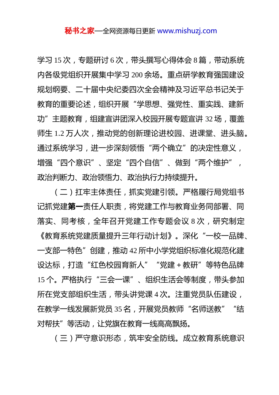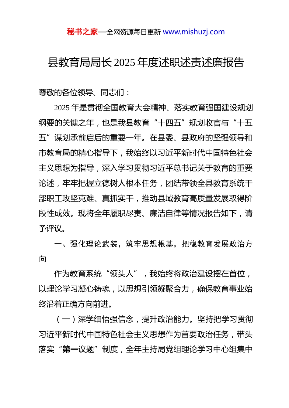 秘书之家—全网资源每日更新 www.mishuzj.com县教育局局长 2025 年度述职述责述廉报告 尊敬的各位领导、同志们:2025 年是贯彻全国教育大会精神、落实教育强国建设规划纲要的关键之年,也是我县教育“十四五”规划收官与“十五五”谋划承前启后的重要一年。在县委、县政府的坚强领导和市教育局的精心指导下,我始终以习近平新时代中国特色社会主义思想为指导,深入学习贯彻习近平总书记关于教育的重要论述,牢牢把握立德树人根本任务,团结带领全县教育系统干部职工攻坚克难、真抓实干,推动县域教育高质量发展取得阶段性成效。现将全年履职尽责、廉洁自律等情况报告如下,请予评议。一、强化理论武装,筑牢思想根基,把稳教育发展政治方向作为教育系统“领头人”,我始终将政治建设摆在首位,以理论学习凝心铸魂,以思想引领凝聚合力,确保教育事业始终沿着正确方向前进。(一)深学细悟强信念,提升政治能力。坚持把学习贯彻习近平新时代中国特色社会主义思想作为首要政治任务,带头落实“第一议题”制度,全年主持局党组理论学习中心组集中秘书之家—全网资源每日更新 www.mishuzj.com学习 15 次,专题研讨 6 次,带头撰写心得体会 8 篇,带动系统内各级党组织开展集中学习 200 余场。重点研学教育强国建设规划纲要、二十届中央纪委四次全会精神及习近平总书记关于教育的重要论述,组织开展“学思想、强党性、重实践、建新功”主题教育,组建宣讲团深入校园开展专题宣讲 32 场,覆盖师生 1.2 万人次,推动党的创新理论进校园、进课堂、进头脑。通过系统学习,进一步深刻领悟“两个确立”的决定性意义,增强“四个意识”、坚定“四个自信”、做到“两个维护”,政治判断力、政治领悟力、政治执行力持续提升。(二)扛牢主体责任,抓实党建引领。严格履行局党组书记抓党建第一责任人职责,将党建工作与教育业务同部署、同落实、同考核,全年召开党建工作专题会议 8 次,研究制定《教育系统党建质量提升三年行动计划》。深化“一校一品牌、一支部一特色”创建,推动 42 所中小学党组织标准化规范化建设达标,打造“红色校园育新人”“党建+教研”等特色品牌15 个。严格执行“三会一课”、组织生活会等制度,带头参加所在党支部组织生活,带头讲党课 4 次。注重党员队伍建设,在教学一线发展新党员 35 名,开展党员教师“名师送教”“结对帮扶”等活动,让党旗在教育一线高高飘扬。(三)严守意识形态,筑牢安全防线。成立教育系统意识秘书之家—全网资源每日更新 www.mishuzj.com形态工作领导小组,定期分析研判意识形态领域形势,全年召开专题研判会 4 次。严格落实意识形态工作责任制,加强校园课堂、网络平台、校园文化等阵地管理,规范教材选用、讲座审批等流程,开展意识形态工作专项督查 3 次,整改问题 12 个。加强网络舆情监测与处置,建立“专人负责、快速响应”机制,全年妥善处置舆情 8 起,确保校园意识形态安全。组织开展“传承红色基因”系列活动,推动党史学习教育融入日常教学,引导师生厚植家国情怀。二、聚焦主责主业,攻坚克难实干,推动教育质量全面提升围绕“办人民满意教育”目标,聚焦教育公平与质量提升核心任务,补短板、强弱项、提质效,各项工作取得突破性进展。(一)优化资源配置,破解“入学难”“择校热”难题。一是扩大公办学位供给。实施“基础教育扩容提质工程”,新建城区义务教育学校 2 所、改扩建农村学校 5 所,新增公办义务教育学位 3200 个;推进公办幼儿园建设,新建公办园 3 所、认定普惠性民办园 6 所,公办园在园幼儿占比提升至 68%,有效缓解“入园难”问题。二是促进城乡教育均衡。深化集团化办学改革,组建 4 个教育集团,覆盖 12 所农村薄弱学校,通过秘书之家—全网资源每日更新 www.mishuzj.com师资共享、课程共建、管理共融,集团内薄弱学校教学质量监测合格率提升 18%。实施“县中振兴计划”,投入专项资金改善县一中办学条件,引进省级名师 3 名,带动高中教学质量稳步提升。三是推进数字化转型。为 38 所农村学校配备智慧课堂设备,建成“专递课堂”平台,实...
