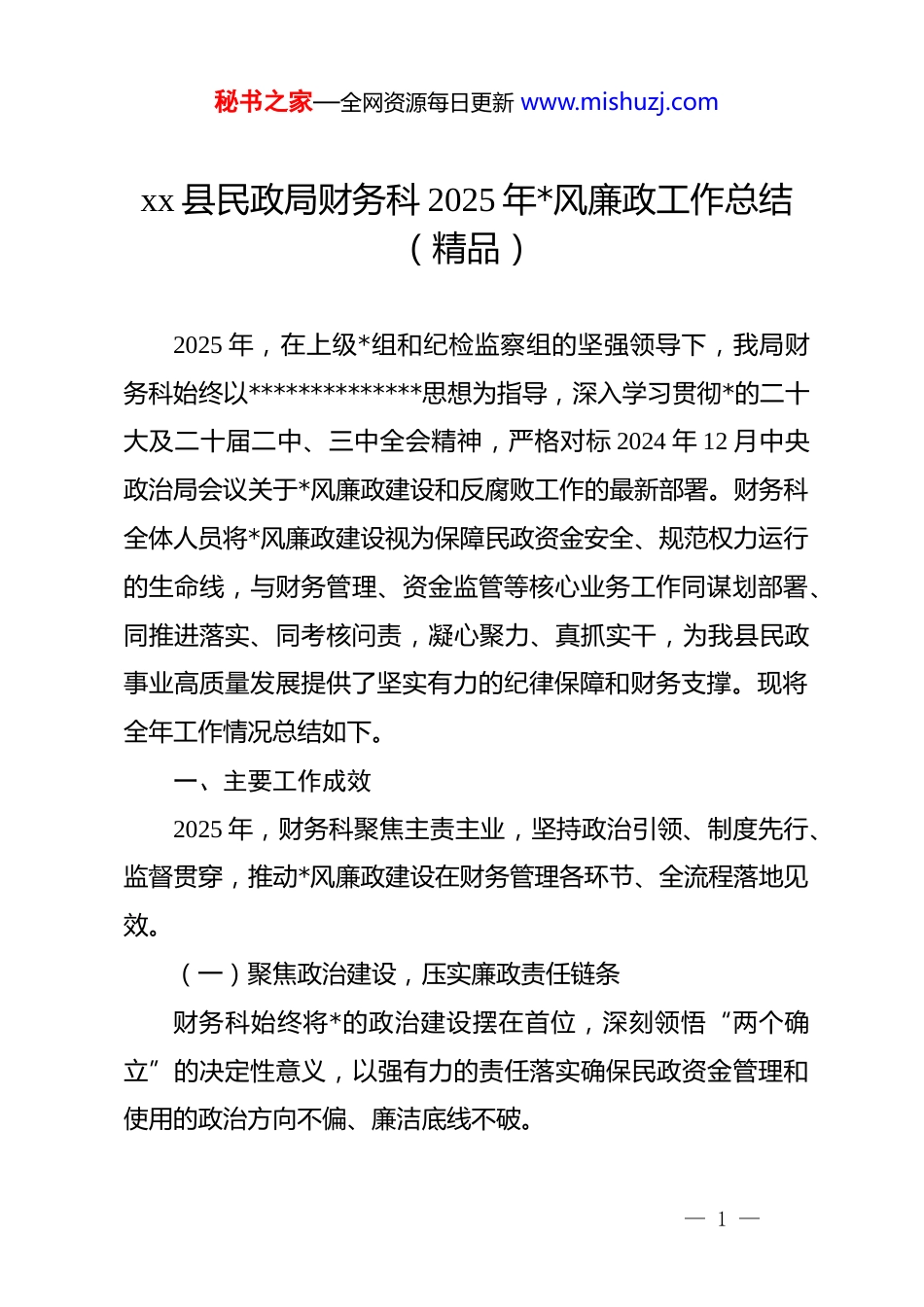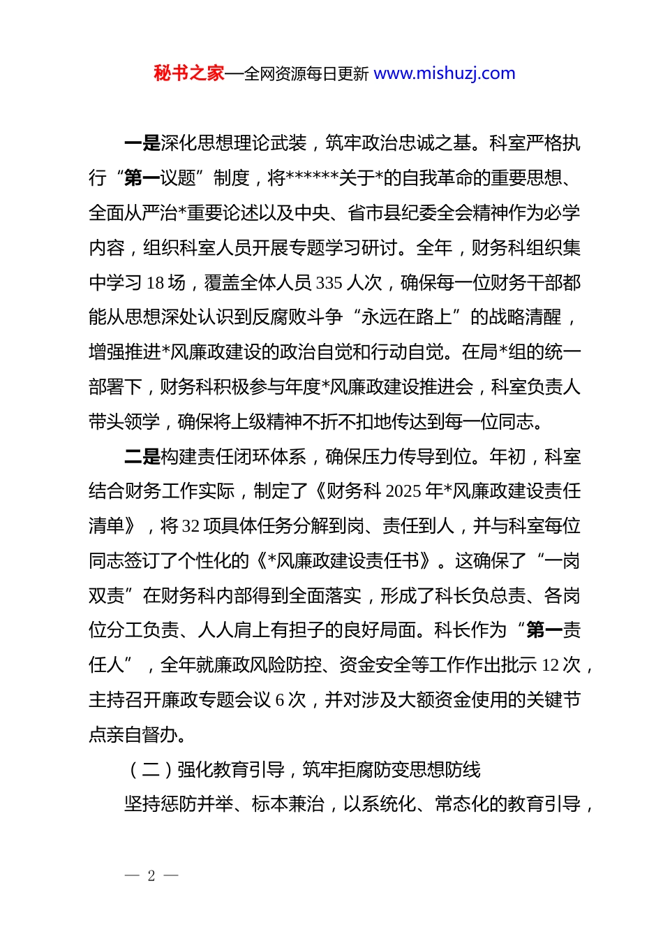 秘书之家—全网资源每日更新 www.mishuzj.comxx 县民政局财务科 2025 年*风廉政工作总结(精品)2025 年,在上级*组和纪检监察组的坚强领导下,我局财务科始终以**************思想为指导,深入学习贯彻*的二十大及二十届二中、三中全会精神,严格对标 2024 年 12 月中央政治局会议关于*风廉政建设和反腐败工作的最新部署。财务科全体人员将*风廉政建设视为保障民政资金安全、规范权力运行的生命线,与财务管理、资金监管等核心业务工作同谋划部署、同推进落实、同考核问责,凝心聚力、真抓实干,为我县民政事业高质量发展提供了坚实有力的纪律保障和财务支撑。现将全年工作情况总结如下。一、主要工作成效2025 年,财务科聚焦主责主业,坚持政治引领、制度先行、监督贯穿,推动*风廉政建设在财务管理各环节、全流程落地见效。(一)聚焦政治建设,压实廉政责任链条财务科始终将*的政治建设摆在首位,深刻领悟“两个确立”的决定性意义,以强有力的责任落实确保民政资金管理和使用的政治方向不偏、廉洁底线不破。— 1 —秘书之家—全网资源每日更新 www.mishuzj.com一是深化思想理论武装,筑牢政治忠诚之基。科室严格执行“第一议题”制度,将******关于*的自我革命的重要思想、全面从严治*重要论述以及中央、省市县纪委全会精神作为必学内容,组织科室人员开展专题学习研讨。全年,财务科组织集中学习 18 场,覆盖全体人员 335 人次,确保每一位财务干部都能从思想深处认识到反腐败斗争“永远在路上”的战略清醒,增强推进*风廉政建设的政治自觉和行动自觉。在局*组的统一部署下,财务科积极参与年度*风廉政建设推进会,科室负责人带头领学,确保将上级精神不折不扣地传达到每一位同志。二是构建责任闭环体系,确保压力传导到位。年初,科室结合财务工作实际,制定了《财务科 2025 年*风廉政建设责任清单》,将 32 项具体任务分解到岗、责任到人,并与科室每位同志签订了个性化的《*风廉政建设责任书》。这确保了“一岗双责”在财务科内部得到全面落实,形成了科长负总责、各岗位分工负责、人人肩上有担子的良好局面。科长作为“第一责任人”,全年就廉政风险防控、资金安全等工作作出批示 12 次,主持召开廉政专题会议 6 次,并对涉及大额资金使用的关键节点亲自督办。(二)强化教育引导,筑牢拒腐防变思想防线坚持惩防并举、标本兼治,以系统化、常态化的教育引导,— 2 —秘书之家—全网资源每日更新 www.mishuzj.com一体推进“不敢腐、不能腐、不想腐”机制在财务领域的深化落实,引导财务干部从思想根源上筑牢拒腐防变的堤坝。一是深化 dj 学习教育,增强纪律规矩意识。以巩固 dj 学习教育成果为抓手,将新修订的《中国共产 dj 律处分条例》等*内法规纳入日常学习核心内容,制定了年度学习计划。通过“三会一课”、专题*课、案例解读等形式,组织财务人员深入学习财经纪律和廉洁从业规定。为检验学习成效,创新开展“线上+线下”结合的纪律知识测试,利用“学习强国”等平台组织线上测试 3 次,并举行线下闭卷考试 1 次,全体人员参与率与合格率均达到 100%。局主要领导为财务科讲授了《严守纪律规矩筑牢廉洁防线》专题*课,引导大家将纪律要求内化于心、外化于行。二是做实警示教育,时刻敲响廉洁警钟。财务科深刻认识到“案例是最好的清醒剂”,全年组织观看了《莫让“微利”遮望眼》《失守的“一把手”》等警示教育片 4 部,重点通报剖析了市内外财政、民政等领域发生的典型违纪违法案例 20 起,特别是对本地查处的 8 起涉及资金管理的基层“微腐败”案件进行了深度解读,用“身边事”警醒“身边人”,达到了触及灵魂的震慑效果。同时,组织科室关键岗位干部赴 xx 县廉政教育基地参观学习 2 次,并旁听了一场职务犯罪案件的庭审,要— 3 —秘书之家—全网资源每日更新 www.mishuzj.com求每人撰写心得体会,共收到心得体会 120 余篇,有效强化了财务人员的廉洁底线意识。(三)擦亮监督“探照灯”,规范财务权力运行财务科始终将监督作为基本职责,聚焦资金管理和权力运行的关键环节,织密织牢内控监督网络,确保*...