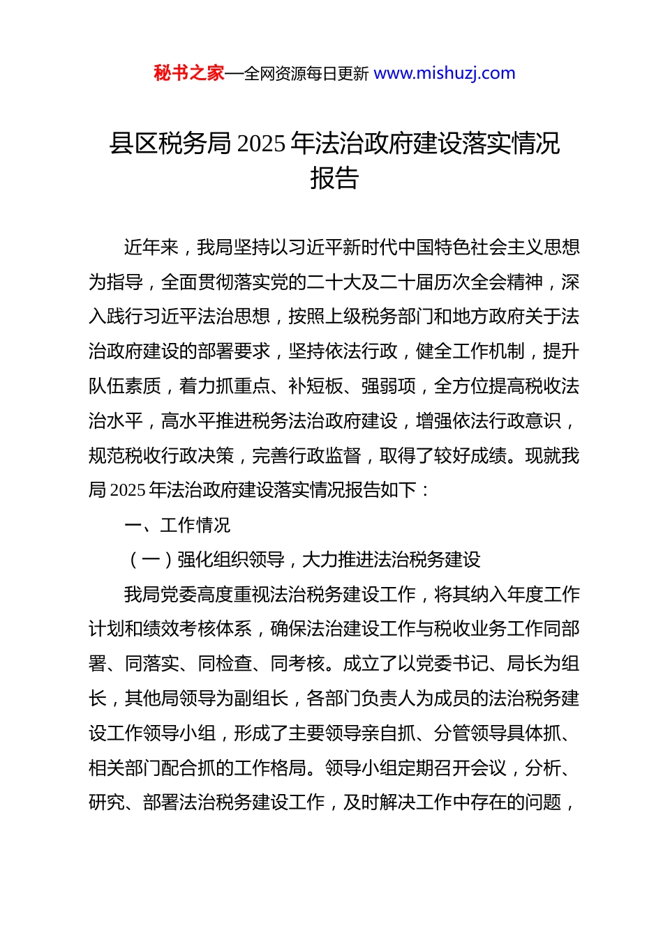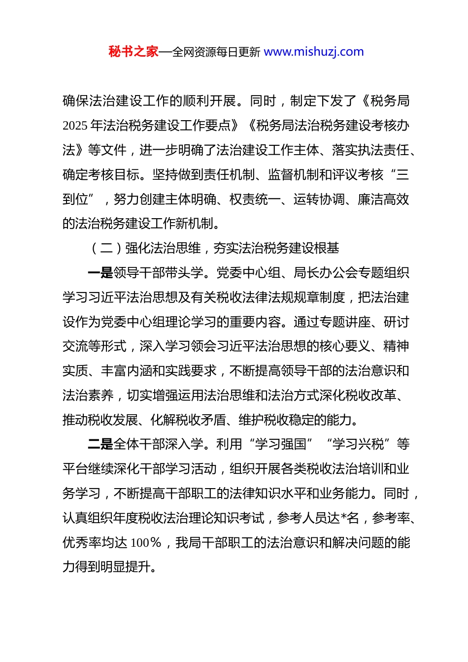 秘书之家—全网资源每日更新 www.mishuzj.com县区税务局 2025 年法治政府建设落实情况报告 近年来,我局坚持以习近平新时代中国特色社会主义思想为指导,全面贯彻落实党的二十大及二十届历次全会精神,深入践行习近平法治思想,按照上级税务部门和地方政府关于法治政府建设的部署要求,坚持依法行政,健全工作机制,提升队伍素质,着力抓重点、补短板、强弱项,全方位提高税收法治水平,高水平推进税务法治政府建设,增强依法行政意识,规范税收行政决策,完善行政监督,取得了较好成绩。现就我局 2025 年法治政府建设落实情况报告如下:一、工作情况(一)强化组织领导,大力推进法治税务建设我局党委高度重视法治税务建设工作,将其纳入年度工作计划和绩效考核体系,确保法治建设工作与税收业务工作同部署、同落实、同检查、同考核。成立了以党委书记、局长为组长,其他局领导为副组长,各部门负责人为成员的法治税务建设工作领导小组,形成了主要领导亲自抓、分管领导具体抓、相关部门配合抓的工作格局。领导小组定期召开会议,分析、研究、部署法治税务建设工作,及时解决工作中存在的问题,秘书之家—全网资源每日更新 www.mishuzj.com确保法治建设工作的顺利开展。同时,制定下发了《税务局2025 年法治税务建设工作要点》《税务局法治税务建设考核办法》等文件,进一步明确了法治建设工作主体、落实执法责任、确定考核目标。坚持做到责任机制、监督机制和评议考核“三到位”,努力创建主体明确、权责统一、运转协调、廉洁高效的法治税务建设工作新机制。(二)强化法治思维,夯实法治税务建设根基一是领导干部带头学。党委中心组、局长办公会专题组织学习习近平法治思想及有关税收法律法规规章制度,把法治建设作为党委中心组理论学习的重要内容。通过专题讲座、研讨交流等形式,深入学习领会习近平法治思想的核心要义、精神实质、丰富内涵和实践要求,不断提高领导干部的法治意识和法治素养,切实增强运用法治思维和法治方式深化税收改革、推动税收发展、化解税收矛盾、维护税收稳定的能力。二是全体干部深入学。利用“学习强国”“学习兴税”等平台继续深化干部学习活动,组织开展各类税收法治培训和业务学习,不断提高干部职工的法律知识水平和业务能力。同时,认真组织年度税收法治理论知识考试,参考人员达*名,参考率、优秀率均达 100%,我局干部职工的法治意识和解决问题的能力得到明显提升。秘书之家—全网资源每日更新 www.mishuzj.com三是税企联动全民学。结合“税收宣传月”“国家宪法日”等特定普法节日,通过举办税收政策宣讲会、开展税法进企业、进学校、进社区等活动,广泛宣传税收法律法规和政策,提高纳税人、缴费人的税法遵从度和依法纳税意识。邀请企业代表、学校师生等走进税务局,开展“体验式”普法活动,让他们亲身体验税收工作流程,增强对税收工作的理解和支持。(三)强化制度建设,全面推进税收依法行政一是重大税收行政决策科学民主。严格落实重大行政决策集体讨论法定程序,对本地区的税收重点问题、难点问题、纳税人缴费人关心的热点问题等重大事项,始终坚持民主集中制,集体讨论决定,杜绝个人意志专断。聘请*律师事务所律师担任我局法律顾问,负责事前征询重大税收政策的制定、审查,重大税务案件的审理、复议,代理税务行政诉讼等方面工作,从程序上防范由于不规范带来的风险和损失,促进了税收决策科学化、民主化、法制化,切实提高决策整体水平。二是税收行政执法严格公正文明。强化税收行政执法证件管理,对全系统*名行政执法人员资格进行重新审查、确认并组织培训,确保行政执法人员全部持证上岗。积极推行行政执法公示制度、执法全过程记录制度、重大执法决定法制审核制度,认真推进行政执法规范化建设。通过税务网站、办税服务厅等秘书之家—全网资源每日更新 www.mishuzj.com渠道,及时准确全面公示税收执法信息,接受社会监督;利用执法记录仪等设备,对执法过程进行全程记录,确保执法过程留痕可溯;建立重大执法决定法制审核机制,对重大税务案件、重大税收政策调整等进行法制审核,确保执法决定合法合规。近年来,...
