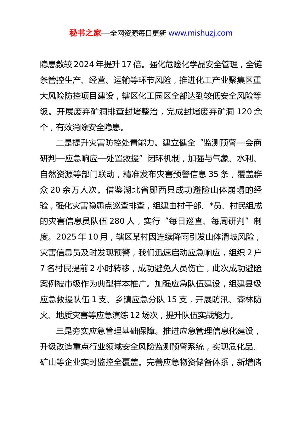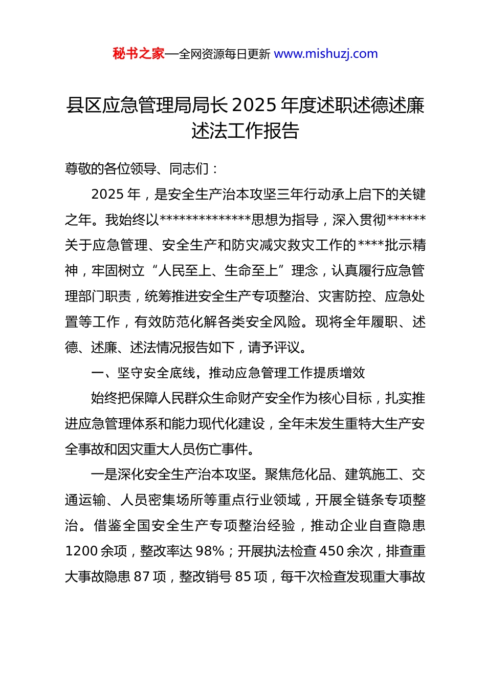 秘书之家—全网资源每日更新 www.mishuzj.com县区应急管理局局长 2025 年度述职述德述廉述法工作报告尊敬的各位领导、同志们:2025 年,是安全生产治本攻坚三年行动承上启下的关键之年。我始终以**************思想为指导,深入贯彻******关于应急管理、安全生产和防灾减灾救灾工作的****批示精神,牢固树立“人民至上、生命至上”理念,认真履行应急管理部门职责,统筹推进安全生产专项整治、灾害防控、应急处置等工作,有效防范化解各类安全风险。现将全年履职、述德、述廉、述法情况报告如下,请予评议。一、坚守安全底线,推动应急管理工作提质增效始终把保障人民群众生命财产安全作为核心目标,扎实推进应急管理体系和能力现代化建设,全年未发生重特大生产安全事故和因灾重大人员伤亡事件。一是深化安全生产治本攻坚。聚焦危化品、建筑施工、交通运输、人员密集场所等重点行业领域,开展全链条专项整治。借鉴全国安全生产专项整治经验,推动企业自查隐患1200 余项,整改率达 98%;开展执法检查 450 余次,排查重大事故隐患 87 项,整改销号 85 项,每千次检查发现重大事故秘书之家—全网资源每日更新 www.mishuzj.com隐患数较 2024 年提升 17 倍。强化危险化学品安全管理,全链条管控生产、经营、运输等环节风险,推进化工产业聚集区重大风险防控项目建设,辖区化工园区全部达到较低安全风险等级。开展废弃矿洞排查封堵整治,完成封堵废弃矿洞 120 余个,有效消除安全隐患。二是提升灾害防控处置能力。建立健全“监测预警—会商研判—应急响应—处置救援”闭环机制,加强与气象、水利、自然资源等部门联动,精准发布灾害预警信息 35 条,覆盖群众 20 余万人次。借鉴湖北省郧西县成功避险山体崩塌的经验,强化灾害隐患点巡查排查,组建由村干部、*员、村民组成的灾害信息员队伍 280 人,实行“每日巡查、每周研判”制度。2025 年 10 月,辖区某村因连续降雨引发山体滑坡风险,灾害信息员及时发现预警,我们迅速启动应急响应,组织 2 户7 名村民提前 2 小时转移,成功避免人员伤亡,此次成功避险案例被市级作为典型样本推广。加强应急队伍建设,组建县级应急救援队伍 1 支、乡镇应急分队 15 支,开展防汛、森林防火、地质灾害等应急演练 12 场次,提升队伍实战能力。三是夯实应急管理基础保障。推进应急管理信息化建设,升级改造重点行业领域安全风险监测预警系统,实现危化品、矿山等企业实时监控全覆盖。完善应急物资储备体系,新增储秘书之家—全网资源每日更新 www.mishuzj.com备帐篷、棉被、应急食品等物资 5000 余件,建立物资储备台账,实行动态管理。加强宣传教育,开展“安全生产月”“防灾减灾日”等主题活动 25 场次,发放宣传资料 8000 余份,开展应急知识培训 30 场次,覆盖群众 5 万余人次,提升群众自救互救能力。二、践行初心使命,涵养务实担当品格始终把品德修养贯穿工作全过程,以良好的政德、公德、私德凝聚干事创业合力。一是坚守对*忠诚的政德。深刻领悟“两个确立”的决定性意义,坚决做到“两个维护”,始终在思想上、政治上、行动上同以***同志为核心的*中央保持高度一致。严格执行民主集中制,重大决策、重要工作部署充分征求意见,集体研究决定,确保决策科学民主。二是践行服务群众的公德。坚持“人民至上、生命至上”,在灾害救援、隐患排查等工作中,始终冲在一线,带头深入受灾现场、企业车间、偏远山村开展工作。全年深入基层调研 18 次,解决企业安全生产难题、群众防灾减灾需求 42件。在灾后重建工作中,主动对接相关部门,帮助受灾群众解决住房修缮、生产恢复等问题 35 件,让群众感受到*和政府的温暖。秘书之家—全网资源每日更新 www.mishuzj.com三是恪守严于律己的私德。注重自身品德修养,带头遵守社会公德、职业道德、家庭美德,自觉抵制不良风气。严格约束亲属和身边工作人员,不利用职权谋取私利,始终保持清正廉洁的良好形象。三、严守纪律底线,营造风清气正环境始终把纪律和规矩挺在前面,严格落实全面从严治*主体责任,扎实推进*风廉政建设。一是压实主体责任。认真履...