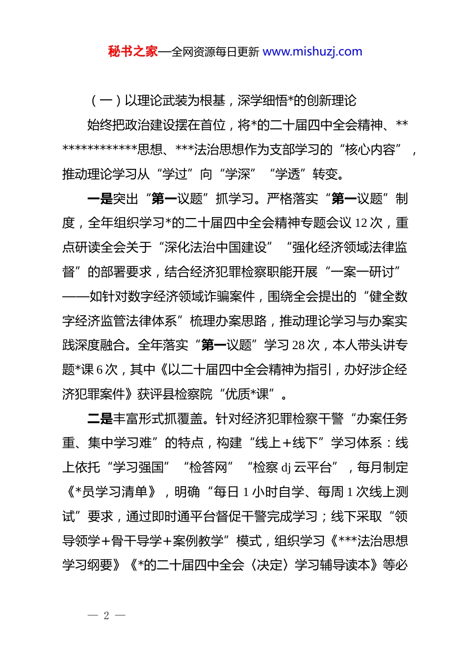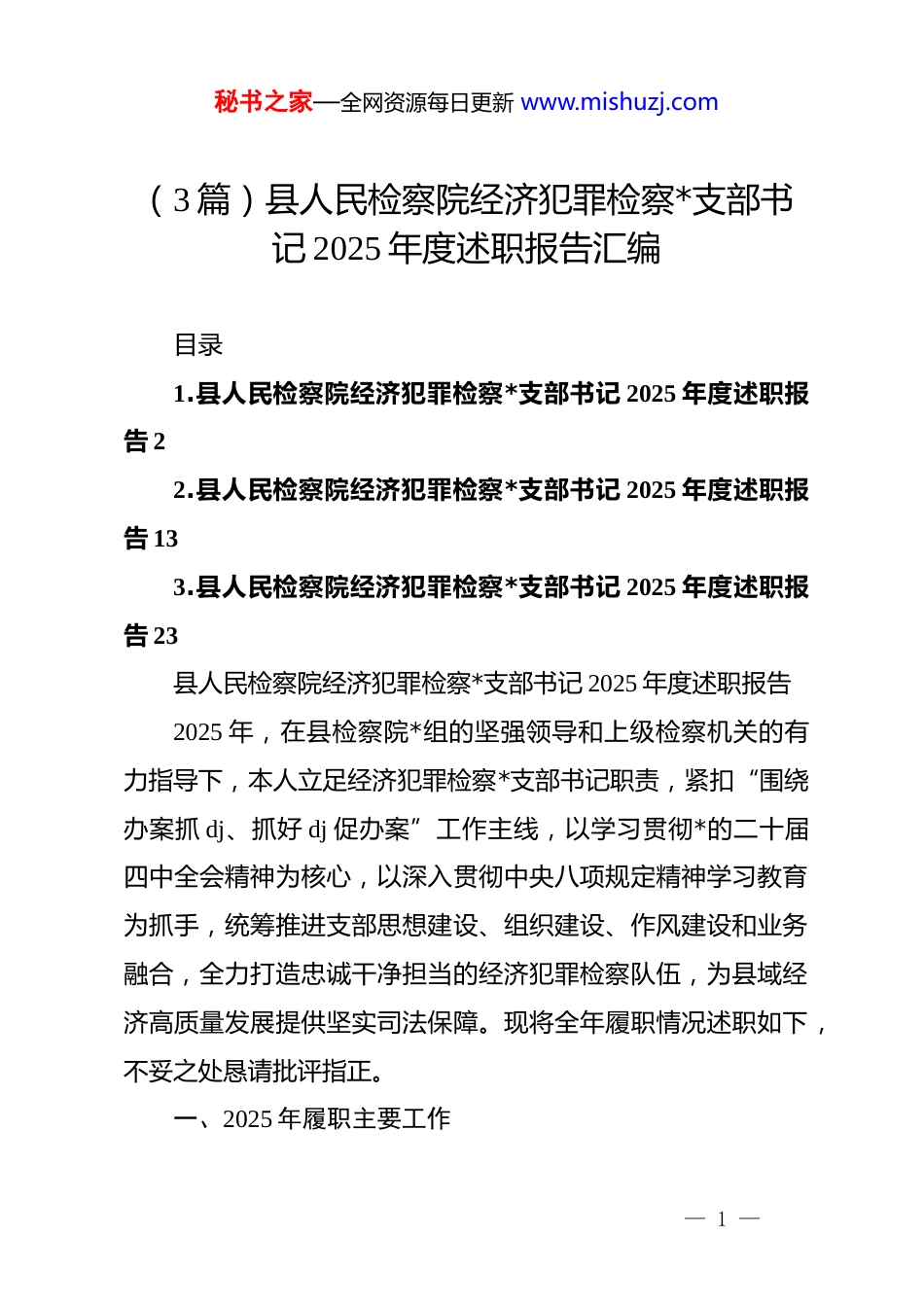 秘书之家—全网资源每日更新 www.mishuzj.com(3 篇)县人民检察院经济犯罪检察*支部书记 2025 年度述职报告汇编目录1.县人民检察院经济犯罪检察*支部书记 2025 年度述职报告 22.县人民检察院经济犯罪检察*支部书记 2025 年度述职报告 133.县人民检察院经济犯罪检察*支部书记 2025 年度述职报告 23县人民检察院经济犯罪检察*支部书记 2025 年度述职报告2025 年,在县检察院*组的坚强领导和上级检察机关的有力指导下,本人立足经济犯罪检察*支部书记职责,紧扣“围绕办案抓 dj、抓好 dj 促办案”工作主线,以学习贯彻*的二十届四中全会精神为核心,以深入贯彻中央八项规定精神学习教育为抓手,统筹推进支部思想建设、组织建设、作风建设和业务融合,全力打造忠诚干净担当的经济犯罪检察队伍,为县域经济高质量发展提供坚实司法保障。现将全年履职情况述职如下,不妥之处恳请批评指正。一、2025 年履职主要工作— 1 —秘书之家—全网资源每日更新 www.mishuzj.com(一)以理论武装为根基,深学细悟*的创新理论始终把政治建设摆在首位,将*的二十届四中全会精神、**************思想、***法治思想作为支部学习的“核心内容”,推动理论学习从“学过”向“学深”“学透”转变。一是突出“第一议题”抓学习。严格落实“第一议题”制度,全年组织学习*的二十届四中全会精神专题会议 12 次,重点研读全会关于“深化法治中国建设”“强化经济领域法律监督”的部署要求,结合经济犯罪检察职能开展“一案一研讨”——如针对数字经济领域诈骗案件,围绕全会提出的“健全数字经济监管法律体系”梳理办案思路,推动理论学习与办案实践深度融合。全年落实“第一议题”学习 28 次,本人带头讲专题*课 6 次,其中《以二十届四中全会精神为指引,办好涉企经济犯罪案件》获评县检察院“优质*课”。二是丰富形式抓覆盖。针对经济犯罪检察干警“办案任务重、集中学习难”的特点,构建“线上+线下”学习体系:线上依托“学习强国”“检答网”“检察 dj 云平台”,每月制定《*员学习清单》,明确“每日 1 小时自学、每周 1 次线上测试”要求,通过即时通平台督促干警完成学习;线下采取“领导领学+骨干导学+案例教学”模式,组织学习《***法治思想学习纲要》《*的二十届四中全会〈决定〉学习辅导读本》等必— 2 —秘书之家—全网资源每日更新 www.mishuzj.com读书目,全年开展集中学习 36 次,覆盖*员干警 100%,确保学习“不漏一人、不落一课”。三是以 zt 教育强担当。结合最高检“深化新时代检察理念教育”要求,开展“学全会精神、促公正司法”zt 教育活动,组织*员干警围绕“如何防范化解经济金融风险”“如何保护民营企业合法权益”等议题开展研讨 8 次,收集合理化建议 23 条;联合县工商联开展“护企安商”专题座谈,邀请企业家代表解读经济政策,引导干警转变司法理念,全年推动 3 起涉企案件适用“合规不起诉”,帮助企业恢复生产,切实将理论学习成果转化为服务经济发展的实效。(二)以从严治*为核心,筑牢廉洁司法防线坚决扛起全面从严治*“第一责任”,以深入贯彻中央八项规定精神学习教育为切入点,紧盯经济犯罪检察领域廉政风险点,构建“教育+监督+防控”三位一体的廉洁建设体系。一是压实责任链条。制定《经济犯罪检察*支部 dj 工作责任清单》,将“*员教育管理、案件廉洁监督、意识形态防控”等 18 项任务细化到岗、明确到人,与支部班子成员、*员干警签订《dj 工作责任书》《廉洁司法承诺书》各 26 份,推动“一岗双责”落地。每月开展责任落实专项检查,针对“学习笔记不规范”“案件文书归档不及时”等 3 类问题,当场下达整改— 3 —秘书之家—全网资源每日更新 www.mishuzj.com通知书,督促限期整改并复核,全年开展责任约谈 10 次,确保dj 责任“不悬空、不虚化”。二是深化作风建设。以深入贯彻中央八项规定精神学习教育为重点,全年开展“作风建设提升月”活动 2 次,组织学习《中央八项规定实施细则(2025 年修订版)》《检察人员廉洁自律若干规定》等文件,观看《零容忍(检察系统篇)》《镜鉴:经济...