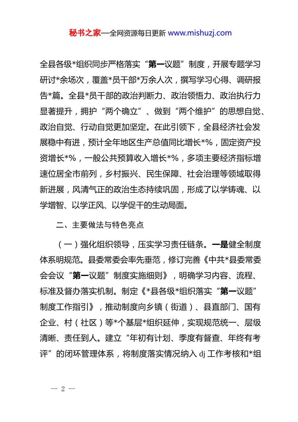 秘书之家—全网资源每日更新 www.mishuzj.com县委 2025 年度“第一议题”制度落实情况的报告2025 年,县委始终将“第一议题”制度作为加强政治建设、筑牢思想根基的首要任务和关键抓手,坚持以**************思想定向领航,确保*中央决策部署及省委、市委工作要求在我县不折不扣落地生根,着力推动理论学习成果转化为深化改革、推动发展、化解矛盾、维护稳定的实际效能,为谱写中国式现代化*实践新篇章提供了坚强思想保证和强大精神动力。现将具体落实情况报告如下:一、落实总体情况与基本成效2025 年,县委常委会坚持将学习******最新重要讲话、****批示精神作为各类会议的首要议题,全年共组织召开常委会会议*次,落实“第一议题”学习*次,传达学习******重要讲话精神、重要论述及中央重要会议、文件精神*项,实现学习常态化、制度化全覆盖。我们着力在深化、内化、转化上下功夫,通过及时学、跟进学、联系实际学,深刻把握蕴含其中的立场观点方法,自觉用以武装头脑、指导实践、推动工作。一年来,— 1 —秘书之家—全网资源每日更新 www.mishuzj.com全县各级*组织同步严格落实“第一议题”制度,开展专题学习研讨*余场次,覆盖*员干部*万余人次,撰写学习心得、调研报告*篇。全县*员干部的政治判断力、政治领悟力、政治执行力显著提升,拥护“两个确立”、做到“两个维护”的思想自觉、政治自觉、行动自觉更加坚定。在此引领下,全县经济社会发展稳中有进,预计全年地区生产总值同比增长*%,固定资产投资增长*%,一般公共预算收入增长*%,多项主要经济指标增速位居全市前列,乡村振兴、民生保障、社会治理等领域取得新进展,风清气正的政治生态持续巩固,形成了以学铸魂、以学增智、以学正风、以学促干的生动局面。二、主要做法与特色亮点(一)强化组织领导,压实学习责任链条。一是健全制度体系明规范。县委常委会率先垂范,修订完善《中共*县委常委会会议“第一议题”制度实施细则》,明确学习内容、流程、标准及督办落实机制。制定《*县各级*组织落实“第一议题”制度工作指引》,推动制度向乡镇(街道)、县直部门、国有企业、村(社区)等*个基层*组织延伸,实现规范统一、层级清晰、责任到人。建立“年初有计划、季度有督查、年终有考评”的闭环管理体系,将制度落实情况纳入 dj 工作考核和*组— 2 —秘书之家—全网资源每日更新 www.mishuzj.com织书记述职评议内容,权重占比不低于*%。二是压实主体责任强担当。明确各级*组织书记为落实“第一议题”制度第一责任人,负责审定学习计划、主持学习研讨、督导学习成效。县委常委会成员严格落实“一岗双责”,结合分管领域工作带头领学、带头研讨、带头调研、带头落实。全年县委主要领导就落实“第一议题”作出批示*次,开展专题调研督导*次,层层传导压力,确保学习责任落到实处。三是强化部门协同聚合力。建立由县委办公室牵头,县委组织部、县委宣传部、县委政研室等部门协同联动的“第一议题”学习服务工作机制。办公室负责议题收集、材料准备、会议组织;宣传部负责理论解读、学习辅导材料编发;组织部负责将学习情况纳入干部教育培训和考核评价体系;政研室负责结合县情开展前瞻性、对策性研究,全年共同编印《“第一议题”学习参考》*期,提供专题解读材料*份,有效提升了学习的系统性和针对性。(二)创新学习形式,提升理论武装质效。一是拓展学习载体求广度。在坚持读原著、学原文、悟原理基础上,积极运用“线上+线下”多种平台载体。线下依托县委理论学习中心组、*大讲堂、专题读书班等,举办高端讲座*场,集中研讨*次。线上利用“学习强国”*学习平台、干部网络学院等,开设“第— 3 —秘书之家—全网资源每日更新 www.mishuzj.com一议题”学习专栏,推送学习资料*余篇,组织线上测试*次,参与*员干部累计*万人次,实现随时随地学、全员覆盖学。二是深化研讨交流挖深度。每次“第一议题”学习后,均安排常委会成员或相关单位负责人结合分管工作和县情实际进行重点发言和交流研讨,全年形成高质量研讨成果*项。创新开展“理论学习+现场教学”模式,结合“四下基层”活动,组织*员干部深入重...