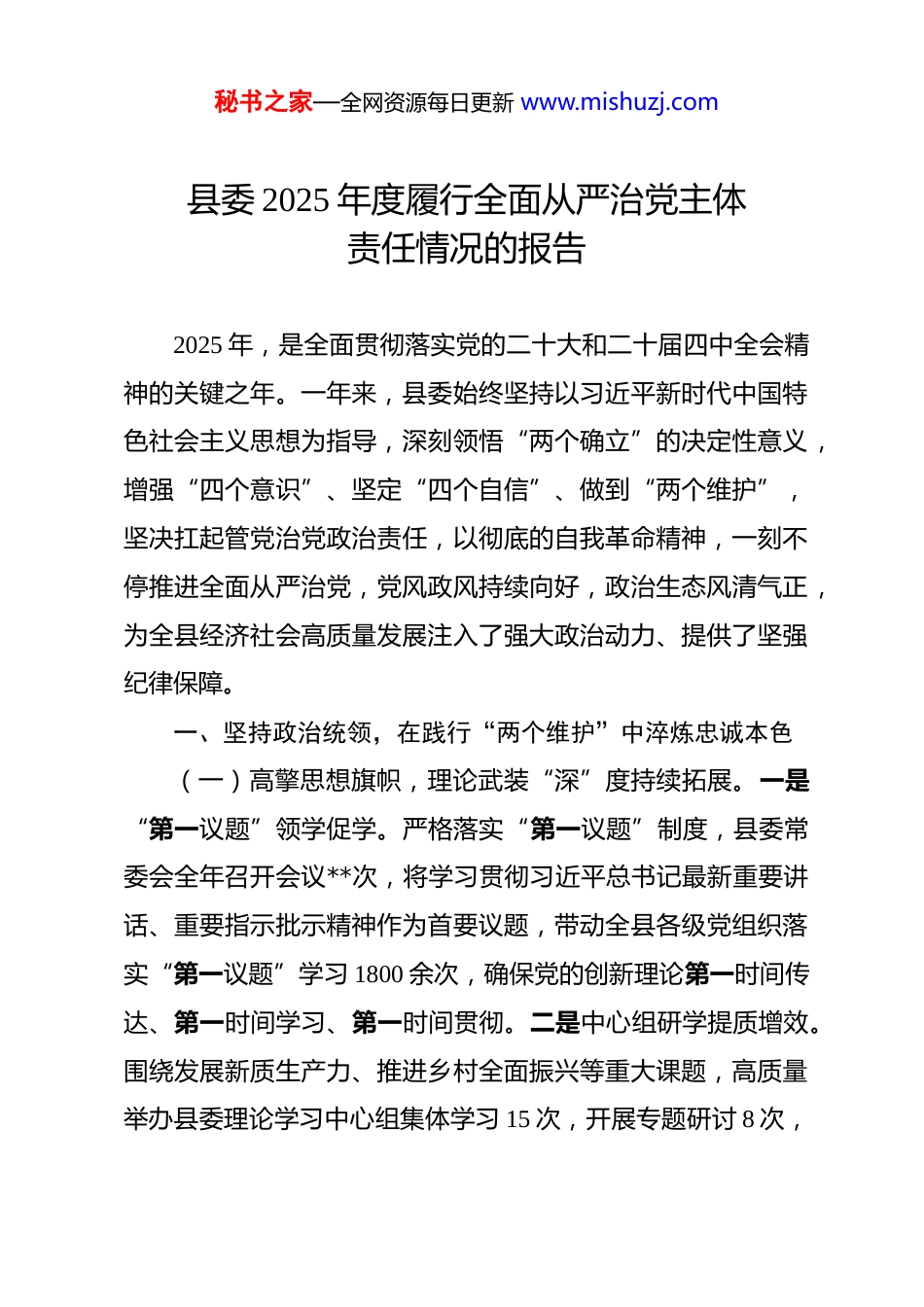 秘书之家—全网资源每日更新 www.mishuzj.com县委 2025 年度履行全面从严治党主体责任情况的报告 2025 年,是全面贯彻落实党的二十大和二十届四中全会精神的关键之年。一年来,县委始终坚持以习近平新时代中国特色社会主义思想为指导,深刻领悟“两个确立”的决定性意义,增强“四个意识”、坚定“四个自信”、做到“两个维护”,坚决扛起管党治党政治责任,以彻底的自我革命精神,一刻不停推进全面从严治党,党风政风持续向好,政治生态风清气正,为全县经济社会高质量发展注入了强大政治动力、提供了坚强纪律保障。一、坚持政治统领,在践行“两个维护”中淬炼忠诚本色(一)高擎思想旗帜,理论武装“深”度持续拓展。一是“第一议题”领学促学。严格落实“第一议题”制度,县委常委会全年召开会议**次,将学习贯彻习近平总书记最新重要讲话、重要指示批示精神作为首要议题,带动全县各级党组织落实“第一议题”学习 1800 余次,确保党的创新理论第一时间传达、第一时间学习、第一时间贯彻。二是中心组研学提质增效。围绕发展新质生产力、推进乡村全面振兴等重大课题,高质量举办县委理论学习中心组集体学习 15 次,开展专题研讨 8 次,秘书之家—全网资源每日更新 www.mishuzj.com班子成员带头撰写心得体会、调研报告 30 余篇,切实将学习成果转化为谋划发展的思路、推动工作的举措。三是主题教育固本培元。巩固拓展学习贯彻习近平新时代中国特色社会主义思想主题教育成果,建立长效化学习机制。依托县委党校主阵地,举办科级干部、中青年干部、村(社区)党组织书记等各类培训班 25 期,培训党员干部 6000 余人次,推动党的创新理论入脑入心、铸魂育人。(二)严明政治纪律,政治监督“精”度不断提升。一是聚焦“国之大者”强化监督。紧紧围绕习近平总书记重要指示批示和党中央重大决策部署,建立专项督查、跟踪问效、限时办结、定期“回头看”的闭环落实机制。全年开展粮食安全、生态环保、耕地保护等专项政治监督 12 轮次,发现并推动整改问题 115 个,确保政令畅通、令行禁止。二是聚焦中心任务精准监督。将全面从严治党要求融入全县发展大局,紧盯“百千万工程”、重大项目建设、营商环境优化等重点工作,跟进监督、保障执行。查处在项目推进中不担当、不作为、慢作为问题 28 起,处理 35 人,为高质量发展保驾护航。三是聚焦“关键少数”从严监督。加强对各级“一把手”和领导班子的监督,制定出台《关于加强对“一把手”和领导班子监督的若干措施》,建立健全政治生态分析研判机制,对全县 58 个县直单位、秘书之家—全网资源每日更新 www.mishuzj.com12 个乡镇(街道)的“一把手”开展政治画像,做实做细日常监督。(三)净化政治生态,党内生活“硬”度显著增强。一是严肃党内政治生活。严格执行新形势下党内政治生活的若干准则,高质量召开年度民主生活会和专题民主生活会,县委常委班子带头查摆问题 150 余条,开展批评与自我批评见人见事见思想。严格执行双重组织生活制度,县委常委同志均以普通党员身份参加所在支部组织生活,以上率下带动全县党内政治生活严起来、实起来。二是严格执行民主集中制。修订完善县委工作规则和常委会议事规则,对“三重一大”事项坚持集体领导、民主集中、个别酝酿、会议决定。全年县委常委会研究重大议题 210 项,均严格履行决策程序,班子的凝聚力、战斗力进一步增强。三是发展积极健康的党内政治文化。深入挖掘本地红色资源,建成党性教育基地 3 个,组织党员干部接受红色教育 2 万余人次。大力弘扬忠诚老实、公道正派、实事求是、清正廉洁的价值观,旗帜鲜明反对和抵制关系学、厚黑学、官场术等庸俗腐朽文化侵蚀。二、坚持强基固本,在锻造过硬队伍中筑牢战斗堡垒(一)树立鲜明导向,干部队伍“选育管用”协同发力。一是突出政治标准选干部。坚持把政治标准放在第一位,出台秘书之家—全网资源每日更新 www.mishuzj.com《县管干部政治素质考察办法》,建立干部政治表现负面清单。全年提拔重用干部 85 名,其中 80%以上安排在改革发展稳定一线和关键吃劲岗位,坚决不用政治上不合格...