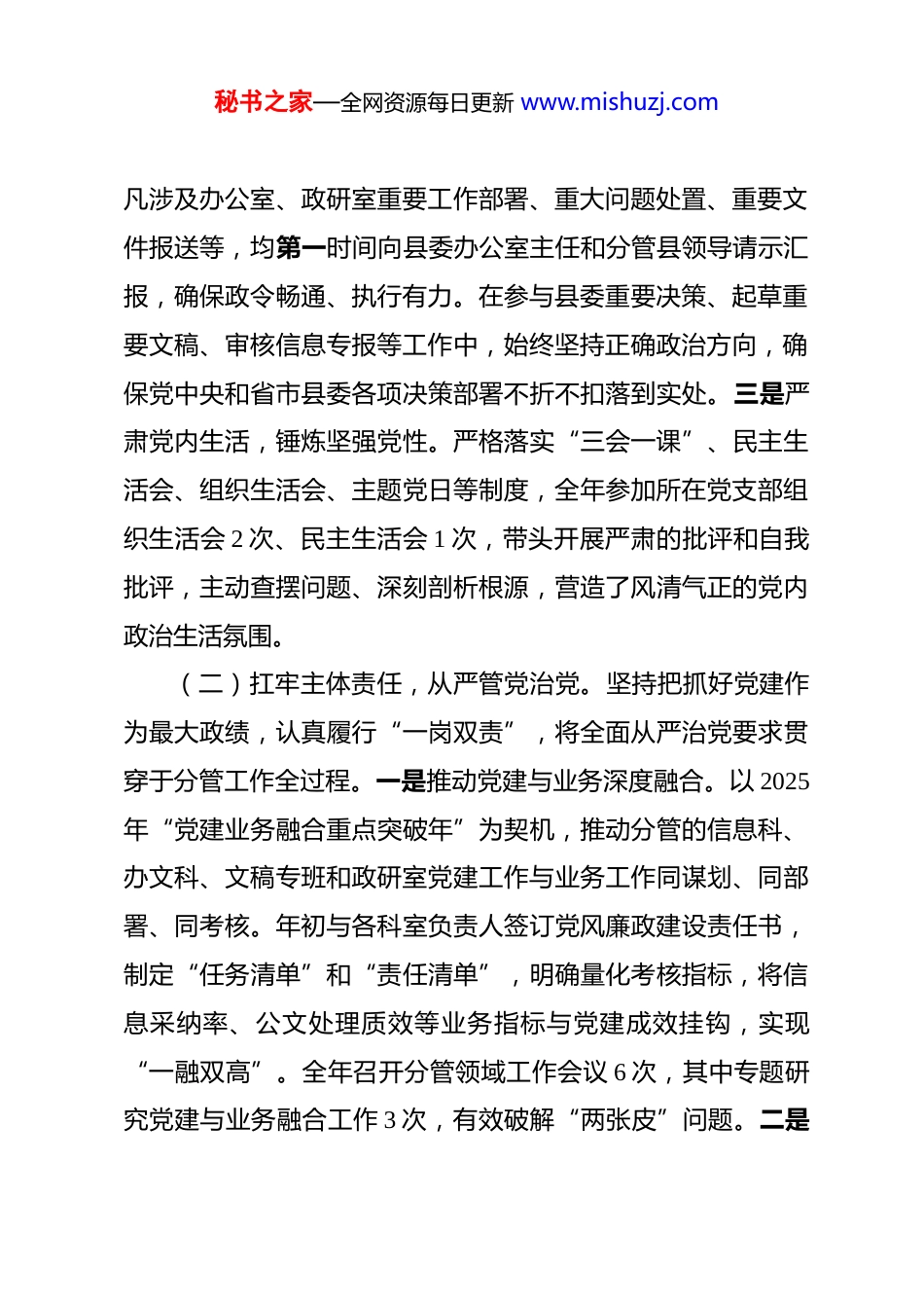 秘书之家—全网资源每日更新 www.mishuzj.com县委办副主任 2025 年度述责述廉报告 根据*县委统一安排,现将本人 2025 年度履行管党治党责任和廉洁自律情况报告如下。一、主要工作及成效2025 年是实施“十五五”规划的关键之年,本人在县委的坚强领导下,在县委办公室班子的团结带领下,始终坚持以习近平新时代中国特色社会主义思想为指导,恪尽职守,勤勉履职,圆满完成了各项分管工作任务,现将主要情况报告如下。(一)坚守政治忠诚,严守纪律规矩。始终将政治建设摆在首位,深刻领悟“两个确立”的决定性意义,坚决做到“两个维护”,不断提高政治判断力、政治领悟力、政治执行力。一是强化理论武装,筑牢思想根基。坚持将学习贯彻习近平新时代中国特色社会主义思想作为首要政治任务,带头深入学习党的二十届三中、四中全会精神和“十五五”规划建议,系统研读《习近平关于加强党的作风建设论述摘编》等重要文献。全年参加县委理论学习中心组学习 12 次,牵头组织分管科室开展集中学习 20 余次,撰写学习心得 8 篇,在所在党支部讲授专题党课 2 次,确保党的创新理论入脑入心、指导实践。二是严守政治纪律,做到令行禁止。严格执行重大事项请示报告制度,秘书之家—全网资源每日更新 www.mishuzj.com凡涉及办公室、政研室重要工作部署、重大问题处置、重要文件报送等,均第一时间向县委办公室主任和分管县领导请示汇报,确保政令畅通、执行有力。在参与县委重要决策、起草重要文稿、审核信息专报等工作中,始终坚持正确政治方向,确保党中央和省市县委各项决策部署不折不扣落到实处。三是严肃党内生活,锤炼坚强党性。严格落实“三会一课”、民主生活会、组织生活会、主题党日等制度,全年参加所在党支部组织生活会 2 次、民主生活会 1 次,带头开展严肃的批评和自我批评,主动查摆问题、深刻剖析根源,营造了风清气正的党内政治生活氛围。(二)扛牢主体责任,从严管党治党。坚持把抓好党建作为最大政绩,认真履行“一岗双责”,将全面从严治党要求贯穿于分管工作全过程。一是推动党建与业务深度融合。以 2025年“党建业务融合重点突破年”为契机,推动分管的信息科、办文科、文稿专班和政研室党建工作与业务工作同谋划、同部署、同考核。年初与各科室负责人签订党风廉政建设责任书,制定“任务清单”和“责任清单”,明确量化考核指标,将信息采纳率、公文处理质效等业务指标与党建成效挂钩,实现“一融双高”。全年召开分管领域工作会议 6 次,其中专题研究党建与业务融合工作 3 次,有效破解“两张皮”问题。二是秘书之家—全网资源每日更新 www.mishuzj.com建强干部队伍,激发干事活力。坚持把思想政治建设贯穿队伍建设始终,组织分管科室干部开展政治能力和业务技能培训 4次,着力提升“提笔能写、开口能讲、遇事能办”的综合素质。关心干部成长,推荐 2 名优秀年轻干部参加上级调训,为办公室事业发展储备后备力量。三是强化日常管理,体现严管厚爱。严格执行考勤、请销假等制度,坚持抓早抓小、防微杜渐。全年与分管科室干部开展谈心谈话 20 余人次,及时掌握思想动态,帮助解决实际困难 5 个,营造了团结紧张、严肃活泼的工作氛围。(三)聚焦廉政建设,筑牢反腐防线。始终把党风廉政建设作为分内之事、应尽之责,一体推进不敢腐、不能腐、不想腐,营造风清气正的政治生态。一是深化警示教育。组织分管科室干部深入学习《中国共产党纪律处分条例》,集中观看警示教育片 2 部,参加县纪委监委组织的廉政教育活动 3 次,以案为鉴、以案明纪,引导干部知敬畏、存戒惧、守底线。二是创新监督手段。顺应数字化治理趋势,积极探索“AI+廉政提醒”工作模式,在办文、办会、信息报送等关键环节梳理廉政风险点 20 余个,并引入智能预警模型进行动态监测。通过系统自动生成的个性化廉政风险提示单,对关键岗位人员进行精准提醒,全年共生成廉政提醒 200 余条,实现监督关口前移。三秘书之家—全网资源每日更新 www.mishuzj.com是持续改进作风。带头落实中央八项规定及其实施细则精神,坚决整治形式主义、官僚主义。牵头优化公文处理流...