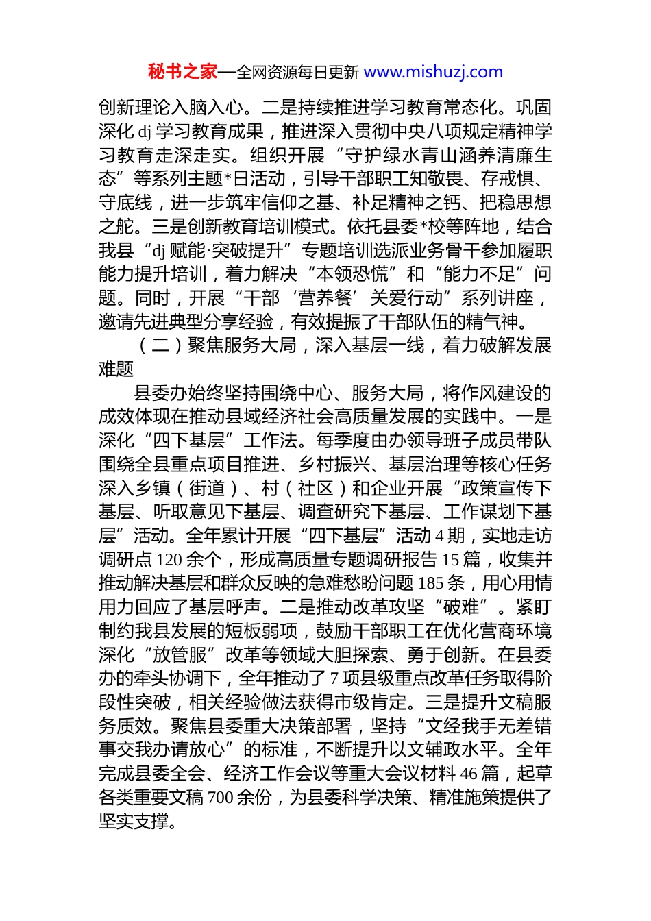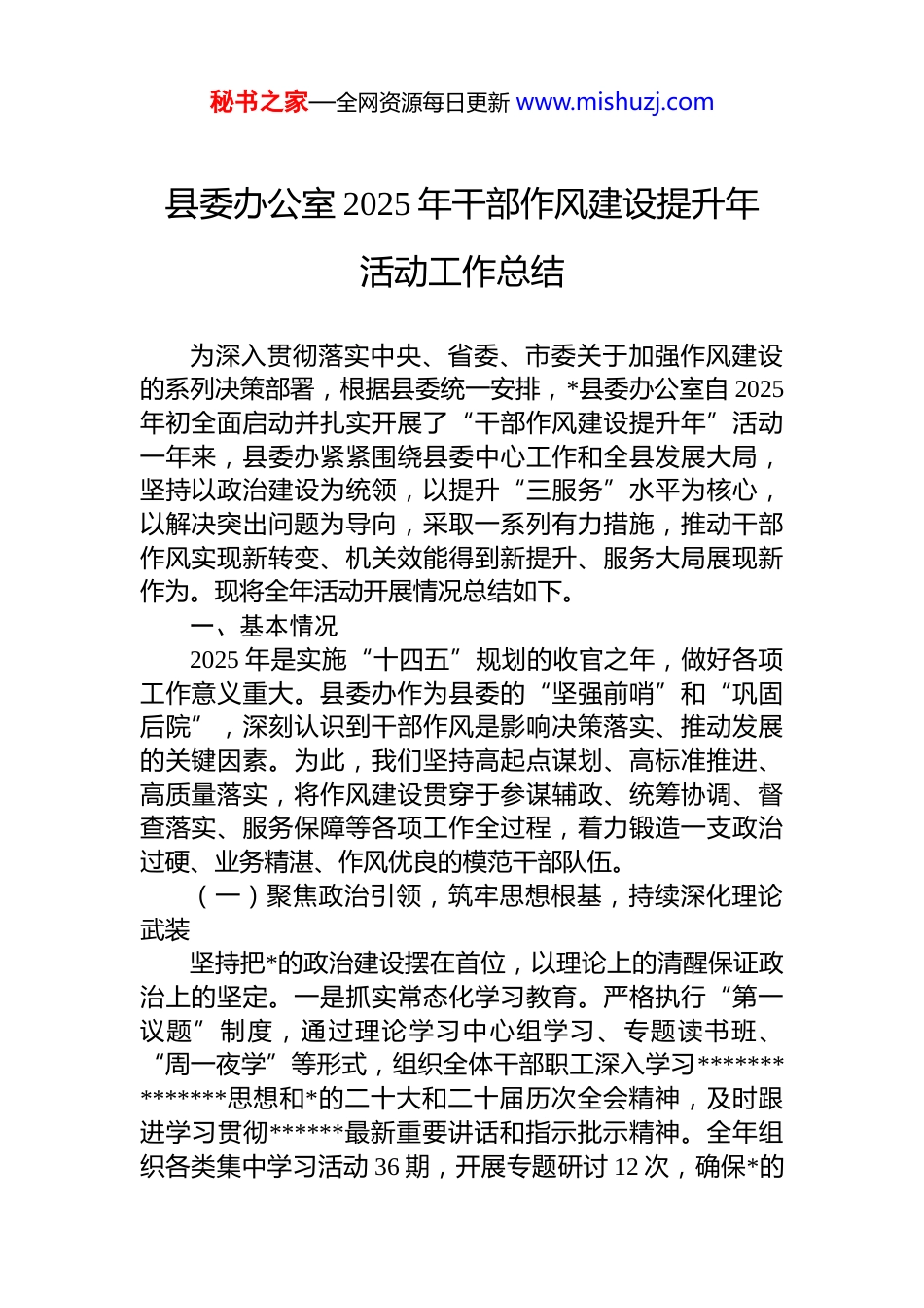 秘书之家—全网资源每日更新 www.mishuzj.com县委办公室 2025 年干部作风建设提升年活动工作总结为深入贯彻落实中央、省委、市委关于加强作风建设的系列决策部署,根据县委统一安排,*县委办公室自 2025年初全面启动并扎实开展了“干部作风建设提升年”活动一年来,县委办紧紧围绕县委中心工作和全县发展大局,坚持以政治建设为统领,以提升“三服务”水平为核心,以解决突出问题为导向,采取一系列有力措施,推动干部作风实现新转变、机关效能得到新提升、服务大局展现新作为。现将全年活动开展情况总结如下。一、基本情况2025 年是实施“十四五”规划的收官之年,做好各项工作意义重大。县委办作为县委的“坚强前哨”和“巩固后院”,深刻认识到干部作风是影响决策落实、推动发展的关键因素。为此,我们坚持高起点谋划、高标准推进、高质量落实,将作风建设贯穿于参谋辅政、统筹协调、督查落实、服务保障等各项工作全过程,着力锻造一支政治过硬、业务精湛、作风优良的模范干部队伍。(一)聚焦政治引领,筑牢思想根基,持续深化理论武装坚持把*的政治建设摆在首位,以理论上的清醒保证政治上的坚定。一是抓实常态化学习教育。严格执行“第一议题”制度,通过理论学习中心组学习、专题读书班、“周一夜学”等形式,组织全体干部职工深入学习**************思想和*的二十大和二十届历次全会精神,及时跟进学习贯彻******最新重要讲话和指示批示精神。全年组织各类集中学习活动 36 期,开展专题研讨 12 次,确保*的秘书之家—全网资源每日更新 www.mishuzj.com创新理论入脑入心。二是持续推进学习教育常态化。巩固深化 dj 学习教育成果,推进深入贯彻中央八项规定精神学习教育走深走实。组织开展“守护绿水青山涵养清廉生态”等系列主题*日活动,引导干部职工知敬畏、存戒惧、守底线,进一步筑牢信仰之基、补足精神之钙、把稳思想之舵。三是创新教育培训模式。依托县委*校等阵地,结合我县“dj 赋能·突破提升”专题培训选派业务骨干参加履职能力提升培训,着力解决“本领恐慌”和“能力不足”问题。同时,开展“干部‘营养餐’关爱行动”系列讲座,邀请先进典型分享经验,有效提振了干部队伍的精气神。(二)聚焦服务大局,深入基层一线,着力破解发展难题县委办始终坚持围绕中心、服务大局,将作风建设的成效体现在推动县域经济社会高质量发展的实践中。一是深化“四下基层”工作法。每季度由办领导班子成员带队围绕全县重点项目推进、乡村振兴、基层治理等核心任务深入乡镇(街道)、村(社区)和企业开展“政策宣传下基层、听取意见下基层、调查研究下基层、工作谋划下基层”活动。全年累计开展“四下基层”活动 4 期,实地走访调研点 120 余个,形成高质量专题调研报告 15 篇,收集并推动解决基层和群众反映的急难愁盼问题 185 条,用心用情用力回应了基层呼声。二是推动改革攻坚“破难”。紧盯制约我县发展的短板弱项,鼓励干部职工在优化营商环境深化“放管服”改革等领域大胆探索、勇于创新。在县委办的牵头协调下,全年推动了 7 项县级重点改革任务取得阶段性突破,相关经验做法获得市级肯定。三是提升文稿服务质效。聚焦县委重大决策部署,坚持“文经我手无差错事交我办请放心”的标准,不断提升以文辅政水平。全年完成县委全会、经济工作会议等重大会议材料 46 篇,起草各类重要文稿 700 余份,为县委科学决策、精准施策提供了坚实支撑。秘书之家—全网资源每日更新 www.mishuzj.com(三)聚焦效能提升,严格监督管理,锻造勤廉双优模范机关坚持向管理要效能、向纪律要战力,不断完善内部管理机制,推动机关运行提速增效。一是强化制度刚性执行修订完善了考勤管理、会议管理、公文办理、**工作等 12项内部管理制度,并将其执行情况纳入干部日常考核。通过“线上+线下”相结合的方式,利用信息化手段加强对干部在岗履职情况的监督,有效杜绝了“庸懒散慢浮混”等现象。二是常态化开展效能督查。办机关纪委牵头,定期不定期对干部上下班纪律、值班值守、办公秩序等情况进行明察暗访。全年开展机关效能专项检查 16 次,对发现的问题及时通...
