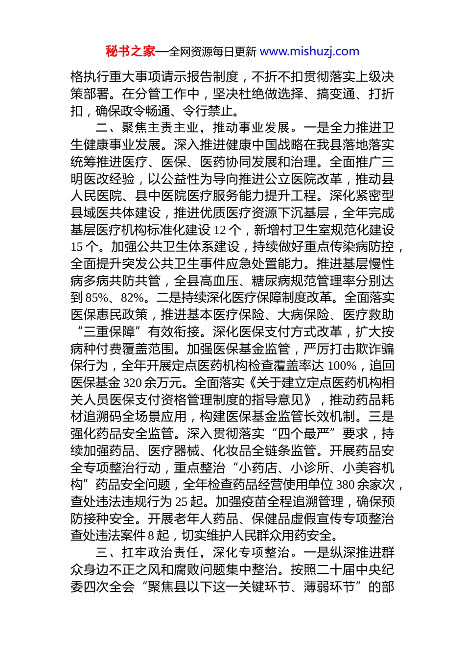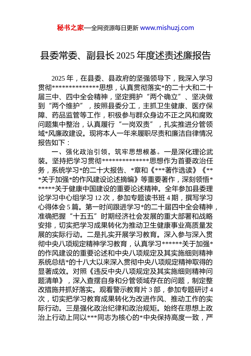 秘书之家—全网资源每日更新 www.mishuzj.com县委常委、副县长 2025 年度述责述廉报告2025 年,在县委、县政府的坚强领导下,我深入学习贯彻**************思想,认真贯彻落实*的二十大和二十届三中、四中全会精神,坚定拥护“两个确立”、坚决做到“两个维护”,按照县委分工,主抓卫生健康、医疗保障、药品监管等工作,积极参与群众身边不正之风和腐败问题集中整治,认真履行“一岗双责”,扎实推进分管领域*风廉政建设。现将本人一年来履职尽责和廉洁自律情况报告如下:一、强化政治引领,筑牢思想根基。一是深化理论武装。坚持把学习贯彻**************思想作为首要政治任务,系统学习*的二十大报告、*章和《***著作选读》《***关于加强*的作风建设论述摘编》等重要著作,深刻领悟******关于健康中国建设的重要论述精神。全年参加县委理论学习中心组学习 12 次,参加专题读书班 4 期,撰写学习心得体会 5 篇。第一时间跟进学习*的二十届四中全会精神,准确把握“十五五”时期经济社会发展的重大部署和战略安排,切实把学习成果转化为推动卫生健康事业高质量发展的实际行动。二是扎实开展学习教育。深入参与深入贯彻中央八项规定精神学习教育,认真学习******关于加强*的作风建设的重要论述和中央八项规定及其实施细则精神系统总结*的十八大以来深入贯彻中央八项规定精神取得的显著成效。对照《违反中央八项规定及其实施细则精神问题清单》,深入查摆自身和分管领域存在的问题,制定整改措施并抓好落实。观看警示教育片 3 部,参加专题研讨 4次,切实把学习教育成果转化为改进作风、推动工作的实际行动。三是强化政治纪律和政治规矩。始终在思想上政治上行动上同以***同志为核心的*中央保持高度一致,严秘书之家—全网资源每日更新 www.mishuzj.com格执行重大事项请示报告制度,不折不扣贯彻落实上级决策部署。在分管工作中,坚决杜绝做选择、搞变通、打折扣,确保政令畅通、令行禁止。二、聚焦主责主业,推动事业发展。一是全力推进卫生健康事业发展。深入推进健康中国战略在我县落地落实统筹推进医疗、医保、医药协同发展和治理。全面推广三明医改经验,以公益性为导向推进公立医院改革,推动县人民医院、县中医院医疗服务能力提升工程。深化紧密型县域医共体建设,推进优质医疗资源下沉基层,全年完成基层医疗机构标准化建设 12 个,新增村卫生室规范化建设15 个。加强公共卫生体系建设,持续做好重点传染病防控,全面提升突发公共卫生事件应急处置能力。推进基层慢性病多病共防共管,全县高血压、糖尿病规范管理率分别达到 85%、82%。二是持续深化医疗保障制度改革。全面落实医保惠民政策,推进基本医疗保险、大病保险、医疗救助“三重保障”有效衔接。深化医保支付方式改革,扩大按病种付费覆盖范围。加强医保基金监管,严厉打击欺诈骗保行为,全年开展定点医药机构检查覆盖率达 100%,追回医保基金 320 余万元。全面落实《关于建立定点医药机构相关人员医保支付资格管理制度的指导意见》,推动药品耗材追溯码全场景应用,构建医保基金监管长效机制。三是强化药品安全监管。深入贯彻落实“四个最严”要求,持续加强药品、医疗器械、化妆品全链条监管。开展药品安全专项整治行动,重点整治“小药店、小诊所、小美容机构”药品安全问题,全年检查药品经营使用单位 380 余家次,查处违法违规行为 25 起。加强疫苗全程追溯管理,确保预防接种安全。开展老年人药品、保健品虚假宣传专项整治查处违法案件 8 起,切实维护人民群众用药安全。三、扛牢政治责任,深化专项整治。一是纵深推进群众身边不正之风和腐败问题集中整治。按照二十届中央纪委四次全会“聚焦县以下这一关键环节、薄弱环节”的部秘书之家—全网资源每日更新 www.mishuzj.com署要求,把整治群众身边不正之风和腐败问题作为重要政治任务,坚持“群众点题、部门答题、纪委监督、社会评价”工作机制,聚焦分管领域群众反映强烈的痛点难点问题,扎实开展专项整治。二是深入整治医保基金管理突出问题。把医保基金监管作为专项整治重点,紧盯定点医疗机构、定点零售药店、职业骗保人,严厉...
