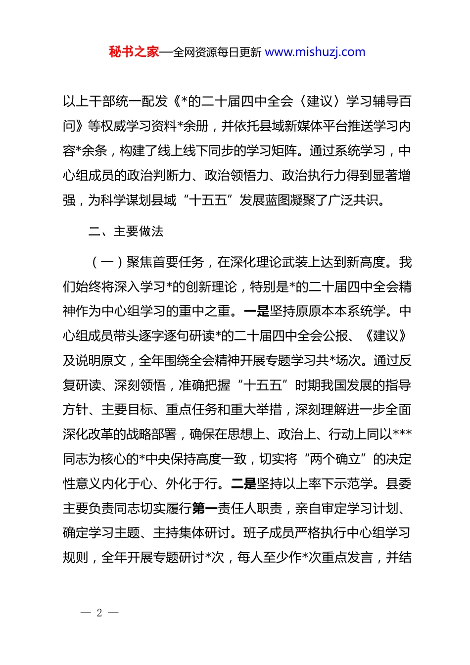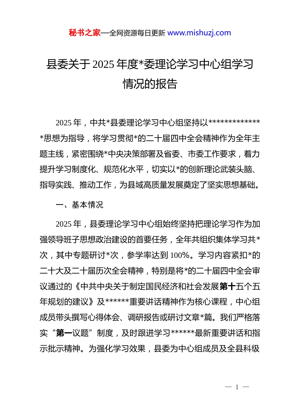 秘书之家—全网资源每日更新 www.mishuzj.com县委关于 2025 年度*委理论学习中心组学习情况的报告2025 年,中共*县委理论学习中心组坚持以**************思想为指导,将学习贯彻*的二十届四中全会精神作为全年主题主线,紧密围绕*中央决策部署及省委、市委工作要求,着力提升学习制度化、规范化水平,切实以*的创新理论武装头脑、指导实践、推动工作,为县域高质量发展奠定了坚实思想基础。一、基本情况2025 年,县委理论学习中心组始终坚持把理论学习作为加强领导班子思想政治建设的首要任务,全年共组织集体学习共*次,其中专题研讨*次,参学率达到 100%。学习内容紧扣*的二十大及二十届历次全会精神,特别是将*的二十届四中全会审议通过的《中共中央关于制定国民经济和社会发展第十五个五年规划的建议》及******重要讲话精神作为核心课程,中心组成员带头撰写心得体会、调研报告或研讨文章*篇。我们严格落实“第一议题”制度,及时跟进学习******最新重要讲话和指示批示精神。为强化学习效果,县委为中心组成员及全县科级— 1 —秘书之家—全网资源每日更新 www.mishuzj.com以上干部统一配发《*的二十届四中全会〈建议〉学习辅导百问》等权威学习资料*余册,并依托县域新媒体平台推送学习内容*余条,构建了线上线下同步的学习矩阵。通过系统学习,中心组成员的政治判断力、政治领悟力、政治执行力得到显著增强,为科学谋划县域“十五五”发展蓝图凝聚了广泛共识。二、主要做法(一)聚焦首要任务,在深化理论武装上达到新高度。我们始终将深入学习*的创新理论,特别是*的二十届四中全会精神作为中心组学习的重中之重。一是坚持原原本本系统学。中心组成员带头逐字逐句研读*的二十届四中全会公报、《建议》及说明原文,全年围绕全会精神开展专题学习共*场次。通过反复研读、深刻领悟,准确把握“十五五”时期我国发展的指导方针、主要目标、重点任务和重大举措,深刻理解进一步全面深化改革的战略部署,确保在思想上、政治上、行动上同以***同志为核心的*中央保持高度一致,切实将“两个确立”的决定性意义内化于心、外化于行。二是坚持以上率下示范学。县委主要负责同志切实履行第一责任人职责,亲自审定学习计划、确定学习主题、主持集体研讨。班子成员严格执行中心组学习规则,全年开展专题研讨*次,每人至少作*次重点发言,并结— 2 —秘书之家—全网资源每日更新 www.mishuzj.com合分管领域工作撰写高质量调研报告*篇,示范带动全县各级*委(*组)理论学习中心组开展专题学习共**余场次,形成了“关键少数”领头学、广大干部跟进学的生动局面。三是坚持联系实际深入学。大力弘扬理论联系实际的马克思主义学风,将学习贯彻*的二十届四中全会精神与谋划*县“十五五”发展紧密结合起来。中心组成员围绕构建现代化产业体系、全面推进乡村振兴、加强生态文明建设等重大课题,深入基层一线开展专题调研*次,形成了一批具有针对性、操作性的决策参考,推动学习成果直接转化为谋划发展的思路、促进工作的举措和解决问题的能力。(二)创新方式方法,在提升学习质效上实现新突破。我们积极拓展学习载体,丰富学习形式,着力增强中心组学习的吸引力和实效性。一是拓展“线下+线上”立体阵地。在规范开展集体学习、个人自学、专题研讨等线下学习的同时,充分运用“学习强国”学习平台、*县融媒体中心等线上资源,开设“学习贯彻*的二十届四中全会精神”网络专题专栏,累计推送权威解读、学习动态、心得交流等各类信息*余条。制作发布系列短视频、图解等新媒体产品*期,打造“指尖课堂”,实现了学习资源的实时共享和时空延伸。二是推行“请进来+走出— 3 —秘书之家—全网资源每日更新 www.mishuzj.com去”教学模式。全年邀请省委*校、高校专家教授就*的二十届四中全会精神、***经济思想、***文化思想等作专题辅导报告*场。同时,组织中心组成员赴省内外先进地区、红色教育基地、重点工程项目现场开展沉浸式、体验式学习共*次,在对比借鉴和实地感悟中开阔视野、启发思路,深化对高质量发展、新质生产力等重大战略部署的理解。三是建立“学习+考核”联动机制。制定并严...