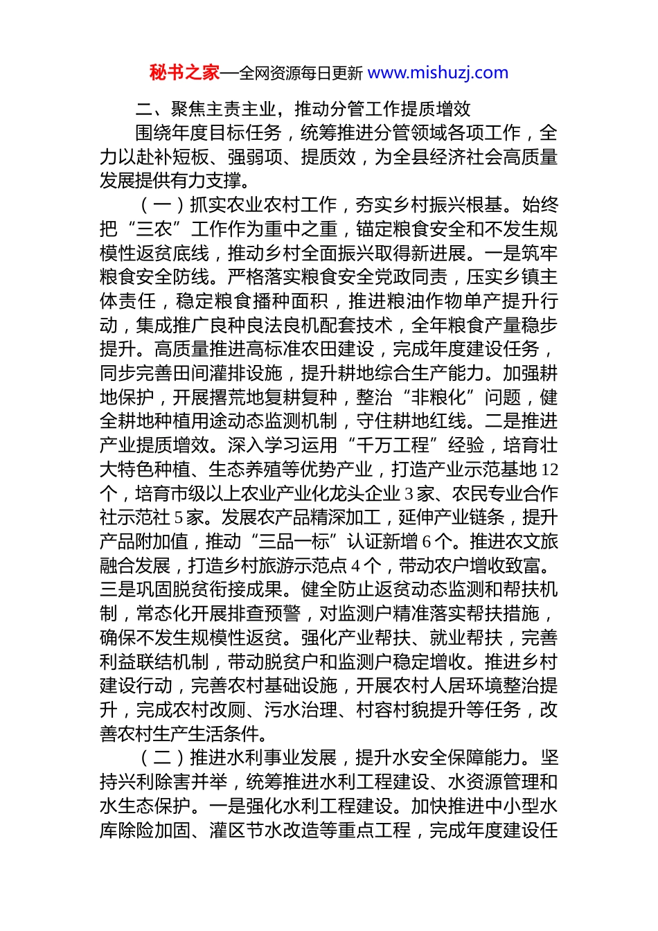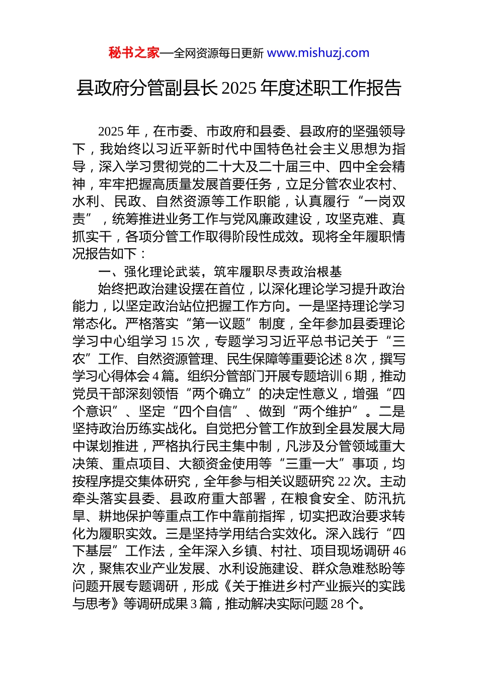 秘书之家—全网资源每日更新 www.mishuzj.com县政府分管副县长 2025 年度述职工作报告2025 年,在市委、市政府和县委、县政府的坚强领导下,我始终以习近平新时代中国特色社会主义思想为指导,深入学习贯彻党的二十大及二十届三中、四中全会精神,牢牢把握高质量发展首要任务,立足分管农业农村、水利、民政、自然资源等工作职能,认真履行“一岗双责”,统筹推进业务工作与党风廉政建设,攻坚克难、真抓实干,各项分管工作取得阶段性成效。现将全年履职情况报告如下:一、强化理论武装,筑牢履职尽责政治根基始终把政治建设摆在首位,以深化理论学习提升政治能力,以坚定政治站位把握工作方向。一是坚持理论学习常态化。严格落实“第一议题”制度,全年参加县委理论学习中心组学习 15 次,专题学习习近平总书记关于“三农”工作、自然资源管理、民生保障等重要论述 8 次,撰写学习心得体会 4 篇。组织分管部门开展专题培训 6 期,推动党员干部深刻领悟“两个确立”的决定性意义,增强“四个意识”、坚定“四个自信”、做到“两个维护”。二是坚持政治历练实战化。自觉把分管工作放到全县发展大局中谋划推进,严格执行民主集中制,凡涉及分管领域重大决策、重点项目、大额资金使用等“三重一大”事项,均按程序提交集体研究,全年参与相关议题研究 22 次。主动牵头落实县委、县政府重大部署,在粮食安全、防汛抗旱、耕地保护等重点工作中靠前指挥,切实把政治要求转化为履职实效。三是坚持学用结合实效化。深入践行“四下基层”工作法,全年深入乡镇、村社、项目现场调研 46次,聚焦农业产业发展、水利设施建设、群众急难愁盼等问题开展专题调研,形成《关于推进乡村产业振兴的实践与思考》等调研成果 3 篇,推动解决实际问题 28 个。秘书之家—全网资源每日更新 www.mishuzj.com二、聚焦主责主业,推动分管工作提质增效围绕年度目标任务,统筹推进分管领域各项工作,全力以赴补短板、强弱项、提质效,为全县经济社会高质量发展提供有力支撑。(一)抓实农业农村工作,夯实乡村振兴根基。始终把“三农”工作作为重中之重,锚定粮食安全和不发生规模性返贫底线,推动乡村全面振兴取得新进展。一是筑牢粮食安全防线。严格落实粮食安全党政同责,压实乡镇主体责任,稳定粮食播种面积,推进粮油作物单产提升行动,集成推广良种良法良机配套技术,全年粮食产量稳步提升。高质量推进高标准农田建设,完成年度建设任务,同步完善田间灌排设施,提升耕地综合生产能力。加强耕地保护,开展撂荒地复耕复种,整治“非粮化”问题,健全耕地种植用途动态监测机制,守住耕地红线。二是推进产业提质增效。深入学习运用“千万工程”经验,培育壮大特色种植、生态养殖等优势产业,打造产业示范基地 12个,培育市级以上农业产业化龙头企业 3 家、农民专业合作社示范社 5 家。发展农产品精深加工,延伸产业链条,提升产品附加值,推动“三品一标”认证新增 6 个。推进农文旅融合发展,打造乡村旅游示范点 4 个,带动农户增收致富。三是巩固脱贫衔接成果。健全防止返贫动态监测和帮扶机制,常态化开展排查预警,对监测户精准落实帮扶措施,确保不发生规模性返贫。强化产业帮扶、就业帮扶,完善利益联结机制,带动脱贫户和监测户稳定增收。推进乡村建设行动,完善农村基础设施,开展农村人居环境整治提升,完成农村改厕、污水治理、村容村貌提升等任务,改善农村生产生活条件。(二)推进水利事业发展,提升水安全保障能力。坚持兴利除害并举,统筹推进水利工程建设、水资源管理和水生态保护。一是强化水利工程建设。加快推进中小型水库除险加固、灌区节水改造等重点工程,完成年度建设任秘书之家—全网资源每日更新 www.mishuzj.com务,提升水利基础设施保障能力。推进农村饮水安全巩固提升工程,优化供水管网布局,解决部分村庄季节性缺水问题,保障农村居民饮水安全。二是筑牢防汛抗旱防线。健全防汛抗旱责任制,修订完善应急预案,开展防汛演练 4次,提升应急处置能力。加强防汛物资储备和隐患排查整治,对河道、水库、山洪地质灾害隐患点等重点部位开展常态化排查,...
