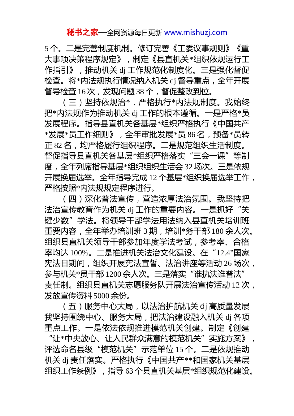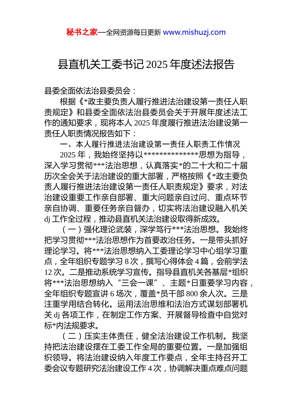 秘书之家—全网资源每日更新 www.mishuzj.com县直机关工委书记 2025 年度述法报告县委全面依法治县委员会:根据《*政主要负责人履行推进法治建设第一责任人职责规定》和县委全面依法治县委员会关于开展年度述法工作的通知要求,现将本人 2025 年度履行推进法治建设第一责任人职责情况报告如下:一、本人履行推进法治建设第一责任人职责工作情况2025 年,我始终坚持以**************思想为指导,深入学习贯彻***法治思想,认真落实*的二十大和二十届历次全会关于法治建设的重大部署,严格按照《*政主要负责人履行推进法治建设第一责任人职责规定》要求,对法治建设重要工作亲自部署、重大问题亲自过问、重点环节亲自协调、重要任务亲自督办,切实将法治建设融入机关dj 工作全过程,推动县直机关法治建设取得新成效。(一)强化理论武装,深学笃行***法治思想。我始终把学习贯彻***法治思想作为首要政治任务。一是带头抓好理论学习。将***法治思想纳入工委理论学习中心组学习重点,全年组织专题学习 8 次,撰写心得体会 4 篇,会前学法12 次。二是推动系统学习宣传。指导县直机关各基层*组织将***法治思想纳入“三会一课”、主题*日重要学习内容,全年组织专题宣讲 6 场次,覆盖*员干部 800 余人次。三是注重学用结合转化。运用法治思维和法治方式谋划部署机关 dj 各项工作,在制定工作方案、开展督导检查中自觉对标*内法规要求。(二)压实主体责任,健全法治建设工作机制。我坚持把法治建设摆在工委工作全局的重要位置。一是加强组织领导。将法治建设纳入年度工作要点,全年主持召开工委会议专题研究法治建设工作 4 次,协调解决重点难点问题秘书之家—全网资源每日更新 www.mishuzj.com5 个。二是完善制度机制。修订完善《工委议事规则》《重大事项决策程序规定》,制定《县直机关*组织依规运行工作指引》,推动机关 dj 工作规范化制度化。三是强化督促检查。将*内法规执行情况纳入机关 dj 督导重点,全年开展督导检查 16 次,发现问题 38 个,督促整改到位。(三)坚持依规治*,严格执行*内法规制度。我始终把*内法规作为推动机关 dj 工作的根本遵循。一是严格*员发展程序。指导县直机关各基层*组织严格执行《中国共产*发展*员工作细则》,全年审批发展*员 86 名,预备*员转正 82 名,均严格履行组织程序。二是规范组织生活制度。督促指导县直机关各基层*组织严格落实“三会一课”等制度,全年列席指导基层*组织组织生活会 32 场次。三是依规开展换届选举。全年指导完成 12 个基层*组织换届选举工作,严格按照*内法规规定程序进行。(四)深化普法宣传,营造浓厚法治氛围。我坚持把法治宣传教育作为机关 dj 工作的重要内容。一是抓好“关键少数”学法。将领导干部学法用法纳入县直机关培训班重要内容,全年举办培训班 3 期,培训*务干部 180 余人次。组织县直机关领导干部参加年度学法考试,参考率、合格率均达 100%。二是推进机关法治文化建设。在“12.4”国家宪法日期间,组织开展宪法宣誓、法治讲座等活动 26 场次,参与机关*员干部 1200 余人次。三是落实“谁执法谁普法”责任制。组织县直机关志愿服务队开展法治宣传活动 12 次,发放宣传资料 5000 余份。(五)服务中心大局,以法治护航机关 dj 高质量发展我坚持围绕中心、服务大局,把法治建设融入机关 dj 各项重点工作。一是依法依规推进模范机关创建。制定《创建“让*中央放心、让人民群众满意的模范机关”实施方案》,评选命名县级“模范机关”示范单位 15 个。二是依规推动机关 dj 责任落实。严格执行《中国共产**和国家机关基层组织工作条例》,指导 63 个县直机关基层*组织规范化建设。秘书之家—全网资源每日更新 www.mishuzj.com三是以法治思维化解矛盾纠纷。全年协调处理涉及*员组织关系转接、*费收缴等方面问题 23 个,均依规依纪妥善解决。二、存在的问题和不足对照《*政主要负责人履行推进法治建设第一责任人职责规定》要求,对标***法治思想,我在履行法治建设第一责任人职责方面还存在一些问题和不足:(一)法治理论学习的系统性深度...