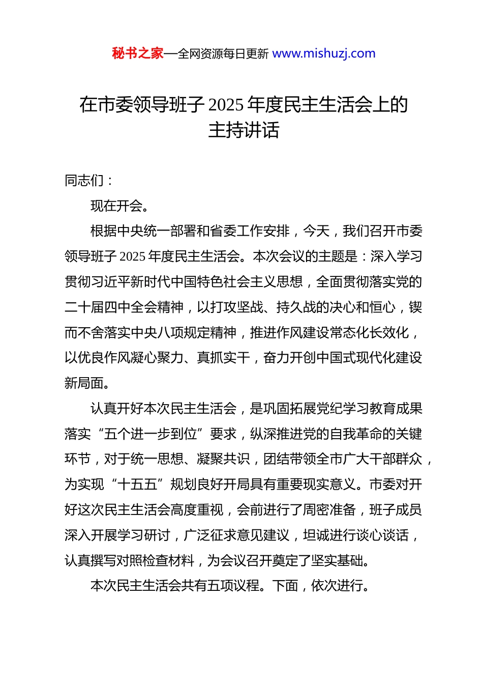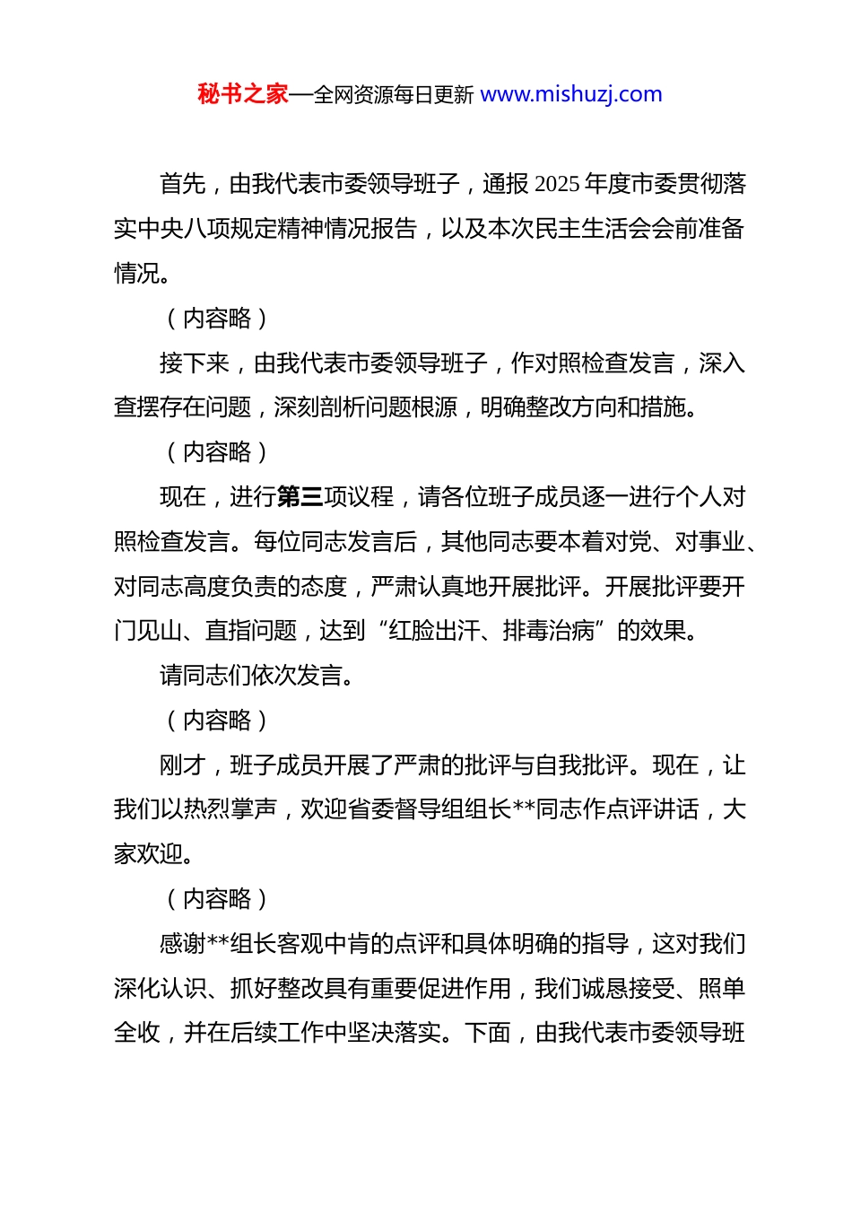 秘书之家—全网资源每日更新 www.mishuzj.com在市委领导班子 2025 年度民主生活会上的主持讲话 同志们:现在开会。根据中央统一部署和省委工作安排,今天,我们召开市委领导班子 2025 年度民主生活会。本次会议的主题是:深入学习贯彻习近平新时代中国特色社会主义思想,全面贯彻落实党的二十届四中全会精神,以打攻坚战、持久战的决心和恒心,锲而不舍落实中央八项规定精神,推进作风建设常态化长效化,以优良作风凝心聚力、真抓实干,奋力开创中国式现代化建设新局面。认真开好本次民主生活会,是巩固拓展党纪学习教育成果落实“五个进一步到位”要求,纵深推进党的自我革命的关键环节,对于统一思想、凝聚共识,团结带领全市广大干部群众,为实现“十五五”规划良好开局具有重要现实意义。市委对开好这次民主生活会高度重视,会前进行了周密准备,班子成员深入开展学习研讨,广泛征求意见建议,坦诚进行谈心谈话,认真撰写对照检查材料,为会议召开奠定了坚实基础。本次民主生活会共有五项议程。下面,依次进行。秘书之家—全网资源每日更新 www.mishuzj.com首先,由我代表市委领导班子,通报 2025 年度市委贯彻落实中央八项规定精神情况报告,以及本次民主生活会会前准备情况。(内容略)接下来,由我代表市委领导班子,作对照检查发言,深入查摆存在问题,深刻剖析问题根源,明确整改方向和措施。(内容略)现在,进行第三项议程,请各位班子成员逐一进行个人对照检查发言。每位同志发言后,其他同志要本着对党、对事业、对同志高度负责的态度,严肃认真地开展批评。开展批评要开门见山、直指问题,达到“红脸出汗、排毒治病”的效果。请同志们依次发言。(内容略)刚才,班子成员开展了严肃的批评与自我批评。现在,让我们以热烈掌声,欢迎省委督导组组长**同志作点评讲话,大家欢迎。(内容略)感谢**组长客观中肯的点评和具体明确的指导,这对我们深化认识、抓好整改具有重要促进作用,我们诚恳接受、照单全收,并在后续工作中坚决落实。下面,由我代表市委领导班秘书之家—全网资源每日更新 www.mishuzj.com子,就落实好本次民主生活会精神,特别是督导组的要求,抓好问题整改,加强班子自身建设,作如下表态:一、坚定不移筑牢政治忠诚,在深化理论武装上持续用力习近平总书记强调,在思想上政治上行动上始终同党中央保持高度一致,做到心往一处想、劲往一处使。我们将始终坚持把党的政治建设摆在首位,将学习贯彻党的创新理论作为终身课题,特别是深刻领会习近平总书记关于党的自我革命的重要思想,以及“五个进一步到位”的实践要求,不断提高政治判断力、政治领悟力、政治执行力。紧密联系我市在推动高质量发展、维护社会稳定、保障改善民生等方面的具体工作,自觉从中找思路、找方法、找答案,确保党中央决策部署和省委工作要求在我市不折不扣落地生根,以实际行动坚定拥护“两个确立”、坚决做到“两个维护”。二、动真碰硬推进问题整改,在健全长效机制上精准发力查摆问题是为了解决问题,批评意见旨在促进工作。针对本次民主生活会查摆出的问题,以及督导组指出的不足、同志们提出的批评,我们将立即建立详实的整改台账,实行“清单式管理、项目化推进”。市委班子及每位成员都将主动认领责任,制定个人整改措施与班子整改方案,明确整改时限与目标,定期调度、对账销号。坚持“当下改”与“长久立”结合,聚焦秘书之家—全网资源每日更新 www.mishuzj.com作风建设、风险防控、基层治理等领域暴露的深层次矛盾,注重从制度机制上查漏补缺,推动整改成果转化为管长远、固根本的制度规范,坚决杜绝问题反弹回潮,实现标本兼治、常态长效。三、凝心聚力扛起发展重任,在推动实干争先上展现作为今年是“十五五”规划开局之年,中央经济工作会议对“着力推动高质量发展”作出新部署,省委十三届五次全会明确要求“在推进中国式现代化建设中走在前、作示范”。我们将以此次民主生活会为新的起点,将整改落实与推动中心工作紧密结合。锚定我市确定的年度经济社会发展目标,特别是在培育壮大战略性新兴产业、全面推进乡村振兴、建设美丽宜居城市等方面,大力弘...