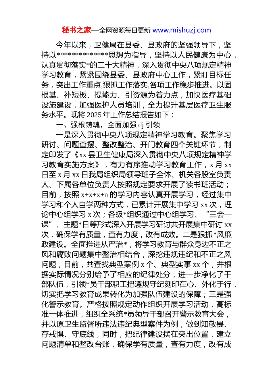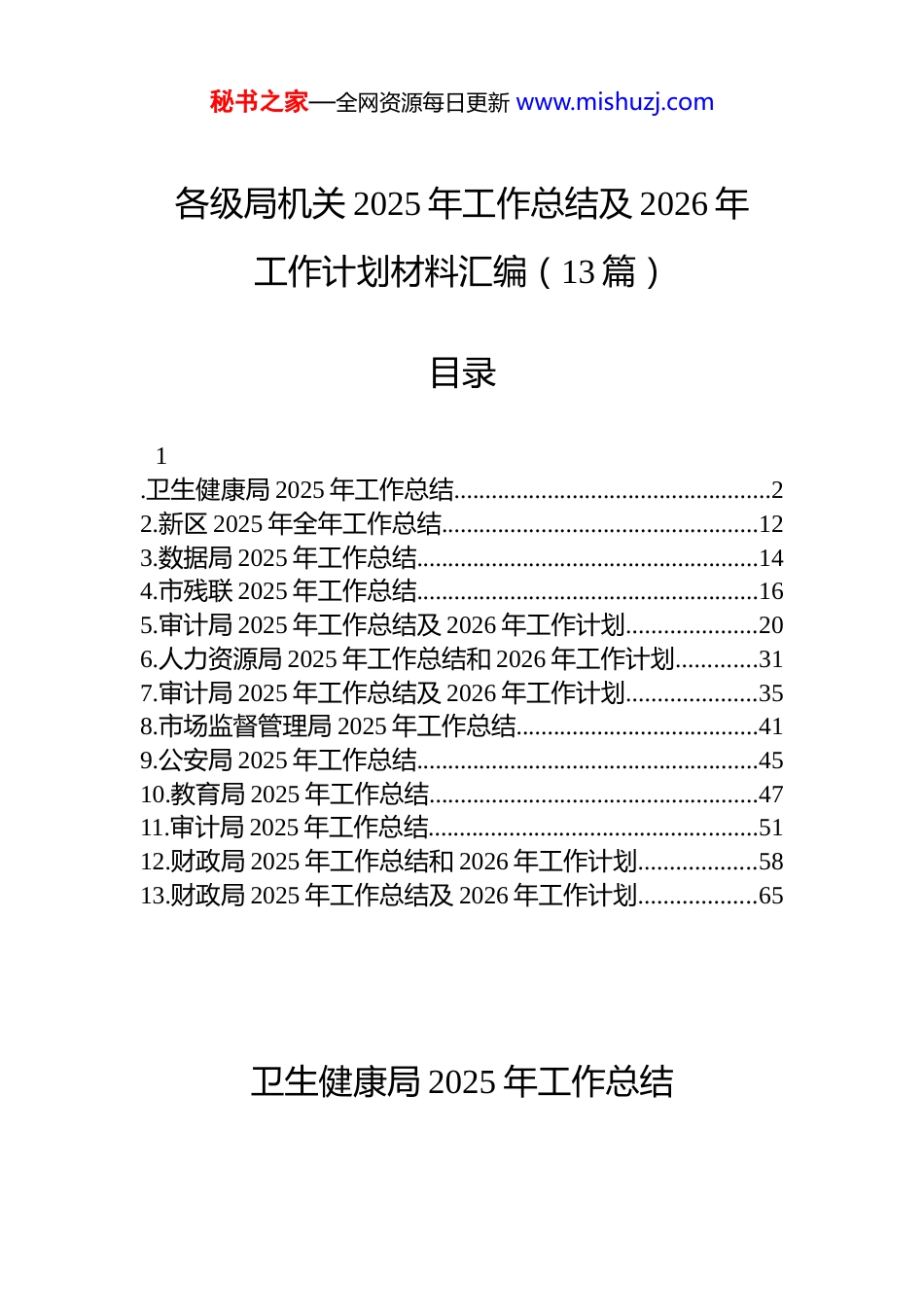 秘书之家—全网资源每日更新 www.mishuzj.com各级局机关 2025 年工作总结及 2026 年工作计划材料汇编(13 篇)目录1.卫生健康局 2025 年工作总结...................................................22.新区 2025 年全年工作总结...................................................123.数据局 2025 年工作总结.......................................................144.市残联 2025 年工作总结.......................................................165.审计局 2025 年工作总结及 2026 年工作计划.....................206.人力资源局 2025 年工作总结和 2026 年工作计划.............317.审计局 2025 年工作总结及 2026 年工作计划.....................358.市场监督管理局 2025 年工作总结.......................................419.公安局 2025 年工作总结.......................................................4510.教育局 2025 年工作总结.....................................................4711.审计局 2025 年工作总结.....................................................5112.财政局 2025 年工作总结和 2026 年工作计划...................5813.财政局 2025 年工作总结及 2026 年工作计划...................65卫生健康局 2025 年工作总结秘书之家—全网资源每日更新 www.mishuzj.com今年以来,卫健局在县委、县政府的坚强领导下,坚持以**************思想为指导,坚持以人民健康为中心,认真贯彻落实*的二十大精神,深入贯彻中央八项规定精神学习教育,紧紧围绕县委、县政府中心工作,紧盯目标任务,突出工作重点,狠抓工作落实,各项工作稳步推进。以固根基、补短板、提能力、引资源为着力点,加快医疗基础设施建设,加强医护人员培训,全力提升基层医疗卫生服务水平。现将 2025 年工作总结报告如下:一、强根铸魂,全面加强 dj 引领一是深入贯彻中央八项规定精神学习教育。聚焦学习研讨、问题查摆、整改整治、开门教育四个关键环节,制定印发了《xx 县卫生健康局深入贯彻中央八项规定精神学习教育实施方案》,有力有序推动学习教育工作,x 月 xx日至 x 月 xx 日我局组织局领导班子全体、机关各股室负责人、下属各单位负责人按照规定要求开展了读书班活动;目前,按照 x+x+x+n 的学习内容认真开展学习,经过集中学习和个人自学两种方式,已累计开展集中学习 xx 次,理论中心组学习 x 次;各级*组织通过中心组学习、“三会一课”、主题*日等形式深入开展学习研讨共开展集中研讨 xx次,确保学有质量,查有力度,改有成效。二是狠抓*风廉政建设。全面推进从严治*,将学习教育与群众身边不正之风和腐败问题集中整治相结合,深挖违规违纪和不正之风问题,目前,共查找典型案例 x 个、典型实事 xx 个,并根据实际情况分别给予了相应的纪律处分,进一步净化了干部队伍,引领*员干部职工把遵规守纪刻印在心、外化于行,切实把学习教育成果转化为加强队伍建设的保障;三是强化警示教育。严格按照规定动作组织开展学习活动,高标准一体推进,组织全系统*员领导干部召开警示教育大会,并以原卫生监督所违法违纪典型案件为例,做到知敬畏、存戒惧、守底线,同时,把纪律建设摆在突出位置,建立问题清单和整改台账,确保学有质量,查有力度,改有成秘书之家—全网资源每日更新 www.mishuzj.com效;四是加大监督力度。持续加强*风廉政建设,卫健系统上下严格执行中央八项规定及其实施细则精神,严于律已严负其责,严管所辖,既要管好八小时之内,又要管好八小时之外,以优良*风政风推动卫生健康事业高质量发展;五是加强制度建设。通过健全和完善各项规章制度,使各项工作各种行为做到有章可循,并严格执行。将每周一确定为集中学习日,每期集中学习分三个层面,轮流由局领导班子领学*的理论知识,由各科室负责人领学业务知识,由科室同志领学正能量文章,现场点评、交流互动,使日常学习更富成效;六是筑牢意识形态。持续加强意识形态教育工作,实行“一把手”负总责,班子成员各负其责,以...