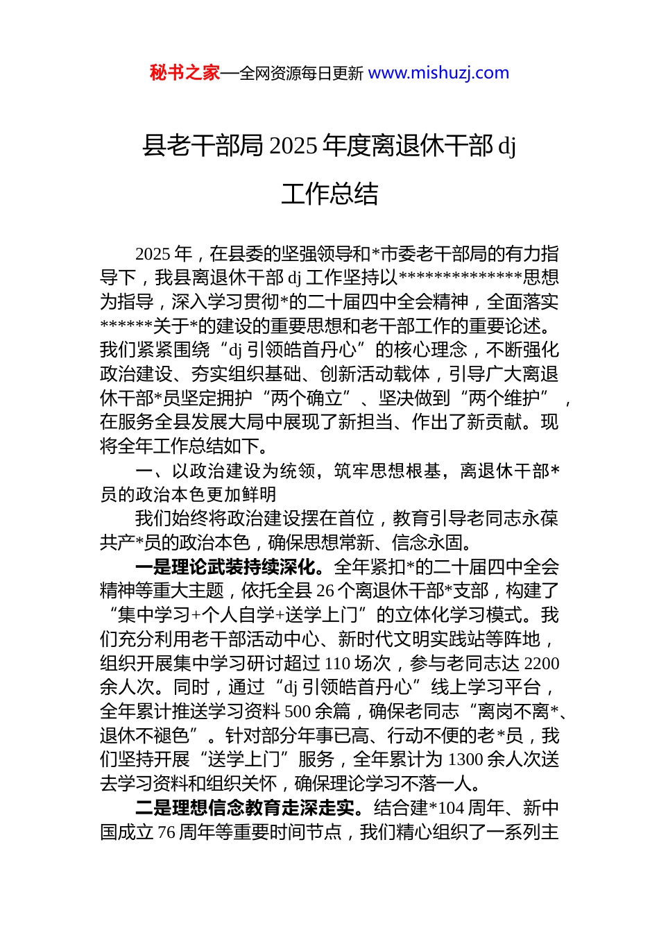 秘书之家—全网资源每日更新 www.mishuzj.com县老干部局 2025 年度离退休干部 dj工作总结2025 年,在县委的坚强领导和*市委老干部局的有力指导下,我县离退休干部 dj 工作坚持以**************思想为指导,深入学习贯彻*的二十届四中全会精神,全面落实******关于*的建设的重要思想和老干部工作的重要论述。我们紧紧围绕“dj 引领皓首丹心”的核心理念,不断强化政治建设、夯实组织基础、创新活动载体,引导广大离退休干部*员坚定拥护“两个确立”、坚决做到“两个维护”,在服务全县发展大局中展现了新担当、作出了新贡献。现将全年工作总结如下。一、以政治建设为统领,筑牢思想根基,离退休干部*员的政治本色更加鲜明我们始终将政治建设摆在首位,教育引导老同志永葆共产*员的政治本色,确保思想常新、信念永固。一是理论武装持续深化。全年紧扣*的二十届四中全会精神等重大主题,依托全县 26 个离退休干部*支部,构建了“集中学习+个人自学+送学上门”的立体化学习模式。我们充分利用老干部活动中心、新时代文明实践站等阵地,组织开展集中学习研讨超过 110 场次,参与老同志达 2200余人次。同时,通过“dj 引领皓首丹心”线上学习平台,全年累计推送学习资料 500 余篇,确保老同志“离岗不离*、退休不褪色”。针对部分年事已高、行动不便的老*员,我们坚持开展“送学上门”服务,全年累计为 1300 余人次送去学习资料和组织关怀,确保理论学习不落一人。二是理想信念教育走深走实。结合建*104 周年、新中国成立 76 周年等重要时间节点,我们精心组织了一系列主秘书之家—全网资源每日更新 www.mishuzj.com题突出、形式多样的主题*日活动。例如,七一前夕,组织了“重温入*誓词,永葆*员初心”活动,百余名老*员面对*旗庄严宣誓,场面感人至深。国庆期间,举办了“我与祖国共奋进”主题座谈会,老同志们结合亲身经历,畅谈国家发展巨变,抒发爱国情怀。通过这些活动,有效激发了老同志们的政治热情,使其深刻感悟到*的领导和中国特色社会主义制度的优越性。三是*性锻炼常态长效。我们将严格*的组织生活作为锤炼*性的重要途径。全年指导各离退休干部*支部严格落实“三会一课”、组织生活会、民主评议*员等制度。我们还广泛开展为离退休干部*员过“政治生日”活动,全年共为 40 余名老*员送上“生日”祝福和寄语,提醒他们时刻牢记*员身份,永葆初心使命。这些举措增强了老同志的组织归属感和*员荣誉感,使*性锻炼融入日常、抓在经常。二、以组织建设为抓手,夯实战斗堡垒,*组织的凝聚力战斗力显著增强我们着力提升*组织建设质量,不断严密组织体系,推动*支部标准化规范化建设迈上新台阶,使之成为团结凝聚老同志的核心。一是组织体系更加健全。按照“利于活动、便于管理、应建尽建”的原则,我们对全县离退休干部*组织设置进行了动态优化调整。2025 年,我们指导新建了 2 个功能型*支部,使全县离退休干部*支部总数达到 26 个,实现了对全县3000 余名离退休干部*员的有效覆盖和管理。同时,我们注重选优配强*支部班子,特别是选拔了一批*性强、威望高、身体好、乐于奉献的老同志担任支部书记,为 dj 工作的有力开展提供了坚实的组织保障。二是支部建设更加规范。我们深入推进离退休干部*支部标准化规范化建设,对照“六好”示范*支部标准,开展“对标创优”活动。2025 年 7 月,我们举办了为期三天的全县离退休干部*组织书记(委员)及联络员专题培训班,秘书之家—全网资源每日更新 www.mishuzj.com系统学习 dj 业务知识,并组织到*市先进单位进行现场观摩,有效提升了*务工作者的履职能力。年终,经过严格考评,我们成功创建了 3 个“六好”示范*支部,并通过“以点带面”的方式,带动全县离退休干部*组织整体建设水平的提升。三是*员管理服务更加精准。我们深化荣誉退休制度,将其作为新退休干部融入组织的第一站。2025 年,全县各单位共为 320 名新退休干部举办了 110 余场次庄重简朴的荣誉退休仪式,引导他们光荣退休、思想平稳过渡,并鼓励其中 85 人加入了各类志愿服务队。我们还用心用情做好服务保障工作,坚持日常走...