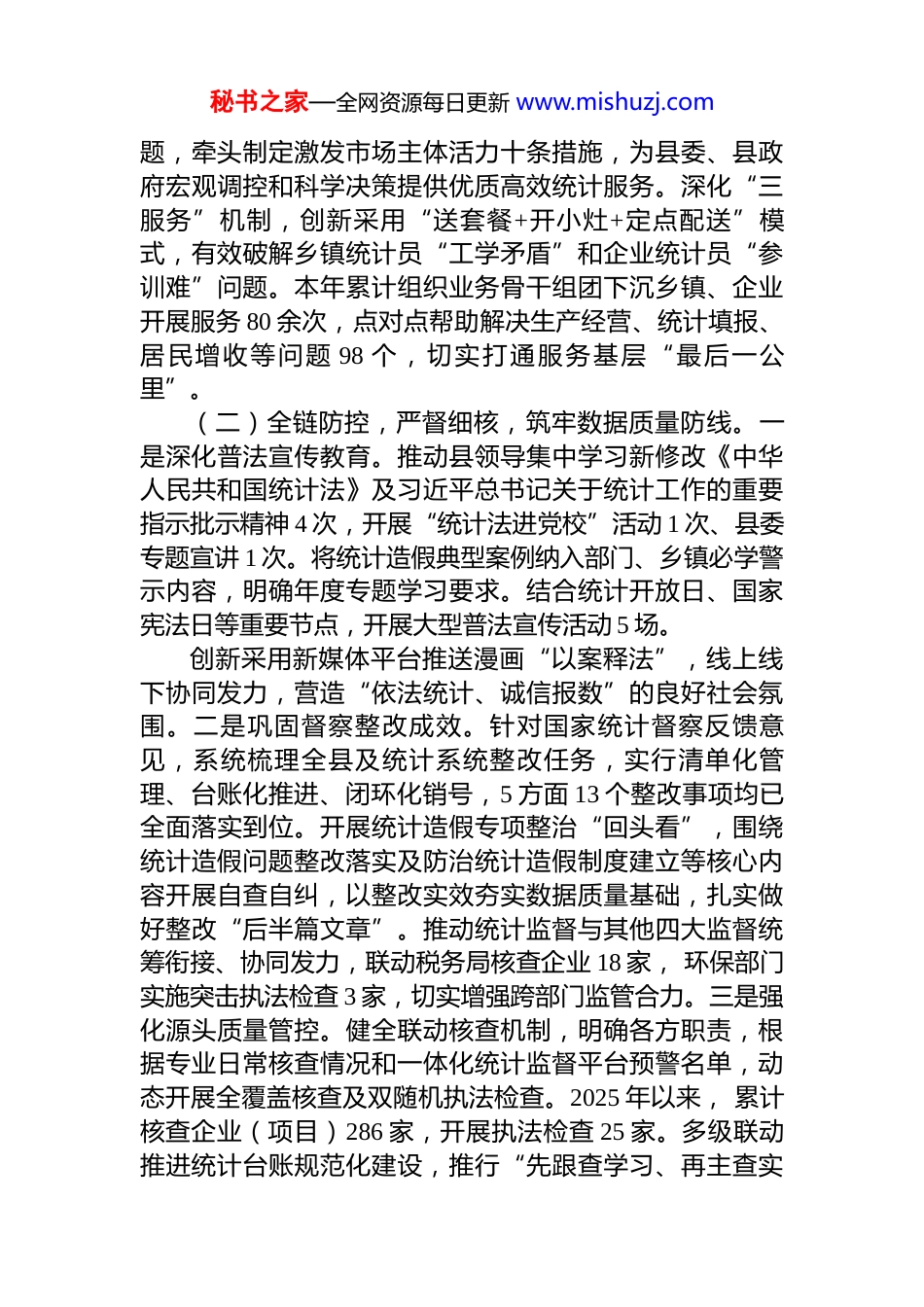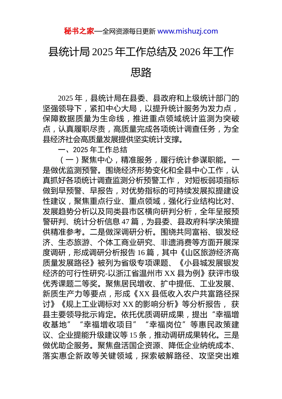 秘书之家—全网资源每日更新 www.mishuzj.com县统计局 2025 年工作总结及 2026 年工作思路2025 年,县统计局在县委、县政府和上级统计部门的坚强领导下,紧扣中心大局,以提升统计服务为发力点,保障数据质量为生命线,推进重点领域统计监测为突破点,认真履职尽责,高质量完成各项统计调查任务,为全县经济社会高质量发展提供坚实统计支撑。一、2025 年工作总结(一)聚焦中心,精准服务,履行统计参谋职能。一是做优监测预警。围绕经济形势变化和全县中心工作,认真抓好各项统计调查监测分析预警工作, 对短板弱项指标做到早预警、早报告,对优势指标的可持续发展拟提建设性建议,聚焦重点行业、重点领域,强化行业结构比对、发展趋势分析以及同类县市区横向研判分析,全年呈报预警研判、统计分析信息 47 篇,为县委、县政府科学决策提供精准参考。二是做深调研分析。围绕共同富裕、银发经济、生态旅游、个体工商业研究、非遗消费等方面开展深度调研,形成调研分析报告 16 篇,其中《山区旅游经济高质量发展路径》被列为省级专项课题、《小县城发展银发经济的可行性研究-以浙江省温州市 XX 县为例》获评市级优秀课题二等奖。聚焦居民增收、扩中提低、工业发展、新质生产力等要点,形成《XX 县低收入农户共富路径探讨》《规上工业调标对 XX 的影响分析》等分析报告, 获县主要领导批示肯定。依托优质调研成果,提出“幸福增收基地”“幸福增收项目”“幸福岗位”等惠民政策建议、企业提能升级建议等 15 条,推动调研成果转化。三是做优助企服务。聚焦盘活国企资源、降低企业纳统成本、落实惠企新政等关键领域,探索破解路径、攻坚突出难秘书之家—全网资源每日更新 www.mishuzj.com题,牵头制定激发市场主体活力十条措施,为县委、县政府宏观调控和科学决策提供优质高效统计服务。深化“三服务”机制,创新采用“送套餐+开小灶+定点配送”模式,有效破解乡镇统计员“工学矛盾”和企业统计员“参训难”问题。本年累计组织业务骨干组团下沉乡镇、企业开展服务 80 余次,点对点帮助解决生产经营、统计填报、居民增收等问题 98 个,切实打通服务基层“最后一公里”。(二)全链防控,严督细核,筑牢数据质量防线。一是深化普法宣传教育。推动县领导集中学习新修改《中华人民共和国统计法》及习近平总书记关于统计工作的重要指示批示精神 4 次,开展“统计法进党校”活动 1 次、县委专题宣讲 1 次。将统计造假典型案例纳入部门、乡镇必学警示内容,明确年度专题学习要求。结合统计开放日、国家宪法日等重要节点,开展大型普法宣传活动 5 场。创新采用新媒体平台推送漫画“以案释法”,线上线下协同发力,营造“依法统计、诚信报数”的良好社会氛围。二是巩固督察整改成效。针对国家统计督察反馈意见,系统梳理全县及统计系统整改任务,实行清单化管理、台账化推进、闭环化销号,5 方面 13 个整改事项均已全面落实到位。开展统计造假专项整治“回头看”,围绕统计造假问题整改落实及防治统计造假制度建立等核心内容开展自查自纠,以整改实效夯实数据质量基础,扎实做好整改“后半篇文章”。推动统计监督与其他四大监督统筹衔接、协同发力,联动税务局核查企业 18 家, 环保部门实施突击执法检查 3 家,切实增强跨部门监管合力。三是强化源头质量管控。健全联动核查机制,明确各方职责,根据专业日常核查情况和一体化统计监督平台预警名单,动态开展全覆盖核查及双随机执法检查。2025 年以来, 累计核查企业(项目)286 家,开展执法检查 25 家。多级联动推进统计台账规范化建设,推行“先跟查学习、再主查实秘书之家—全网资源每日更新 www.mishuzj.com践”阶梯式培养模式,通过业务骨干与基层统计员结对,示范指标口径、指导填报规范、复盘易错要点,提升基层规范建档意识与核查实操能力。分层分类开展乡镇、企业统计员全覆盖培训,全年累计开展 30 场次,培训 1100 余人次,实现“事后纠偏”到“事前防控”模式转变。(三)靠前谋划,统筹部署,高标完成主责主业。一是有序开展国情国力普查及抽样调查等工作。扎实做好全国第五次...