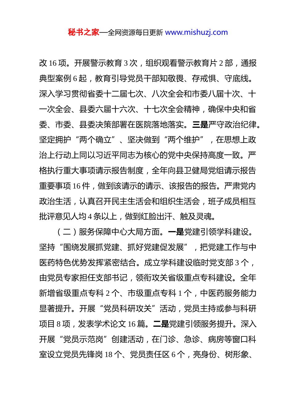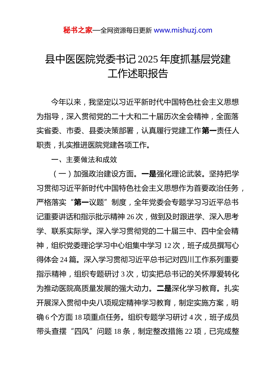 秘书之家—全网资源每日更新 www.mishuzj.com县中医医院党委书记 2025 年度抓基层党建工作述职报告 今年以来,我坚定以习近平新时代中国特色社会主义思想为指导,深入贯彻党的二十大和二十届历次全会精神,全面落实省委、市委、县委决策部署,认真履行党建工作第一责任人职责,扎实推进医院党建各项工作。一、主要做法和成效(一)加强政治建设方面。一是强化理论武装。坚持把学习贯彻习近平新时代中国特色社会主义思想作为首要政治任务,严格落实“第一议题”制度,全年党委会专题学习习近平总书记重要讲话和指示批示精神 26 次,做到及时跟进学、深入思考学、联系实际学。深入学习贯彻党的二十届三中、四中全会精神,组织党委理论学习中心组集中学习 12 次,班子成员撰写心得体会 24 篇。深入学习贯彻习近平总书记对四川工作系列重要指示精神,组织专题研讨 3 次,切实把总书记的关怀厚爱转化为推动医院高质量发展的强大动力。二是深化学习教育。扎实开展深入贯彻中央八项规定精神学习教育,制定实施方案,明确 6 个方面 18 项重点任务。组织专题学习研讨 4 次,班子成员带头查摆“四风”问题 18 条,制定整改措施 22 项,已完成整秘书之家—全网资源每日更新 www.mishuzj.com改 16 项。开展警示教育 3 次,组织观看警示教育片 2 部,通报典型案例 6 起,教育引导党员干部知敬畏、存戒惧、守底线。深入学习贯彻省委十二届七次、八次全会和市委八届十次、十一次全会、县委六届十六次、十七次全会精神,确保中央和省委、市委、县委决策部署在医院落地落实。三是严守政治纪律。坚定拥护“两个确立”、坚决做到“两个维护”,在思想上政治上行动上同以习近平同志为核心的党中央保持高度一致。严格执行重大事项请示报告制度,全年向县卫健局党组请示报告重要事项 16 件,做到该请示的请示、该报告的报告。严肃党内政治生活,认真召开民主生活会和组织生活会,班子成员相互批评意见人均 4 条以上,做到红脸出汗、触及灵魂。(二)服务保障中心大局方面。一是党建引领学科建设。坚持“围绕发展抓党建、抓好党建促发展”,把党建工作与中医药特色优势发挥紧密结合。成立学科建设临时党支部 3 个,由党员专家担任支部书记,领衔攻关省级重点专科建设。全年新增省级重点专科 2 个、市级重点专科 1 个,中医药服务能力显著提升。开展“党员科研攻关”活动,党员主持或参与科研项目 8 项,发表学术论文 16 篇。二是党建引领服务提升。深入开展“党员示范岗”创建活动,在门诊、急诊、病房等窗口科室设立党员先锋岗 18 个、党员责任区 6 个,亮身份、树形象、秘书之家—全网资源每日更新 www.mishuzj.com作表率。推行“党员首问负责制”,开展“我为群众办实事”实践活动,解决患者就医难题 86 件。门诊患者满意度提升至96.8%,住院患者满意度达到 98.2%,较去年分别提升 2.1 和1.8 个百分点。三是党建引领健康帮扶。组建党员医疗服务队 4支,深入乡镇、村社开展义诊下乡活动 28 次,服务群众 1.2 万人次,免费发放药品价值 8.6 万元。落实对口帮扶责任,选派党员骨干 6 名到基层医疗机构开展技术帮扶,帮助提升诊疗能力。开展“中医药进社区”活动 12 次,举办健康讲座 18 场,普及中医药养生保健知识,受益群众 3200 余人次。四是党建引领效率革命。深入实施“效率革命”行动,成立党员突击队,集中攻坚就诊流程优化。优化门诊就诊流程 12 项,推行“一站式”服务,平均候诊时间由 45 分钟缩短至 30 分钟。推进日间手术,开展日间手术病种 12 个,日间手术占比提升至 18%。加强床位周转管理,平均住院日由 8.6 天下降至 7.4 天,床位使用率保持在 92%以上。(三)推进基层党建工作重点任务落实方面。一是优化组织设置。根据医院科室调整和业务发展需要,优化党支部设置,将原有 6 个党支部调整为 8 个,实现临床、医技、行政后勤等科室党组织全覆盖。规范党支部换届工作,完成 3 个党支部按期换届,党支部班子结构进一步优化。建立党员领导干部党支秘书之家—全网资源每日更新 www.mishuzj.co...