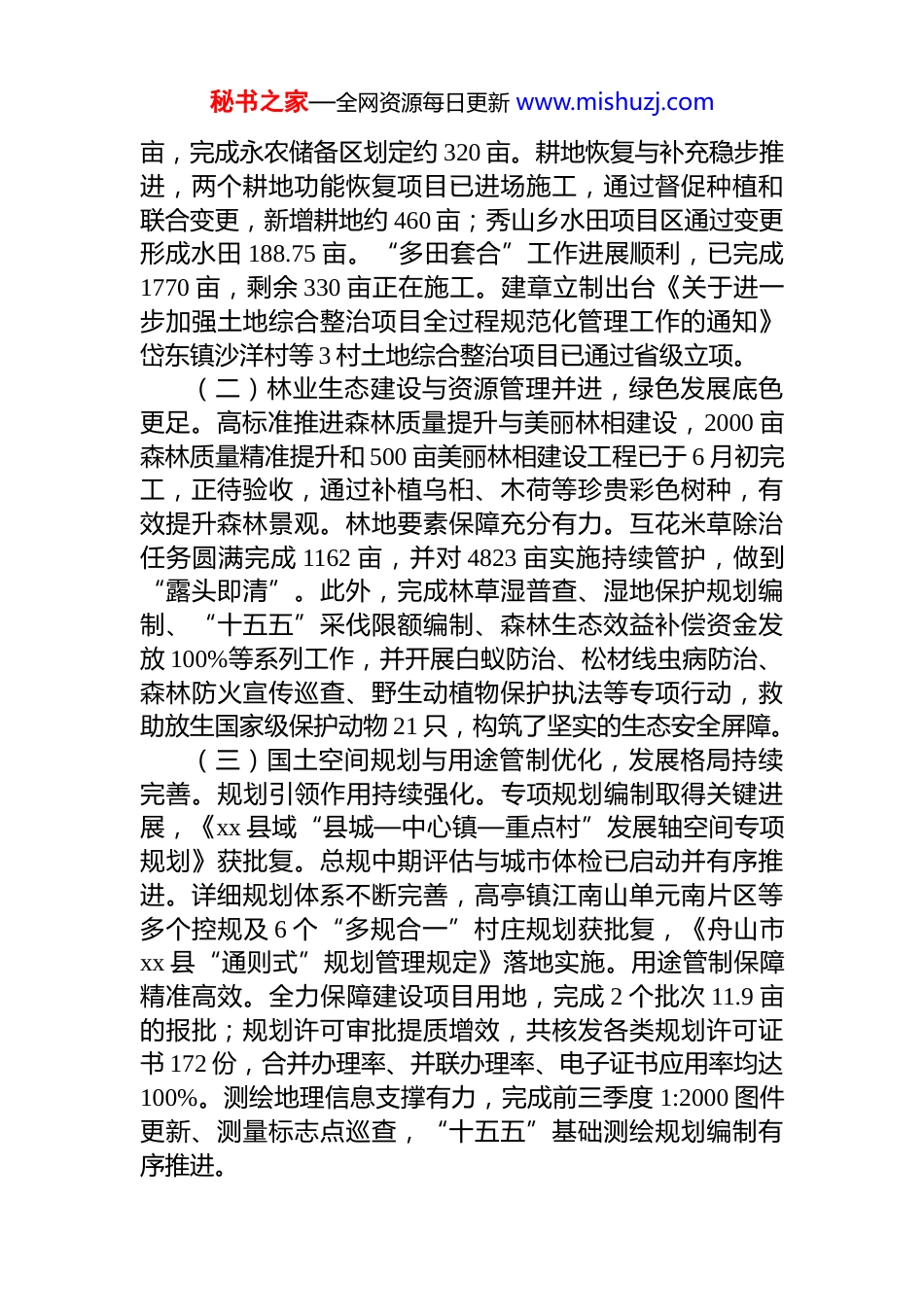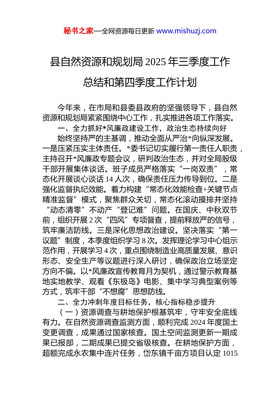 秘书之家—全网资源每日更新 www.mishuzj.com县自然资源和规划局 2025 年三季度工作总结和第四季度工作计划今年来,在市局和县委县政府的坚强领导下,县自然资源和规划局紧紧围绕中心工作,扎实推进各项工作落实。一、全力抓好*风廉政建设工作,政治生态持续向好始终坚持严的主基调,推动全面从严治*向纵深发展。一是压紧压实主体责任。*委书记切实履行第一责任人职责,主持召开*风廉政专题会议,研判政治生态,并对全局股级干部开展集体谈话。班子成员严格落实“一岗双责”,常态化开展谈心谈话 14 人次,确保责任压力传导到位。二是强化监督执纪效能。着力构建“常态化效能检查+关键节点精准监督”模式,聚焦群众关切,常态化滚动摸排并坚持“动态清零”不动产“登记难”问题。在国庆、中秋双节前,组织开展 2 次“四风”专项督查,提前释放严的信号,筑牢廉洁防线。三是深化思想政治建设。坚决落实“第一议题”制度,本季度组织学习 8 次。发挥理论学习中心组示范作用,开展学习 4 次,重点围绕制造业高质量发展、意识形态、安全生产等议题进行深入研讨,确保政治立场坚定方向不偏。以*风廉政宣传教育月为契机,通过警示教育基地实地教学、观看《东极岛》电影、集中学习典型案例等方式,筑牢干部“不想腐”思想防线。二、全力冲刺年度目标任务,核心指标稳步提升(一)资源调查与耕地保护根基筑牢,守牢安全底线有力。在自然资源调查监测方面,顺利完成 2024 年度国土变更调查,成果通过国家核查。国土空间监测更新一期成果已报部,二期成果已提交省级核查。在耕地保护方面,超额完成永农集中连片任务,岱东镇千亩方项目认定 1015秘书之家—全网资源每日更新 www.mishuzj.com亩,完成永农储备区划定约 320 亩。耕地恢复与补充稳步推进,两个耕地功能恢复项目已进场施工,通过督促种植和联合变更,新增耕地约 460 亩;秀山乡水田项目区通过变更形成水田 188.75 亩。“多田套合”工作进展顺利,已完成1770 亩,剩余 330 亩正在施工。建章立制出台《关于进一步加强土地综合整治项目全过程规范化管理工作的通知》岱东镇沙洋村等 3 村土地综合整治项目已通过省级立项。(二)林业生态建设与资源管理并进,绿色发展底色更足。高标准推进森林质量提升与美丽林相建设,2000 亩森林质量精准提升和 500 亩美丽林相建设工程已于 6 月初完工,正待验收,通过补植乌桕、木荷等珍贵彩色树种,有效提升森林景观。林地要素保障充分有力。互花米草除治任务圆满完成 1162 亩,并对 4823 亩实施持续管护,做到“露头即清”。此外,完成林草湿普查、湿地保护规划编制、“十五五”采伐限额编制、森林生态效益补偿资金发放 100%等系列工作,并开展白蚁防治、松材线虫病防治、森林防火宣传巡查、野生动植物保护执法等专项行动,救助放生国家级保护动物 21 只,构筑了坚实的生态安全屏障。(三)国土空间规划与用途管制优化,发展格局持续完善。规划引领作用持续强化。专项规划编制取得关键进展,《xx 县域“县城—中心镇—重点村”发展轴空间专项规划》获批复。总规中期评估与城市体检已启动并有序推进。详细规划体系不断完善,高亭镇江南山单元南片区等多个控规及 6 个“多规合一”村庄规划获批复,《舟山市xx 县“通则式”规划管理规定》落地实施。用途管制保障精准高效。全力保障建设项目用地,完成 2 个批次 11.9 亩的报批;规划许可审批提质增效,共核发各类规划许可证书 172 份,合并办理率、并联办理率、电子证书应用率均达100%。测绘地理信息支撑有力,完成前三季度 1:2000 图件更新、测量标志点巡查,“十五五”基础测绘规划编制有序推进。秘书之家—全网资源每日更新 www.mishuzj.com(四)自然资源要素保障与存量盘活同步,支撑发展能力增强。在要素保障方面,供地总量已完成 2671 亩。征地工作扎实推进,完成 2 个批次共 147.1495 公顷的土地征收。用海保障成效突出,保障惠生海岙码头、友联船坞等重点项目用海 2205 亩。在存量资源盘活方面,批而未供消化完成 122 亩,盘活存量建设用地 277 亩,低效用地再开发完成 156...