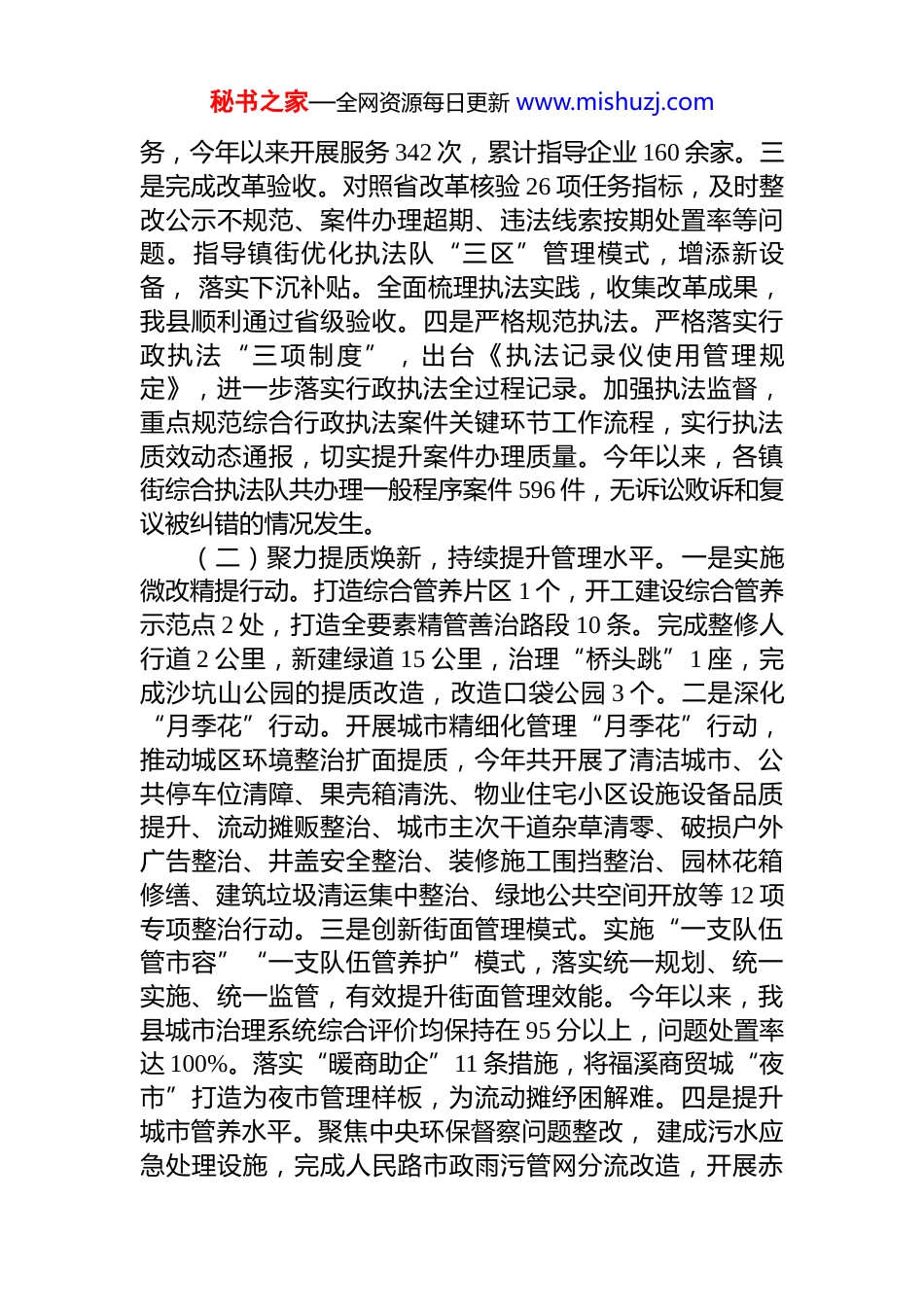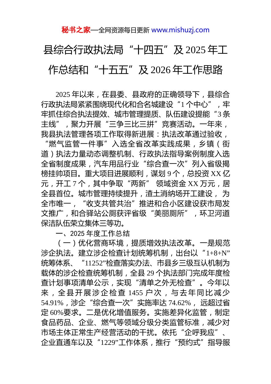 秘书之家—全网资源每日更新 www.mishuzj.com县综合行政执法局“十四五”及 2025 年工作总结和“十五五”及 2026 年工作思路2025 年以来,在县委、县政府的正确领导下,县综合行政执法局紧紧围绕现代化和合名城建设“1 个中心”,牢牢抓住综合执法提效、城市管理提质、队伍建设提能“3 条主线”,聚力开展“三争三比三拼”竞赛活动。一年来,我县执法管理各项工作取得新进展:执法改革通过验收,“燃气监管一件事”入选全省改革实践成果,乡镇(街道)执法力量动态调整机制、行政执法指导案例制度入选全省制度成果,汽车用品行业“综合查一次”列入省级揭榜挂帅项目。重大项目进展顺利,谋划 9 个,总投资 XX 亿元,开工 7 个,其中争取“两新” 领域资金 XX 万元,居全县首位。城市管理持续提升,渣土消纳场开工建设, 为全市唯一,“收支共管共治”推进和合小区建设获市局发文推广,和合驿站公厕获评省级“美丽厕所”,环卫河道保洁队伍荣立集体三等功。一、2025 年度工作总结(一)优化营商环境,提质增效执法改革。一是规范涉企执法。建立涉企检查计划统筹机制,出台以“1+8+N”统筹体系、“11252”检查落实办法、市县乡三级互认机制为载体的涉企检查统筹机制,全县 29 个执法部门完成年度检查计划事项清单公示,实现“清单之外无检查”。今年以来 , 全 县 开 展 涉 企 检 查 1455 户 次 , 与 去 年 同 比 减 少54.91%,涉企“综合查一次”实施率达 74.62%, 远超过省定 60%要求。二是优化增值服务。实施差异化监管,制定食品药品、企业、燃气等领域分级分类监管标准,减少对市场主体正常生产经营活动的干扰。依托“企呼我应”、企业直通车以及“1229”工作体系,推行“预约式”指导服秘书之家—全网资源每日更新 www.mishuzj.com务,今年以来开展服务 342 次,累计指导企业 160 余家。三是完成改革验收。对照省改革核验 26 项任务指标,及时整改公示不规范、案件办理超期、违法线索按期处置率等问题。指导镇街优化执法队“三区”管理模式,增添新设备, 落实下沉补贴。全面梳理执法实践,收集改革成果,我县顺利通过省级验收。四是严格规范执法。严格落实行政执法“三项制度”,出台《执法记录仪使用管理规定》,进一步落实行政执法全过程记录。加强执法监督,重点规范综合行政执法案件关键环节工作流程,实行执法质效动态通报,切实提升案件办理质量。今年以来,各镇街综合执法队共办理一般程序案件 596 件,无诉讼败诉和复议被纠错的情况发生。(二)聚力提质焕新,持续提升管理水平。一是实施微改精提行动。打造综合管养片区 1 个,开工建设综合管养示范点 2 处,打造全要素精管善治路段 10 条。完成整修人行道 2 公里,新建绿道 15 公里,治理“桥头跳”1 座,完成沙坑山公园的提质改造,改造口袋公园 3 个。二是深化“月季花”行动。开展城市精细化管理“月季花”行动,推动城区环境整治扩面提质,今年共开展了清洁城市、公共停车位清障、果壳箱清洗、物业住宅小区设施设备品质提升、流动摊贩整治、城市主次干道杂草清零、破损户外广告整治、井盖安全整治、装修施工围挡整治、园林花箱修缮、建筑垃圾清运集中整治、绿地公共空间开放等 12 项专项整治行动。三是创新街面管理模式。实施“一支队伍管市容”“一支队伍管养护”模式,落实统一规划、统一实施、统一监管,有效提升街面管理效能。今年以来,我县城市治理系统综合评价均保持在 95 分以上,问题处置率达 100%。落实“暖商助企”11 条措施,将福溪商贸城“夜市”打造为夜市管理样板,为流动摊纾困解难。四是提升城市管养水平。聚焦中央环保督察问题整改, 建成污水应急处理设施,完成人民路市政雨污管网分流改造,开展赤秘书之家—全网资源每日更新 www.mishuzj.com城、始丰、福溪雨污管网排查,开工污水处理厂扩容项目和赤城区块排水管网改造一期项目,改造二次供水小区 14个。和合驿站公厕创成省级“美丽厕所”,推进垃圾焚烧场超低排放改造,第一个分项已开工,第二个分项招投标中,计划年底启动改造。完成城市道路脱空检测 20...