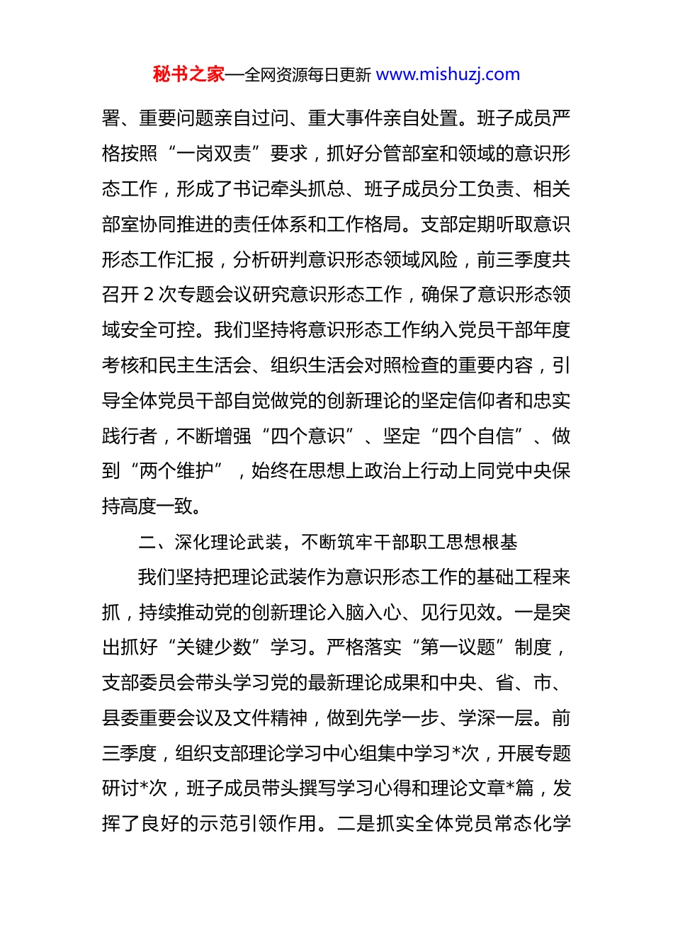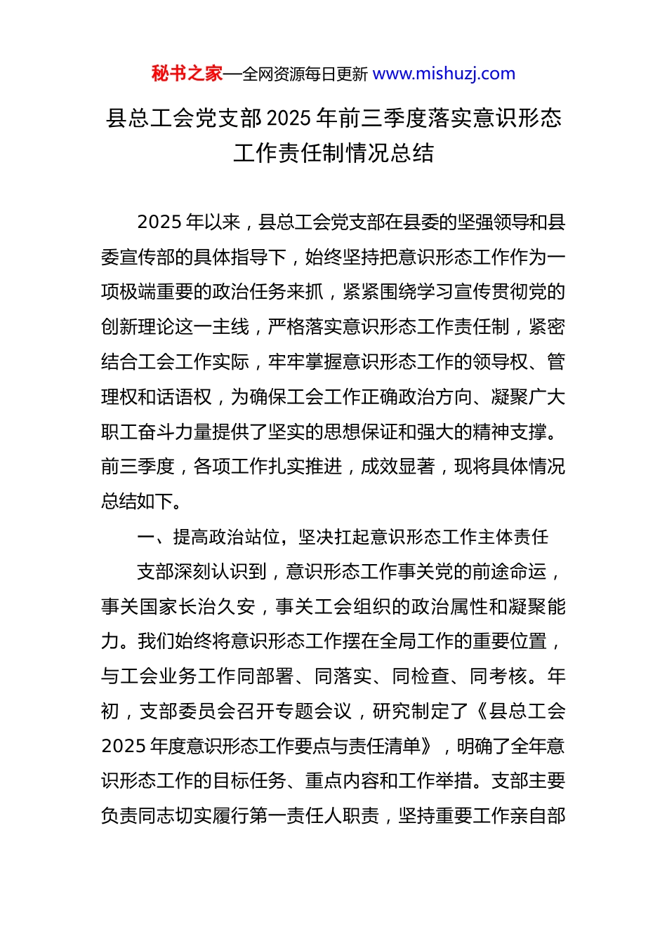 秘书之家—全网资源每日更新 www.mishuzj.com县总工会党支部 2025 年前三季度落实意识形态工作责任制情况总结 2025 年以来,县总工会党支部在县委的坚强领导和县委宣传部的具体指导下,始终坚持把意识形态工作作为一项极端重要的政治任务来抓,紧紧围绕学习宣传贯彻党的创新理论这一主线,严格落实意识形态工作责任制,紧密结合工会工作实际,牢牢掌握意识形态工作的领导权、管理权和话语权,为确保工会工作正确政治方向、凝聚广大职工奋斗力量提供了坚实的思想保证和强大的精神支撑。前三季度,各项工作扎实推进,成效显著,现将具体情况总结如下。一、提高政治站位,坚决扛起意识形态工作主体责任支部深刻认识到,意识形态工作事关党的前途命运,事关国家长治久安,事关工会组织的政治属性和凝聚能力。我们始终将意识形态工作摆在全局工作的重要位置,与工会业务工作同部署、同落实、同检查、同考核。年初,支部委员会召开专题会议,研究制定了《县总工会2025 年度意识形态工作要点与责任清单》,明确了全年意识形态工作的目标任务、重点内容和工作举措。支部主要负责同志切实履行第一责任人职责,坚持重要工作亲自部秘书之家—全网资源每日更新 www.mishuzj.com署、重要问题亲自过问、重大事件亲自处置。班子成员严格按照“一岗双责”要求,抓好分管部室和领域的意识形态工作,形成了书记牵头抓总、班子成员分工负责、相关部室协同推进的责任体系和工作格局。支部定期听取意识形态工作汇报,分析研判意识形态领域风险,前三季度共召开 2 次专题会议研究意识形态工作,确保了意识形态领域安全可控。我们坚持将意识形态工作纳入党员干部年度考核和民主生活会、组织生活会对照检查的重要内容,引导全体党员干部自觉做党的创新理论的坚定信仰者和忠实践行者,不断增强“四个意识”、坚定“四个自信”、做到“两个维护”,始终在思想上政治上行动上同党中央保持高度一致。二、深化理论武装,不断筑牢干部职工思想根基我们坚持把理论武装作为意识形态工作的基础工程来抓,持续推动党的创新理论入脑入心、见行见效。一是突出抓好“关键少数”学习。严格落实“第一议题”制度,支部委员会带头学习党的最新理论成果和中央、省、市、县委重要会议及文件精神,做到先学一步、学深一层。前三季度,组织支部理论学习中心组集中学习*次,开展专题研讨*次,班子成员带头撰写学习心得和理论文章*篇,发挥了良好的示范引领作用。二是抓实全体党员常态化学秘书之家—全网资源每日更新 www.mishuzj.com习。依托“三会一课”、主题党日等载体,组织全体党员深入学习党的二十大精神、关于工人阶级和工会工作的重要论述以及中国工运史等内容。我们为全体党员配备了《习近平关于工人阶级和工会工作的论述摘编》等学习资料,邀请县委党校专家进行专题辅导*次,组织观看优秀教育影片和警示教育片*场,不断提升学习的针对性和实效性。三是拓展学习覆盖广度。利用“学习强国”APP、工会微信公众号、职工之家等线上线下载体,向广大工会干部和职工群众推送学习内容,宣传党的方针政策。组织开展“党的创新理论我来讲”职工诵读、线上知识竞赛等活动,吸引了数千名职工参与,有效推动了党的理论在基层职工中落地生根。通过多层次、全覆盖的学习教育,广大工会干部和职工群众的政治认同、思想认同、理论认同、情感认同显著增强。三、加强阵地建设与管理,牢牢掌握意识形态主导权阵地是意识形态工作的基本依托。我们始终坚持“谁主管、谁负责”和“守土有责、守土负责、守土尽责”的原则,切实管好用好各类意识形态阵地。一是严格管理内部宣传平台。对县总工会门户网站、微信公众号、宣传栏、电子显示屏等宣传载体,实行信息发布“三审三校”制度,确保所有发布内容导向正确、事实准确、来源规秘书之家—全网资源每日更新 www.mishuzj.com范。前三季度,通过自有平台累计发布各类信息*余条,其中围绕弘扬劳模精神、劳动精神、工匠精神策划专题宣传*期,生动讲述了我县优秀职工和先进集体的奋斗故事,营造了劳动光荣、知识崇高、人才宝贵、创造伟大的社会风尚。二是规范管理职工文化活动场所。对县工...