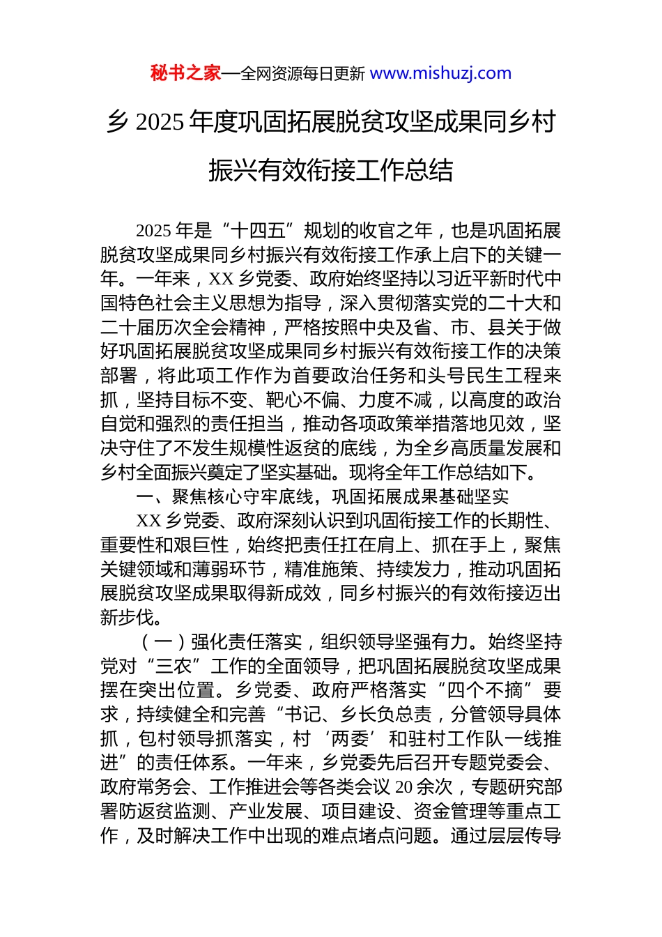 秘书之家—全网资源每日更新 www.mishuzj.com乡 2025 年度巩固拓展脱贫攻坚成果同乡村振兴有效衔接工作总结2025 年是“十四五”规划的收官之年,也是巩固拓展脱贫攻坚成果同乡村振兴有效衔接工作承上启下的关键一年。一年来,XX 乡党委、政府始终坚持以习近平新时代中国特色社会主义思想为指导,深入贯彻落实党的二十大和二十届历次全会精神,严格按照中央及省、市、县关于做好巩固拓展脱贫攻坚成果同乡村振兴有效衔接工作的决策部署,将此项工作作为首要政治任务和头号民生工程来抓,坚持目标不变、靶心不偏、力度不减,以高度的政治自觉和强烈的责任担当,推动各项政策举措落地见效,坚决守住了不发生规模性返贫的底线,为全乡高质量发展和乡村全面振兴奠定了坚实基础。现将全年工作总结如下。一、聚焦核心守牢底线,巩固拓展成果基础坚实XX 乡党委、政府深刻认识到巩固衔接工作的长期性、重要性和艰巨性,始终把责任扛在肩上、抓在手上,聚焦关键领域和薄弱环节,精准施策、持续发力,推动巩固拓展脱贫攻坚成果取得新成效,同乡村振兴的有效衔接迈出新步伐。(一)强化责任落实,组织领导坚强有力。始终坚持党对“三农”工作的全面领导,把巩固拓展脱贫攻坚成果摆在突出位置。乡党委、政府严格落实“四个不摘”要求,持续健全和完善“书记、乡长负总责,分管领导具体抓,包村领导抓落实,村‘两委’和驻村工作队一线推进”的责任体系。一年来,乡党委先后召开专题党委会、政府常务会、工作推进会等各类会议 20 余次,专题研究部署防返贫监测、产业发展、项目建设、资金管理等重点工作,及时解决工作中出现的难点堵点问题。通过层层传导秘书之家—全网资源每日更新 www.mishuzj.com压力、逐级压实责任,形成了上下贯通、齐抓共管、协同高效的工作格局,为各项任务的顺利推进提供了坚强的组织保障。同时,调整和优化了干部结对帮扶工作机制确保帮扶责任、政策、工作三到位,做到不留空白、不漏一户。(二)动态监测精准,返贫防线严密牢固。坚决把防止返贫动态监测和帮扶作为巩固拓展脱贫攻坚成果的首要任务,严格落实“早发现、早干预、早帮扶”的工作要求,建立健全了常态化排查与集中排查相结合、部门数据比对与农户自主申报相结合的多元化监测预警体系。通过网格员日常走访、驻村工作队定期排查和民政、医疗、教育等部门的信息共享联动,实现了对脱贫不稳定户、边缘易致贫户和突发严重困难户的精准识别和快速响应。截至2025 年 12 月底,全乡共识别纳入防返贫监测对象 58 户 215人全年新识别纳入 14 户 65 人,均严格按照识别程序进行了规范认定和系统录入。针对每一户监测对象,都制定了“一户一策”精准帮扶计划,明确帮扶责任人和具体帮扶措施,通过发展产业、稳定就业、落实兜底保障、提供临时救助等方式进行综合性帮扶。经过一年的努力,已成功消除返贫致贫风险 25 户 89 人,风险消除率稳步提升,风险消除程序规范有效,切实做到了应纳尽纳、应帮尽帮,牢牢守住了不发生规模性返贫的底线。(三)产业发展提质,内生动力持续增强。产业振兴是乡村振兴的重中之重,也是巩固脱贫攻坚成果的根本之策。XX 乡立足资源禀赋和产业基础,坚持长短结合、多业并举,大力发展特色优势产业,不断拓宽群众增收渠道。一是做优做强茶产业。依托得天独厚的生态优势,将茶产业作为富民强乡的支柱产业来抓,全乡茶叶种植面积稳定在 1850 亩,通过推广绿色防控技术和标准化生产流程,茶叶品质和效益显著提升。2025 年预计全年茶叶产量达 36 万斤,实现产值约 540 万元,仅春茶采摘一项就带动了超过秘书之家—全网资源每日更新 www.mishuzj.com220 名村民实现家门口就业增收。二是培育壮大特色种养业。围绕“11513”工程,积极发展肉牛产业,通过鼓励合作社规模化经营和支持养殖大户、家庭散养等多种模式,带动群众稳定增收。同时,大力发展烤烟、油茶、中药材、蔬菜等特色种植业,其中烤烟产业带动就业 300 余人,争取并投入农业产业发展资金 70 万元用于蔬菜种植和粉类加工厂建设推动了农业产业结构的优化升级。三是创新利益联结机制。全面推广“党支...