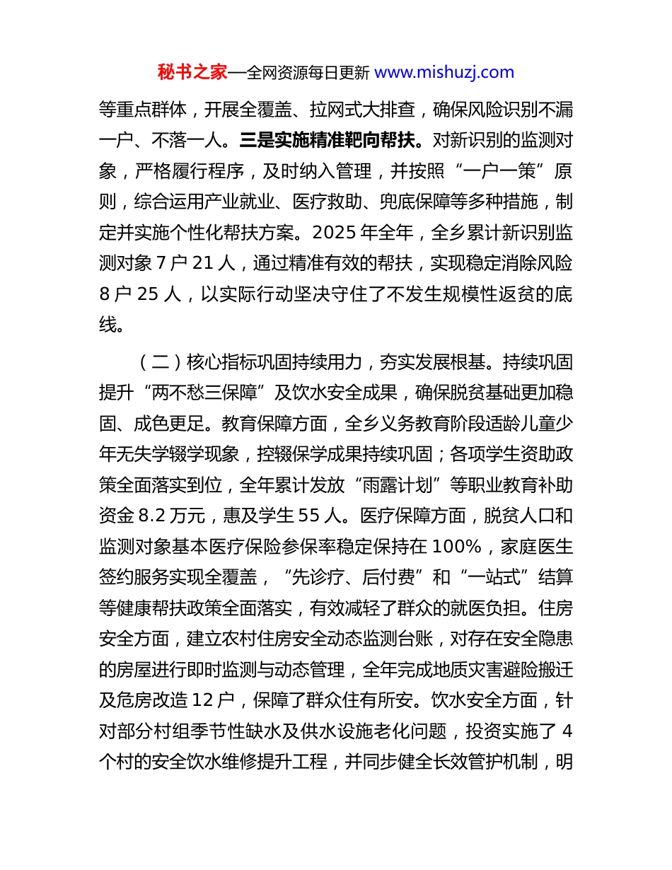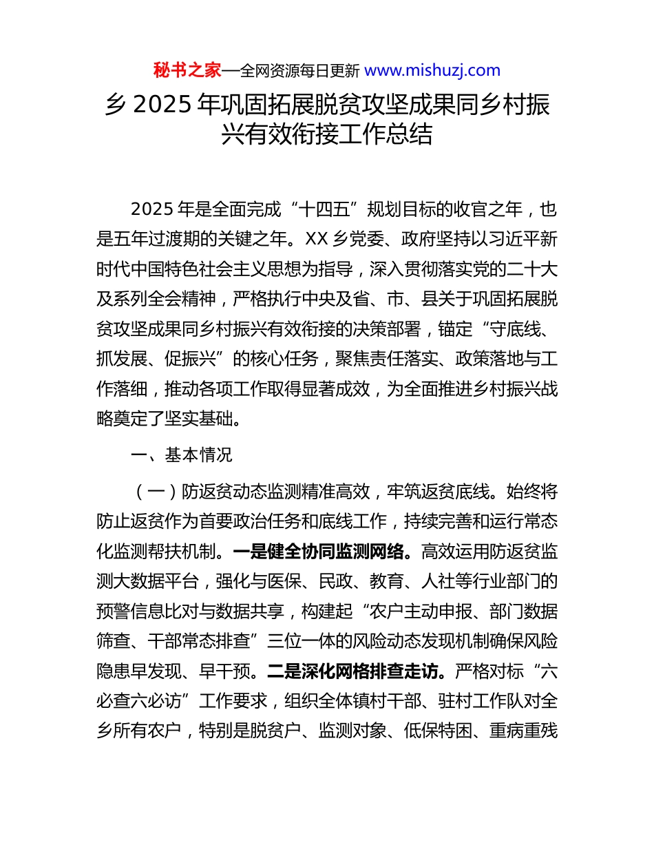 秘书之家—全网资源每日更新 www.mishuzj.com乡 2025 年巩固拓展脱贫攻坚成果同乡村振兴有效衔接工作总结2025 年是全面完成“十四五”规划目标的收官之年,也是五年过渡期的关键之年。XX 乡党委、政府坚持以习近平新时代中国特色社会主义思想为指导,深入贯彻落实党的二十大及系列全会精神,严格执行中央及省、市、县关于巩固拓展脱贫攻坚成果同乡村振兴有效衔接的决策部署,锚定“守底线、抓发展、促振兴”的核心任务,聚焦责任落实、政策落地与工作落细,推动各项工作取得显著成效,为全面推进乡村振兴战略奠定了坚实基础。一、基本情况(一)防返贫动态监测精准高效,牢筑返贫底线。始终将防止返贫作为首要政治任务和底线工作,持续完善和运行常态化监测帮扶机制。一是健全协同监测网络。高效运用防返贫监测大数据平台,强化与医保、民政、教育、人社等行业部门的预警信息比对与数据共享,构建起“农户主动申报、部门数据筛查、干部常态排查”三位一体的风险动态发现机制确保风险隐患早发现、早干预。二是深化网格排查走访。严格对标“六必查六必访”工作要求,组织全体镇村干部、驻村工作队对全乡所有农户,特别是脱贫户、监测对象、低保特困、重病重残秘书之家—全网资源每日更新 www.mishuzj.com等重点群体,开展全覆盖、拉网式大排查,确保风险识别不漏一户、不落一人。三是实施精准靶向帮扶。对新识别的监测对象,严格履行程序,及时纳入管理,并按照“一户一策”原则,综合运用产业就业、医疗救助、兜底保障等多种措施,制定并实施个性化帮扶方案。2025 年全年,全乡累计新识别监测对象 7 户 21 人,通过精准有效的帮扶,实现稳定消除风险8 户 25 人,以实际行动坚决守住了不发生规模性返贫的底线。(二)核心指标巩固持续用力,夯实发展根基。持续巩固提升“两不愁三保障”及饮水安全成果,确保脱贫基础更加稳固、成色更足。教育保障方面,全乡义务教育阶段适龄儿童少年无失学辍学现象,控辍保学成果持续巩固;各项学生资助政策全面落实到位,全年累计发放“雨露计划”等职业教育补助资金 8.2 万元,惠及学生 55 人。医疗保障方面,脱贫人口和监测对象基本医疗保险参保率稳定保持在 100%,家庭医生签约服务实现全覆盖,“先诊疗、后付费”和“一站式”结算等健康帮扶政策全面落实,有效减轻了群众的就医负担。住房安全方面,建立农村住房安全动态监测台账,对存在安全隐患的房屋进行即时监测与动态管理,全年完成地质灾害避险搬迁及危房改造 12 户,保障了群众住有所安。饮水安全方面,针对部分村组季节性缺水及供水设施老化问题,投资实施了 4个村的安全饮水维修提升工程,并同步健全长效管护机制,明秘书之家—全网资源每日更新 www.mishuzj.com晰管护责任主体,确保了供水水量稳定、水质达标。(三)特色产业发展提质增效,增强内生动力。立足资源禀承,持续做大做强乡村特色产业,拓宽群众稳定增收渠道。一是产业规模持续扩大。围绕烤烟、茶叶、肉牛、油茶、中药材等主导产业,大力推行“党支部+合作社+农户”等利益联结模式推动产业基地化、规模化发展。2025 年,全乡发展烤烟种植 3200 亩,预计产值超过 1280 万元,带动户均增收11 万元以上;茶叶种植面积稳定在 1850 亩,实现产值约540 万元;肉牛存栏量达到 6000 头以上,家庭牧场发展到50 余家,畜牧业生产稳中有进。此外,油茶、中药材等特色经作种植面积稳步增长,产业结构不断优化。二是利益联结更加紧密。积极培育新型农业经营主体,引导龙头企业、合作社与农户建立稳定的订单收购、股份合作、劳务用工等合作关系,让农户更深层次嵌入产业链,分享更多增值收益。全年共计发放到户产业奖补资金 350 余万元,有效激发了群众发展生产的内生动力。三是品牌建设与产销对接取得新突破。着力打造“XX 地域品牌”,提升农特产品附加值和市场竞争力。创新产销对接模式,积极运用电商直播、线上集市等新业态,成功举办多场次网络直播带货活动,有效拓宽了农产品销售渠道,切实增加了农民收入。(四)乡村建设行动扎实推进,人居环境显著改善。深入践行“绿水青山就是金山银山...
