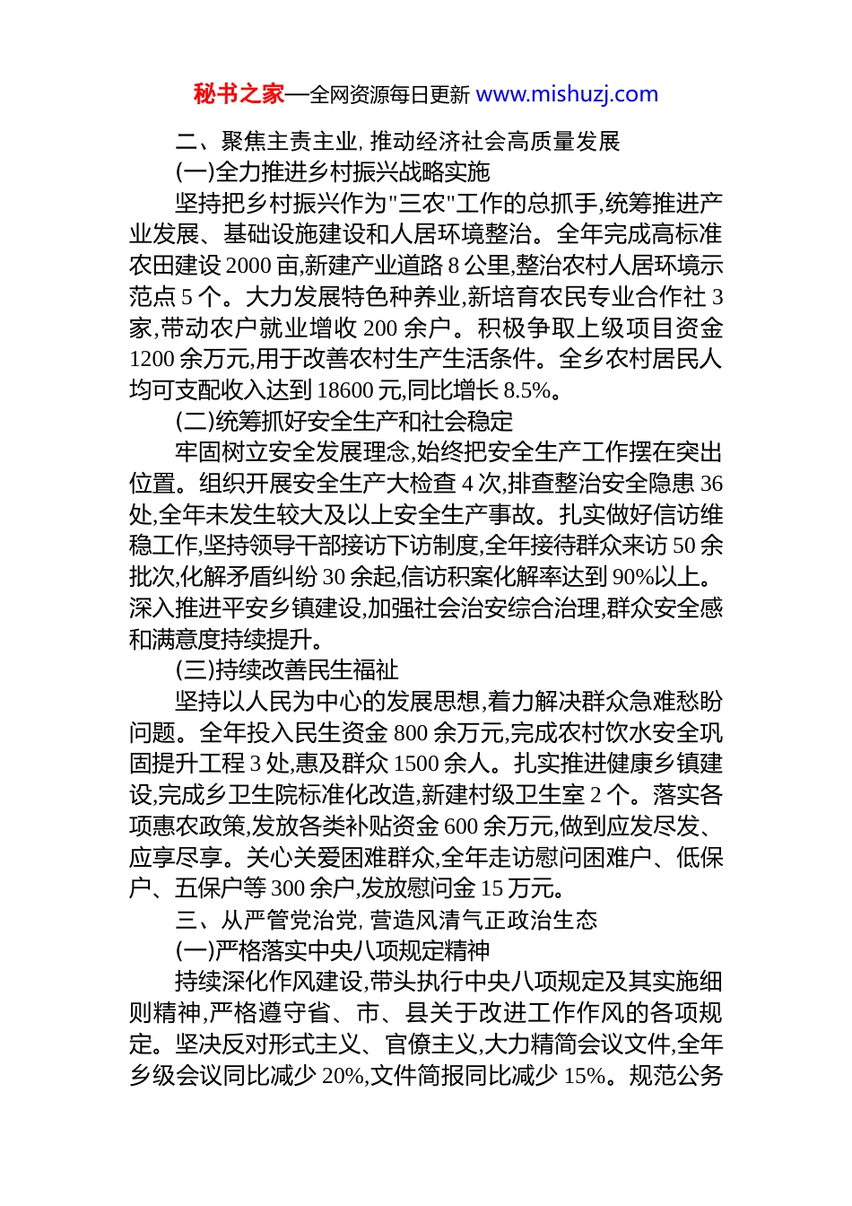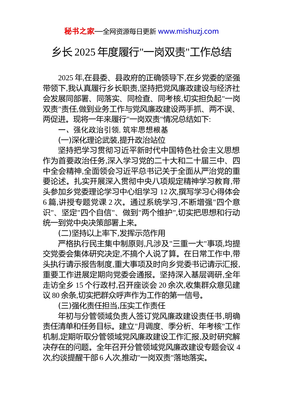 秘书之家—全网资源每日更新 www.mishuzj.com乡长 2025 年度履行"一岗双责"工作总结2025 年,在县委、县政府的正确领导下,在乡党委的坚强带领下,我认真履行乡长职责,坚持把党风廉政建设与经济社会发展同部署、同落实、同检查、同考核,切实担负起"一岗双责"责任,做到业务工作与党风廉政建设两手抓、两不误、两促进。现将一年来履行"一岗双责"情况总结如下:一、强化政治引领,筑牢思想根基(一)深化理论武装,提升政治站位坚持把学习贯彻习近平新时代中国特色社会主义思想作为首要政治任务,深入学习党的二十大和二十届三中、四中全会精神,全面领会习近平总书记关于全面从严治党的重要论述。扎实开展深入贯彻中央八项规定精神学习教育,带头参加乡党委理论学习中心组学习 12 次,撰写学习心得体会6 篇,讲授专题党课 2 次。通过系统学习,不断增强"四个意识"、坚定"四个自信"、做到"两个维护",切实把思想和行动统一到党中央决策部署上来。(二)坚持以上率下,发挥示范作用严格执行民主集中制原则,凡涉及"三重一大"事项,均提交党委会集体研究决定,不搞个人说了算。在日常工作中,带头执行请示报告制度,重大事项及时向乡党委书记请示汇报,重要工作进展定期向党委会通报。坚持深入基层调研,全年走访全乡 15 个行政村,召开座谈会 20 余次,收集群众意见建议 80 余条,切实把群众呼声作为工作的第一信号。(三)强化责任担当,压实工作责任年初与分管领域负责人签订党风廉政建设责任书,明确责任清单和任务目标。建立"月调度、季分析、年考核"工作机制,定期听取分管领域党风廉政建设工作汇报,及时研究解决存在的问题。全年召开分管领域党风廉政建设专题会议 4次,约谈提醒干部 6 人次,推动"一岗双责"落地落实。秘书之家—全网资源每日更新 www.mishuzj.com二、聚焦主责主业,推动经济社会高质量发展(一)全力推进乡村振兴战略实施坚持把乡村振兴作为"三农"工作的总抓手,统筹推进产业发展、基础设施建设和人居环境整治。全年完成高标准农田建设 2000 亩,新建产业道路 8 公里,整治农村人居环境示范点 5 个。大力发展特色种养业,新培育农民专业合作社 3家,带动农户就业增收 200 余户。积极争取上级项目资金1200 余万元,用于改善农村生产生活条件。全乡农村居民人均可支配收入达到 18600 元,同比增长 8.5%。(二)统筹抓好安全生产和社会稳定牢固树立安全发展理念,始终把安全生产工作摆在突出位置。组织开展安全生产大检查 4 次,排查整治安全隐患 36处,全年未发生较大及以上安全生产事故。扎实做好信访维稳工作,坚持领导干部接访下访制度,全年接待群众来访 50 余批次,化解矛盾纠纷 30 余起,信访积案化解率达到 90%以上。深入推进平安乡镇建设,加强社会治安综合治理,群众安全感和满意度持续提升。(三)持续改善民生福祉坚持以人民为中心的发展思想,着力解决群众急难愁盼问题。全年投入民生资金 800 余万元,完成农村饮水安全巩固提升工程 3 处,惠及群众 1500 余人。扎实推进健康乡镇建设,完成乡卫生院标准化改造,新建村级卫生室 2 个。落实各项惠农政策,发放各类补贴资金 600 余万元,做到应发尽发、应享尽享。关心关爱困难群众,全年走访慰问困难户、低保户、五保户等 300 余户,发放慰问金 15 万元。三、从严管党治党,营造风清气正政治生态(一)严格落实中央八项规定精神持续深化作风建设,带头执行中央八项规定及其实施细则精神,严格遵守省、市、县关于改进工作作风的各项规定。坚决反对形式主义、官僚主义,大力精简会议文件,全年乡级会议同比减少 20%,文件简报同比减少 15%。规范公务秘书之家—全网资源每日更新 www.mishuzj.com接待和公车使用管理,严格执行公务用车派车审批制度,全年"三公"经费支出同比下降 10%。加强对村级"三务"公开的监督指导,推动权力在阳光下运行。(二)加强对分管领域的监督管理认真履行对分管领域干部的教育监督管理职责,坚持抓早抓小、防微杜渐。定期与分管部门负责人开展廉政谈话,全年开展任前廉政谈话 3 人次、日常提醒谈话 8 人次。加强对重点岗位、关键环节的监督,特别是在项目建设、资金管理、惠农政策落实等方面,严格执行相...