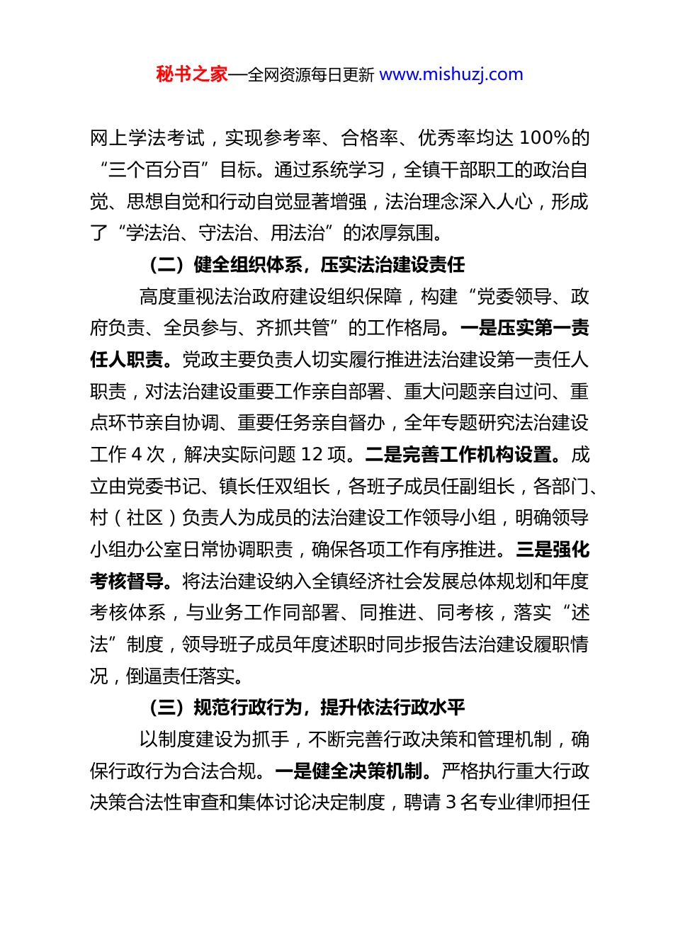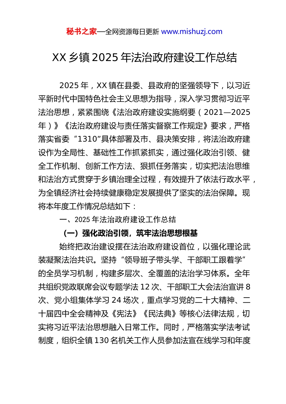 秘书之家—全网资源每日更新 www.mishuzj.comXX 乡镇 2025 年法治政府建设工作总结2025 年,XX 镇在县委、县政府的坚强领导下,以习近平新时代中国特色社会主义思想为指导,深入学习贯彻习近平法治思想,紧紧围绕《法治政府建设实施纲要(2021—2025年)》《法治政府建设与责任落实督察工作规定》要求,严格落实省委“1310”具体部署及市、县决策安排,将法治政府建设作为全局性、基础性工作抓紧抓实,通过强化政治引领、健全工作机制、创新工作方法、狠抓任务落实,切实把法治思维和法治方式贯穿于乡镇治理全过程,有效提升了依法行政水平,为全镇经济社会持续健康稳定发展提供了坚实的法治保障。现将本年度工作情况总结如下:一、2025 年法治政府建设工作总结(一)强化政治引领,筑牢法治思想根基始终把政治建设摆在法治政府建设首位,以强化理论武装凝聚法治共识。坚持“领导班子带头学、干部职工跟着学”的全员学习机制,构建多层次、全覆盖的法治学习体系。全年共组织党政联席会议专题学法 12 次、干部职工大会法治宣讲 8次、党小组集体学习 24 场次,重点学习党的二十大精神、二十届四中全会精神及《宪法》《民法典》等核心法律法规,切实将习近平法治思想融入日常工作。同时,严格落实学法考试制度,组织全镇 130 名机关工作人员参加法宣在线学习和年度秘书之家—全网资源每日更新 www.mishuzj.com网上学法考试,实现参考率、合格率、优秀率均达 100%的“三个百分百”目标。通过系统学习,全镇干部职工的政治自觉、思想自觉和行动自觉显著增强,法治理念深入人心,形成了“学法治、守法治、用法治”的浓厚氛围。(二)健全组织体系,压实法治建设责任高度重视法治政府建设组织保障,构建“党委领导、政府负责、全员参与、齐抓共管”的工作格局。一是压实第一责任人职责。党政主要负责人切实履行推进法治建设第一责任人职责,对法治建设重要工作亲自部署、重大问题亲自过问、重点环节亲自协调、重要任务亲自督办,全年专题研究法治建设工作 4 次,解决实际问题 12 项。二是完善工作机构设置。成立由党委书记、镇长任双组长,各班子成员任副组长,各部门、村(社区)负责人为成员的法治建设工作领导小组,明确领导小组办公室日常协调职责,确保各项工作有序推进。三是强化考核督导。将法治建设纳入全镇经济社会发展总体规划和年度考核体系,与业务工作同部署、同推进、同考核,落实“述法”制度,领导班子成员年度述职时同步报告法治建设履职情况,倒逼责任落实。(三)规范行政行为,提升依法行政水平以制度建设为抓手,不断完善行政决策和管理机制,确保行政行为合法合规。一是健全决策机制。严格执行重大行政决策合法性审查和集体讨论决定制度,聘请 3 名专业律师担任秘书之家—全网资源每日更新 www.mishuzj.com法律顾问,全程参与镇政府重大决策、合同签订、规范性文件制定等工作,全年完成合法性审查事项 36 件,有效防范决策法律风险。二是深化政务公开。通过乡镇门户网站、政务新媒体、村(居)务公开栏等渠道,主动公开政策文件、财政收支、行政执法、民生服务等信息 286 条,保障群众的知情权、参与权和监督权。三是加强规范性文件管理。开展规范性文件清理工作,对 2018 年以来制定的 18 件规范性文件进行全面梳理,废止失效文件 3 件,修改完善 2 件,确保文件时效性和合法性。(四)深化普法宣传,厚植全民法治素养围绕“八五”普法规划要求,创新宣传方式,丰富宣传内容,构建全方位法治宣传教育体系。一是聚焦重点时段和节点开展集中宣传。结合“开学第一课”“三八妇女维权月”“民法典宣传月”“6・26 禁毒宣传日”“全民国家安全教育日”“12・4 国家宪法日”等重要节点,组织司法所、综治办、妇联、派出所等部门,在村社区、学校、企业、工地等人员密集场所开展针对性宣传活动 26 场次,发放宣传资料 1.2 万余份,受教育群众达 8000 余人次。二是创新宣传载体拓宽覆盖面。充分利用乡镇微信公众号、村(社区)工作联络群、广播、电子屏等新媒体平台,定期推送法治知识、典型案例、宣传短视频等内容,全年发布...