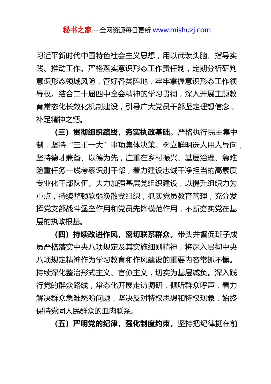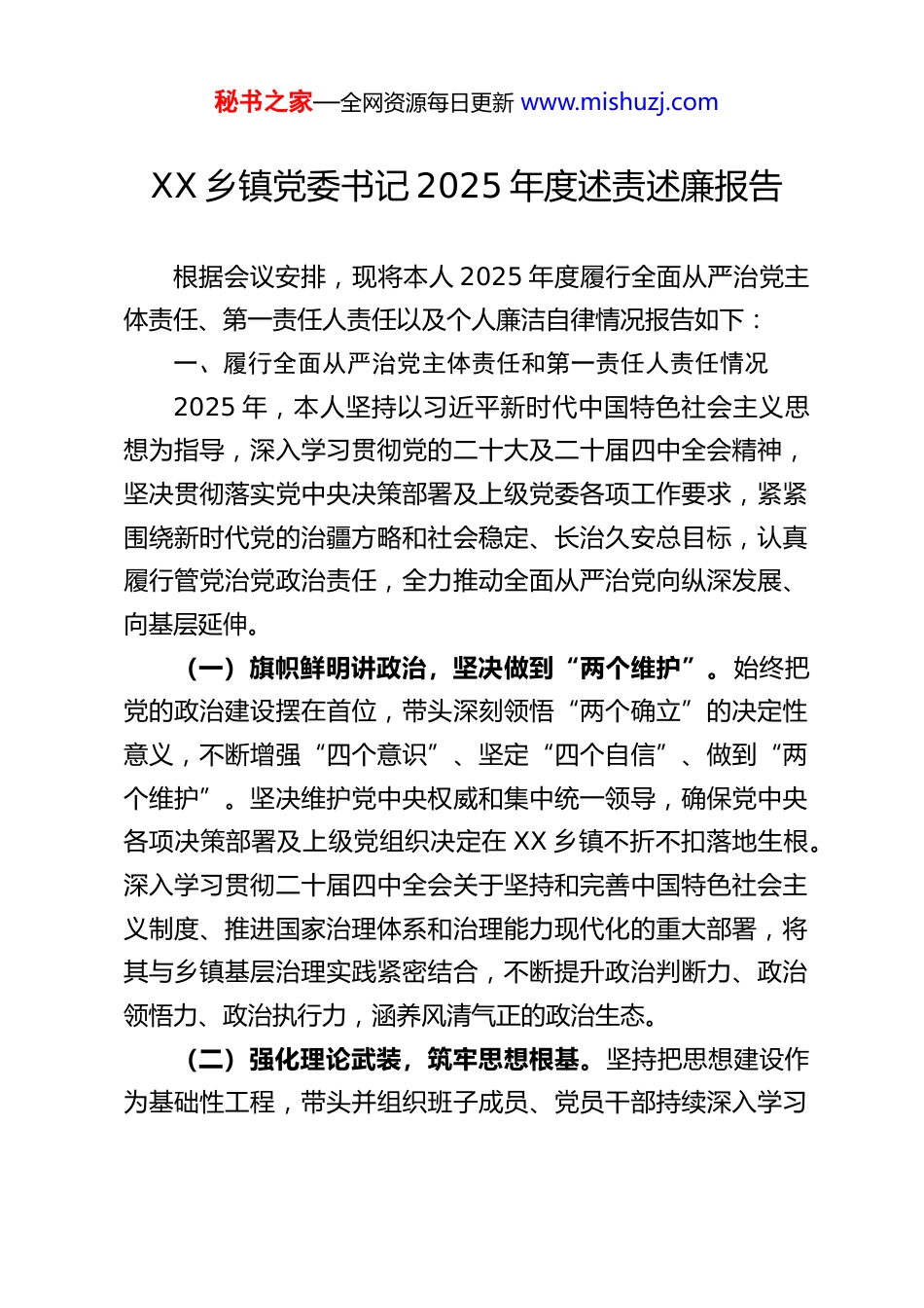 秘书之家—全网资源每日更新 www.mishuzj.comXX 乡镇党委书记 2025 年度述责述廉报告根据会议安排,现将本人 2025 年度履行全面从严治党主体责任、第一责任人责任以及个人廉洁自律情况报告如下:一、履行全面从严治党主体责任和第一责任人责任情况2025 年,本人坚持以习近平新时代中国特色社会主义思想为指导,深入学习贯彻党的二十大及二十届四中全会精神,坚决贯彻落实党中央决策部署及上级党委各项工作要求,紧紧围绕新时代党的治疆方略和社会稳定、长治久安总目标,认真履行管党治党政治责任,全力推动全面从严治党向纵深发展、向基层延伸。(一)旗帜鲜明讲政治,坚决做到“两个维护”。始终把党的政治建设摆在首位,带头深刻领悟“两个确立”的决定性意义,不断增强“四个意识”、坚定“四个自信”、做到“两个维护”。坚决维护党中央权威和集中统一领导,确保党中央各项决策部署及上级党组织决定在 XX 乡镇不折不扣落地生根。深入学习贯彻二十届四中全会关于坚持和完善中国特色社会主义制度、推进国家治理体系和治理能力现代化的重大部署,将其与乡镇基层治理实践紧密结合,不断提升政治判断力、政治领悟力、政治执行力,涵养风清气正的政治生态。(二)强化理论武装,筑牢思想根基。坚持把思想建设作为基础性工程,带头并组织班子成员、党员干部持续深入学习秘书之家—全网资源每日更新 www.mishuzj.com习近平新时代中国特色社会主义思想,用以武装头脑、指导实践、推动工作。严格落实意识形态工作责任制,定期分析研判意识形态领域风险,管好各类阵地,牢牢掌握意识形态工作领导权。结合二十届四中全会精神的学习贯彻,深入开展主题教育常态化长效化机制建设,引导广大党员干部坚定理想信念,补足精神之钙。(三)贯彻组织路线,夯实执政基础。严格执行民主集中制,坚持“三重一大”事项集体决策。树立鲜明选人用人导向,坚持德才兼备、以德为先,注重在乡村振兴、基层治理、急难险重任务一线考察识别干部,着力建设忠诚干净担当的高素质专业化干部队伍。大力加强基层党组织建设,以提升组织力为重点,持续整顿软弱涣散党组织,抓实党员教育管理,充分发挥党支部战斗堡垒作用和党员先锋模范作用,不断夯实党在基层的执政根基。(四)持续改进作风,密切联系群众。带头并督促班子成员严格落实中央八项规定及其实施细则精神,将深入贯彻中央八项规定精神作为学习教育和作风建设的重要内容常抓不懈。持续深化整治形式主义、官僚主义,切实为基层减负。深入践行党的群众路线,常态化开展走访调研,倾听群众呼声,着力解决群众急难愁盼问题,坚决反对特权思想和特权现象,始终保持党同人民群众的血肉联系。(五)严明党的纪律,强化制度约束。坚持把纪律挺在前秘书之家—全网资源每日更新 www.mishuzj.com面,重点强化政治纪律和组织纪律,带动廉洁纪律、群众纪律、工作纪律、生活纪律全面从严。加强纪律教育,使铁的纪律转化为党员干部的日常习惯和自觉遵循。注重制度治党、依规治党,牵头完善本乡镇党内相关制度规定,并严格督促执行,推动制度优势更好转化为治理效能。(六)扛牢主体责任,深化反腐倡廉。认真履行党风廉政建设第一责任人职责,坚持把党风廉政建设和反腐败工作与中心工作同部署、同落实、同检查、同考核。一体推进不敢腐、不能腐、不想腐体制机制建设,加强对权力运行的制约和监督。支持镇纪委履行监督责任,严肃查处违纪违法问题。扎实开展群众身边不正之风和腐败问题集中整治,切实维护群众利益,巩固发展反腐败斗争压倒性胜利。(七)强化系统观念,凝聚管党治党合力。坚持党委统一领导,支持和监督镇机关、各站所、各村(社区)党组织落实全面从严治党责任,形成齐抓共管的工作格局。自觉接受上级机关工委的指导督促,不断改进和加强机关党建工作。认真履行巡察整改主体责任,对上级巡视巡察反馈问题,主动认领、坚决整改、一抓到底。二、个人廉洁自律情况(一)始终对党忠诚,严守政治规矩。本人始终把“两个维护”作为最高政治原则和根本政治规矩,在思想上政治上行动上同以习近平同志为核心的党中央保持高度一致。在工作中秘书之家—全网...