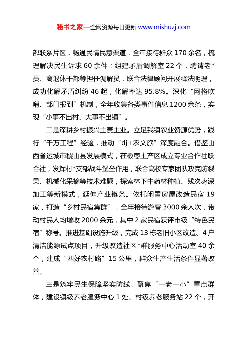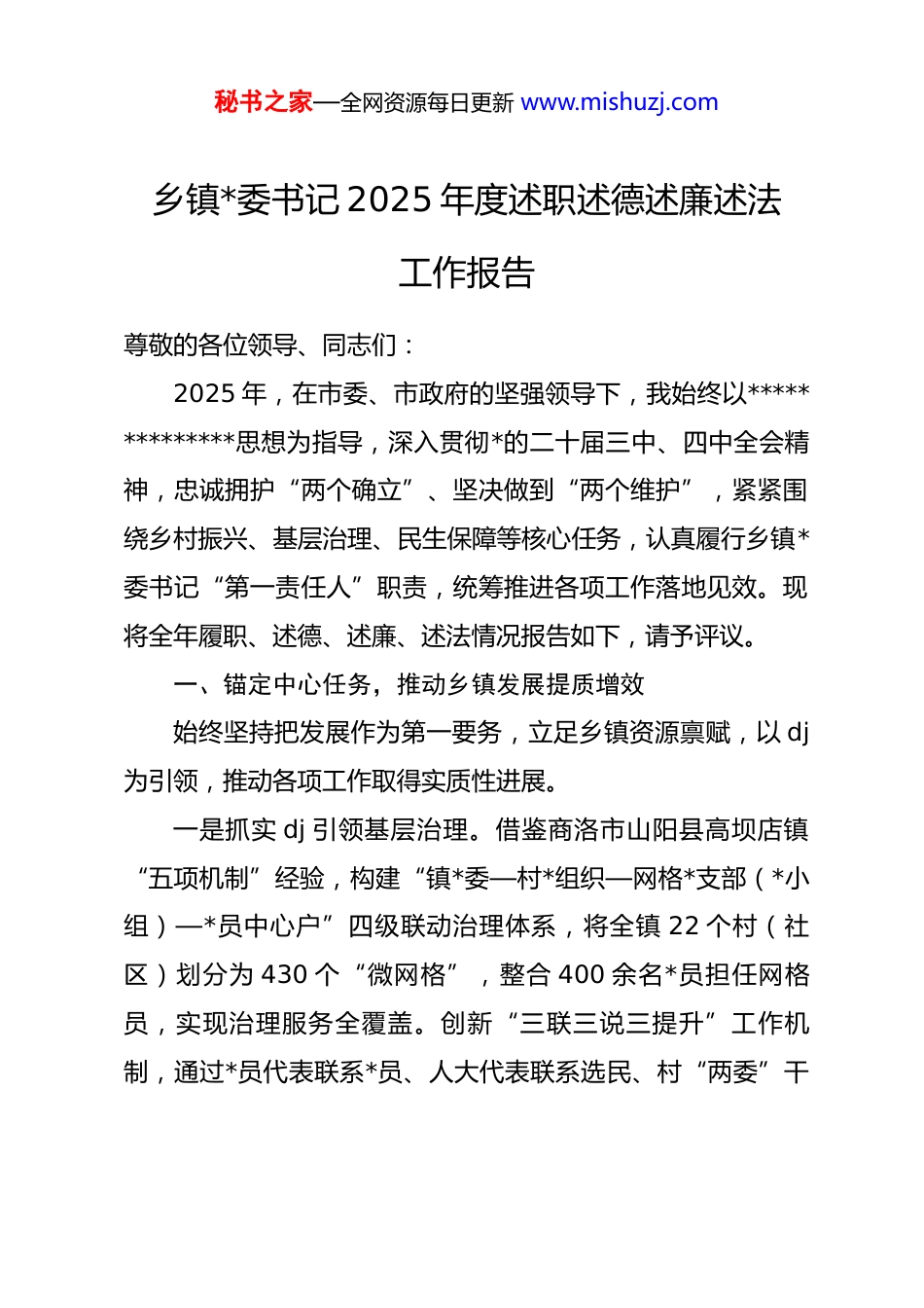 秘书之家—全网资源每日更新 www.mishuzj.com乡镇*委书记 2025 年度述职述德述廉述法工作报告尊敬的各位领导、同志们:2025 年,在市委、市政府的坚强领导下,我始终以**************思想为指导,深入贯彻*的二十届三中、四中全会精神,忠诚拥护“两个确立”、坚决做到“两个维护”,紧紧围绕乡村振兴、基层治理、民生保障等核心任务,认真履行乡镇*委书记“第一责任人”职责,统筹推进各项工作落地见效。现将全年履职、述德、述廉、述法情况报告如下,请予评议。一、锚定中心任务,推动乡镇发展提质增效始终坚持把发展作为第一要务,立足乡镇资源禀赋,以 dj为引领,推动各项工作取得实质性进展。一是抓实 dj 引领基层治理。借鉴商洛市山阳县高坝店镇“五项机制”经验,构建“镇*委—村*组织—网格*支部(*小组)—*员中心户”四级联动治理体系,将全镇 22 个村(社区)划分为 430 个“微网格”,整合 400 余名*员担任网格员,实现治理服务全覆盖。创新“三联三说三提升”工作机制,通过*员代表联系*员、人大代表联系选民、村“两委”干秘书之家—全网资源每日更新 www.mishuzj.com部联系片区,畅通民情民意渠道,全年接待群众 170 余名,梳理解决民生诉求 60 余件;组建矛盾调解室 22 个,聘请老*员、离退休干部等担任调解员,联合法律顾问开展释法明理,成功化解矛盾纠纷 46 起,化解率达 95.8%。深化“网格吹哨、部门报到”机制,全年收集各类事件信息 1200 余条,实现“小事不出村、大事不出镇”。二是深耕乡村振兴主责主业。立足我镇农业资源优势,践行“千万工程”经验,推动“dj+农文旅”深度融合。借鉴山西省运城市稷山县发展模式,在板枣主产区成立专业合作社联合社,发挥村*支部战斗堡垒作用,联合高校专家团队攻克防裂果、机械化采摘等技术难题,探索林下中药材种植、残次枣深加工等新模式,延伸产业链条。依托闲置房屋改造民宿 19家,打造“乡村民宿集群”,全年接待游客 3000 余人次,带动村民人均增收 2000 余元,其中 2 家民宿获评市级“特色民宿”称号。推进基础设施升级,完成 13 栋老旧小区改造、4 户清洁能源试点项目,升级改造社区*群服务中心活动室 40 余个,建成“四好农村路”15 公里,群众生产生活条件显著改善。三是筑牢民生保障坚实防线。聚焦“一老一小”重点群体,建设镇级养老服务中心 1 处、村级养老服务站 22 个,开秘书之家—全网资源每日更新 www.mishuzj.com展助餐、助医、助洁等志愿服务 500 余次,覆盖老年人 1200余人。推进教育优质均衡发展,改善乡村学校教学条件,协调资金修缮校舍 3000 平方米,补充教学设备 200 余套。扎实开展巩固拓展脱贫攻坚成果同乡村振兴有效衔接工作,动态监测脱贫户和监测户 156 户,落实帮扶措施 320 余项,确保不发生规模性返贫。二、坚守初心使命,涵养为民服务高尚情怀始终把品德修养放在首位,以良好的政德、公德、私德凝聚干事创业合力。一是恪守政德,绝对忠诚于*。坚持把政治建设摆在首位,深入学习贯彻**************思想,组织*委理论学习中心组学习 12 次、专题研讨 4 次,开展*的创新理论宣讲 29 次,覆盖*员群众 1900 余人,不断提高政治判断力、政治领悟力、政治执行力。严格执行民主集中制,落实“三重一大”决策制度,全年召开*委会 36 次,研究重大事项 58 项,确保决策科学民主。二是厚植公德,践行宗旨意识。始终坚持以人民为中心的发展思想,带头践行“四下基层”,深入田间地头、农户家中开展调研 8 次,解决群众急难愁盼问题 35 件。在老旧小区改造、民宿建设等项目推进中,主动倾听群众意见,优化施工方秘书之家—全网资源每日更新 www.mishuzj.com案,保障群众合法权益。倡导移风易俗,开展“好媳妇好婆婆”评选、文明集市等活动 12 场次,推动乡风文明持续提升。三是严修私德,树立良好家风。注重家庭家教家风建设,严格约束亲属和身边工作人员,自觉净化社交圈、生活圈、朋友圈。积极参与“弘扬清廉家风”巡回演讲等活动,以良好家风涵养清朗*风政风。三、严守纪律底线,营造风清气正政治生态始终把纪律和...