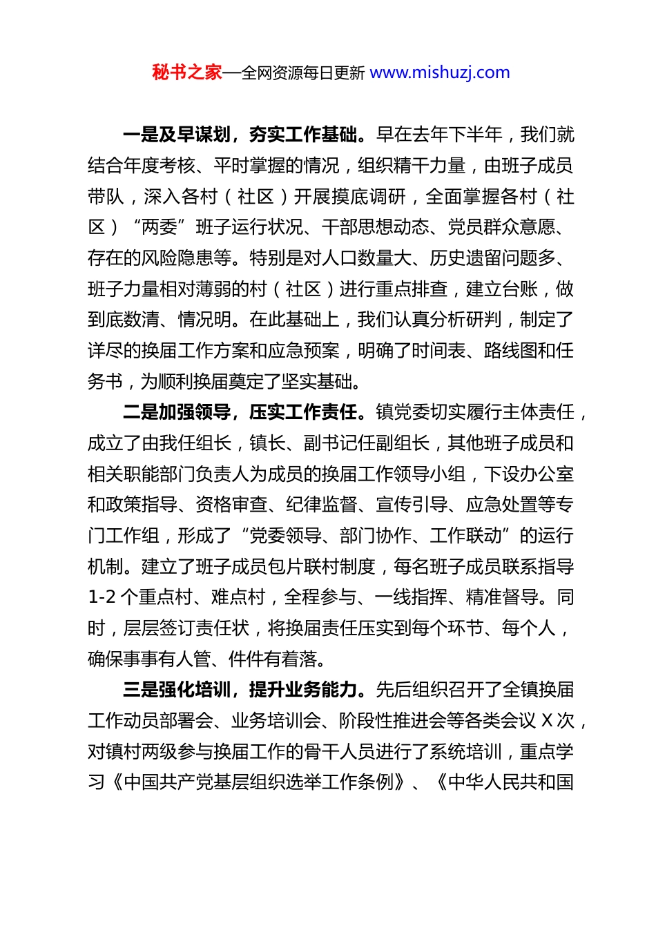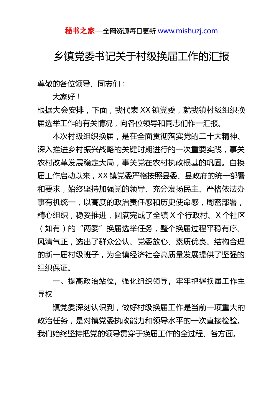 秘书之家—全网资源每日更新 www.mishuzj.com乡镇党委书记关于村级换届工作的汇报尊敬的各位领导、同志们:大家好!根据大会安排,下面,我代表 XX 镇党委,就我镇村级组织换届选举工作的有关情况,向各位领导和同志们作一汇报。本次村级组织换届,是在全面贯彻落实党的二十大精神、深入推进乡村振兴战略的关键时期进行的一次重要实践,事关农村改革发展稳定大局,事关党在农村执政根基的巩固。自换届工作启动以来,XX 镇党委严格按照县委、县政府的统一部署和要求,始终坚持加强党的领导、充分发扬民主、严格依法办事有机统一,以高度的政治责任感和历史使命感,周密部署,精心组织,稳妥推进,圆满完成了全镇 X 个行政村、X 个社区(如有)的“两委”换届选举任务,整个换届过程平稳有序、风清气正,选出了群众公认、党委放心、素质优良、结构合理的新一届村级班子,为全镇经济社会高质量发展提供了坚强的组织保证。一、提高政治站位,强化组织领导,牢牢把握换届工作主导权镇党委深刻认识到,做好村级换届工作是当前一项重大的政治任务,是对镇党委执政能力和领导水平的一次直接检验。我们始终坚持把党的领导贯穿于换届工作的全过程、各方面。秘书之家—全网资源每日更新 www.mishuzj.com一是及早谋划,夯实工作基础。早在去年下半年,我们就结合年度考核、平时掌握的情况,组织精干力量,由班子成员带队,深入各村(社区)开展摸底调研,全面掌握各村(社区)“两委”班子运行状况、干部思想动态、党员群众意愿、存在的风险隐患等。特别是对人口数量大、历史遗留问题多、班子力量相对薄弱的村(社区)进行重点排查,建立台账,做到底数清、情况明。在此基础上,我们认真分析研判,制定了详尽的换届工作方案和应急预案,明确了时间表、路线图和任务书,为顺利换届奠定了坚实基础。二是加强领导,压实工作责任。镇党委切实履行主体责任,成立了由我任组长,镇长、副书记任副组长,其他班子成员和相关职能部门负责人为成员的换届工作领导小组,下设办公室和政策指导、资格审查、纪律监督、宣传引导、应急处置等专门工作组,形成了“党委领导、部门协作、工作联动”的运行机制。建立了班子成员包片联村制度,每名班子成员联系指导1-2 个重点村、难点村,全程参与、一线指挥、精准督导。同时,层层签订责任状,将换届责任压实到每个环节、每个人,确保事事有人管、件件有着落。三是强化培训,提升业务能力。先后组织召开了全镇换届工作动员部署会、业务培训会、阶段性推进会等各类会议 X 次,对镇村两级参与换届工作的骨干人员进行了系统培训,重点学习《中国共产党基层组织选举工作条例》、《中华人民共和国秘书之家—全网资源每日更新 www.mishuzj.com村民委员会组织法》等法律法规以及上级关于换届工作的政策文件、纪律要求,确保工作人员熟练掌握换届选举的程序步骤、政策规定和操作要领,成为换届工作的“明白人”和“行家里手”。二、严格标准条件,规范操作程序,着力选优配强村级班子我们始终坚持正确的选人用人导向,严格把握候选人资格条件,规范选举操作流程,真正把那些政治素质好、道德品行好、带富能力强、协调能力强、服务意识强、群众威信高的优秀人才选进村级班子。一是树立鲜明导向,拓宽选人视野。我们明确提出,要突出“双好双强”标准,注重从本村致富能手、外出务工经商返乡人员、本乡本土大学毕业生、退役军人、乡村教师医生、退休干部等群体中选拔优秀人才。同时,积极鼓励和支持符合条件的妇女、年轻党员参选,确保班子结构优化。本次换届,我们成功吸引了 X 名优秀大学生、X 名退役军人、X 名返乡创业青年进入“两委”班子,为村级组织注入了新鲜血液。二是严格资格审查,筑牢“防火墙”。我们严格落实县里关于候选人资格联审机制的要求,由镇纪委、党建办、派出所、司法所、综治办、计生办、信访办等部门组成资格审查小组,对党组织委员、村(居)民委员会成员候选人预备人选进行严格审查,坚决把存在“十不准”、“十不宜”情形的人员挡在秘书之家—全网资源每日更新 www.mishuzj.com门外。全镇共对 X 名预备人选进行了资格审查,取...