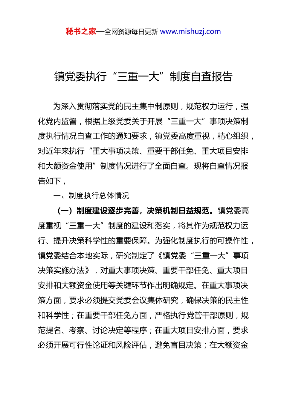 秘书之家—全网资源每日更新 www.mishuzj.com镇党委执行“三重一大”制度自查报告为深入贯彻落实党的民主集中制原则,规范权力运行,强化党内监督,根据上级党委关于开展“三重一大”事项决策制度执行情况自查工作的通知要求,镇党委高度重视,精心组织,对近年来执行“重大事项决策、重要干部任免、重大项目安排和大额资金使用”制度情况进行了全面自查。现将自查情况报告如下,一、制度执行总体情况(一)制度建设逐步完善,决策机制日益规范。镇党委高度重视“三重一大”制度的建设和落实,将其作为规范权力运行、提升决策科学性的重要保障。为强化制度执行的可操作性,镇党委结合本地实际,研究制定了《镇党委“三重一大”事项决策实施办法》,对重大事项决策、重要干部任免、重大项目安排和大额资金使用等关键环节作出明确规定。在重大事项决策方面,要求必须提交党委会议集体研究,确保决策的民主性和科学性;在重要干部任免方面,严格执行党管干部原则,规范提名、考察、讨论决定等程序;在重大项目安排方面,要求必须开展可行性论证和风险评估,避免盲目决策;在大额资金秘书之家—全网资源每日更新 www.mishuzj.com使用方面,严格落实预算管理和审批制度,确保资金使用合规高效。同时,镇党委还建立了动态调整机制,定期对制度进行修订完善,确保与上级最新政策要求保持一致,使制度始终具有针对性和实效性。(二)决策程序严格落实,民主集中制充分体现。在“三重一大”事项的具体决策过程中,镇党委始终坚持民主集中制原则,严格按照“集体领导、民主集中、个别酝酿、会议决定”的程序推进工作。决策前,通过召开党政联席会、专题调研、座谈会等形式广泛征求意见,对涉及群众切身利益或专业性较强的事项,还组织召开听证会或专家论证会,确保决策依据充分、民意基础扎实。决策中,严格执行提案、审议、表决等程序,班子成员逐一发表意见,主要领导实行末位表态,避免“一言堂”现象。决策后,建立跟踪督办机制,明确责任部门、完成时限和具体要求,并通过定期通报、专项督查等方式推动落实。近年来,镇党委累计研究“三重一大”事项***余项,均严格按照程序执行,未出现违规决策或擅自拍板的情况,有效保障了决策的规范性和权威性。(三)监督体系不断健全,权力运行透明可控。为确保“三重一大”制度真正落地见效,镇党委着力构建全方位、多层次的监督体系。在内部监督方面,成立由纪委书记担任组长秘书之家—全网资源每日更新 www.mishuzj.com的专项督查组,采取定期检查与随机抽查相结合的方式,对决策执行情况进行全程监督,并将制度落实情况纳入领导班子年度考核和述责述廉内容,强化责任追究。在外部监督方面,主动接受人大监督、审计监督和社会监督,通过政务公开栏、政府网站、微信公众号等平台及时公开决策事项,增强工作透明度。设立举报信箱、热线电话和网络留言板,广泛收集群众意见建议,对反映的问题及时核查整改。截至目前,已开展专项督查 8 次,发现并整改问题**个,群众对“三重一大”事项决策和执行的满意度达到**%以上,形成了权力运行公开透明、监督制约有力有效的良好局面。二、存在的主要问题(一)制度认知存在短板,执行细节需进一步细化。部分班子成员和职能部门对“三重一大”制度的内涵理解不够深入,存在“重形式轻内容”现象。例如,在重大项目安排中,对“可行性论证”的标准把握不一,个别项目前期调研不充分,导致实施过程中出现调整;在大额资金使用上,对“大额”的界定仍依赖经验判断,缺乏量化标准。制度条款中部分程序性规定较为原则化,操作性不强,需结合镇情进一步细化。(二)决策参与度不均衡,民主氛围有待提升。虽然严格履行了会议表决程序,但个别事项的酝酿阶段存在“少数人决秘书之家—全网资源每日更新 www.mishuzj.com策”倾向。部分班子成员在讨论时发言主动性不足,存在“随大流”心态,尤其对非分管领域的议题缺乏深入研究,导致决策质量打折扣。普通党员和群众参与决策的渠道有限,虽设有听证环节,但实际参与人数较少,代表性不足,未能充分体现“从群众中来,到群众中去”的工作方法。(三)监督问责力...