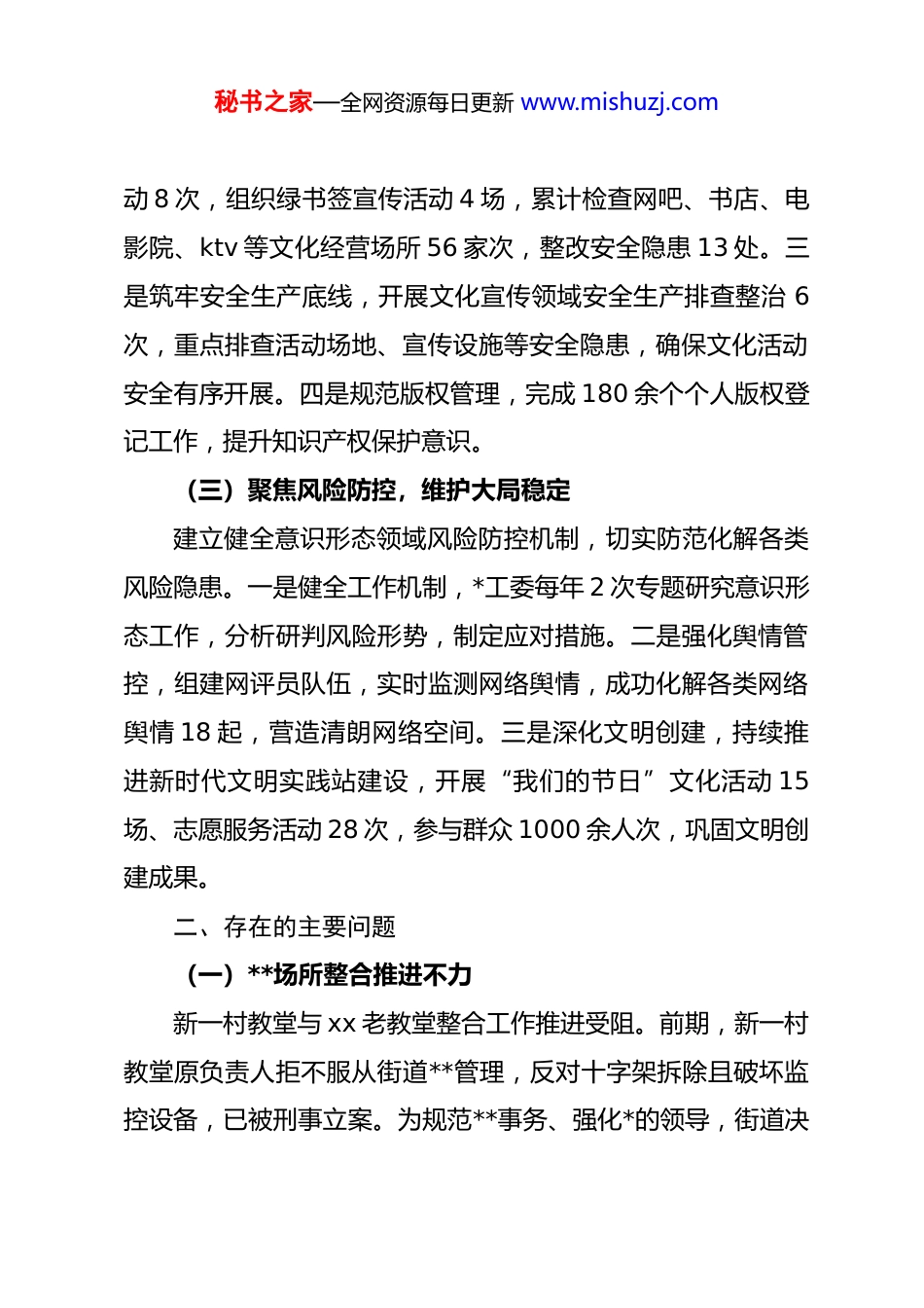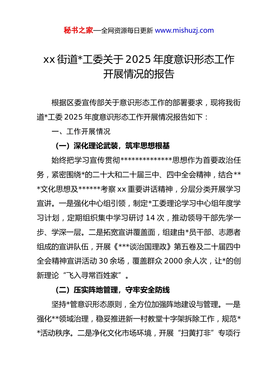 秘书之家—全网资源每日更新 www.mishuzj.comxx 街道*工委关于 2025 年度意识形态工作开展情况的报告根据区委宣传部关于意识形态工作的部署要求,现将我街道*工委 2025 年度意识形态工作开展情况报告如下:一、工作开展情况(一)深化理论武装,筑牢思想根基始终把学习宣传贯彻**************思想作为首要政治任务,紧密围绕*的二十大和二十届三中、四中全会精神,结合***文化思想及******考察 xx 重要讲话精神,分层分类开展学习宣讲。一是强化中心组引领,制定*工委理论学习中心组年度学习计划,定期组织集中学习研讨 14 次,推动领导干部先学一步、学深一层。二是拓宽宣讲覆盖面,组建由*员干部、志愿者组成的宣讲队伍,开展《***谈治国理政》第五卷及二十届四中全会精神宣讲活动 30 余场,覆盖群众 2000 余人次,让*的创新理论“飞入寻常百姓家”。(二)压实阵地管理,守牢安全防线坚持*管意识形态原则,全方位加强阵地建设与管理。一是强化**领域治理,稳妥推进新一村教堂十字架拆除工作,规范**活动秩序。二是净化文化市场环境,开展“扫黄打非”专项行秘书之家—全网资源每日更新 www.mishuzj.com动 8 次,组织绿书签宣传活动 4 场,累计检查网吧、书店、电影院、ktv 等文化经营场所 56 家次,整改安全隐患 13 处。三是筑牢安全生产底线,开展文化宣传领域安全生产排查整治 6次,重点排查活动场地、宣传设施等安全隐患,确保文化活动安全有序开展。四是规范版权管理,完成 180 余个个人版权登记工作,提升知识产权保护意识。(三)聚焦风险防控,维护大局稳定建立健全意识形态领域风险防控机制,切实防范化解各类风险隐患。一是健全工作机制,*工委每年 2 次专题研究意识形态工作,分析研判风险形势,制定应对措施。二是强化舆情管控,组建网评员队伍,实时监测网络舆情,成功化解各类网络舆情 18 起,营造清朗网络空间。三是深化文明创建,持续推进新时代文明实践站建设,开展“我们的节日”文化活动 15场、志愿服务活动 28 次,参与群众 1000 余人次,巩固文明创建成果。二、存在的主要问题(一)**场所整合推进不力新一村教堂与 xx 老教堂整合工作推进受阻。前期,新一村教堂原负责人拒不服从街道**管理,反对十字架拆除且破坏监控设备,已被刑事立案。为规范**事务、强化*的领导,街道决秘书之家—全网资源每日更新 www.mishuzj.com定两教堂合并管理,但双方就合并后管理班子组成、议事机制等核心问题分歧严重,多次协商无果。加之街道对**界人士思想疏导不深、沟通缺乏持续性,未及时搭建有效协商平台,导致整合工作长期停留在方案阶段,未取得实质性进展。(二)网络舆情应对处置存在短板舆情应对体系不完善,存在“被动应对”现象。一是舆情监测不够精准,网评员队伍专业能力不足,缺乏系统培训,对辖区重点领域、敏感问题的舆情捕捉不及时,曾出现某小区物业纠纷舆情发酵 12 小时后才发现的情况。二是处置流程不规范,未制定标准化的舆情应急处置手册,面对突发舆情时,部门之间协同联动不畅,存在信息上报延迟、回应口径不统一等问题。如本年度某学校甲流事件引发网络热议,导致负面言论扩散,影响了政府公信力。三是舆情引导能力薄弱,网评员发布的正面评论内容单一、说服力不足,难以有效引导网络舆论走向。(三)村改居新时代文明实践站管理薄弱部分村改居新时代文明实践站存在“重建设、轻管理”问题,服务效能未充分发挥。如南圩社区新时代文明实践站,虽挂牌成立但日常管理松散,功能室指示不明确,存在“门落锁、桌落灰”的现象。站内志愿者队伍结构不合理,以社区干秘书之家—全网资源每日更新 www.mishuzj.com部为主,缺乏专业人才和热心群众参与,志愿服务针对性不强。活动开展形式单一,多以政策宣讲为主,未能结合村改居群众的实际需求设计文化活动,导致群众参与度不高,未能真正发挥凝聚群众、服务群众的作用。三、下一步工作思路(一)强化理论武装,提升思想引领力持续深化*的创新理论学习宣传,优化*工委理论学习中心组学习制度,增加***文化思想专题学习研讨频次。升级宣讲模式,打造“线上+线下”...