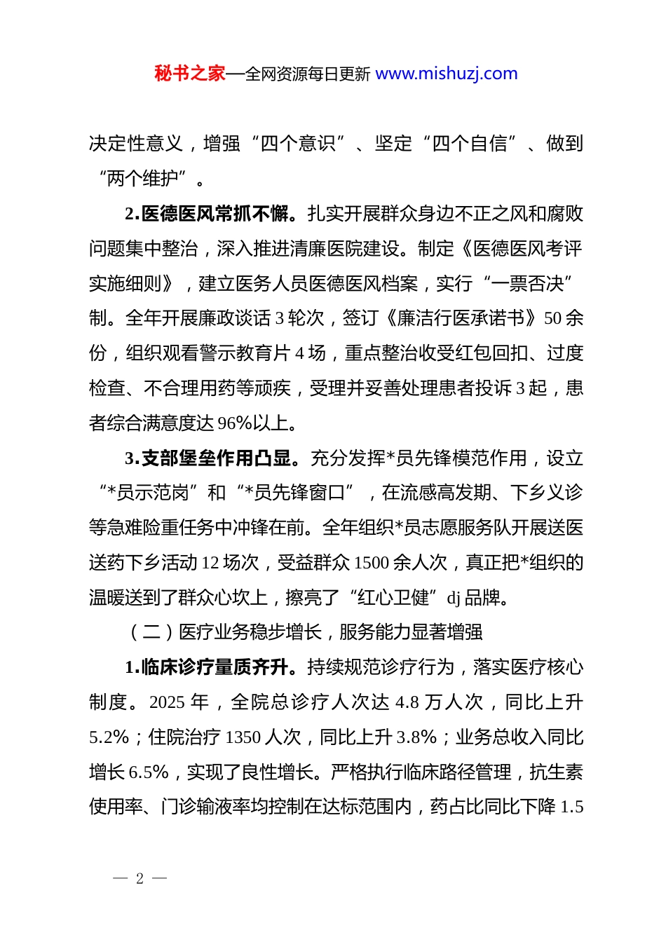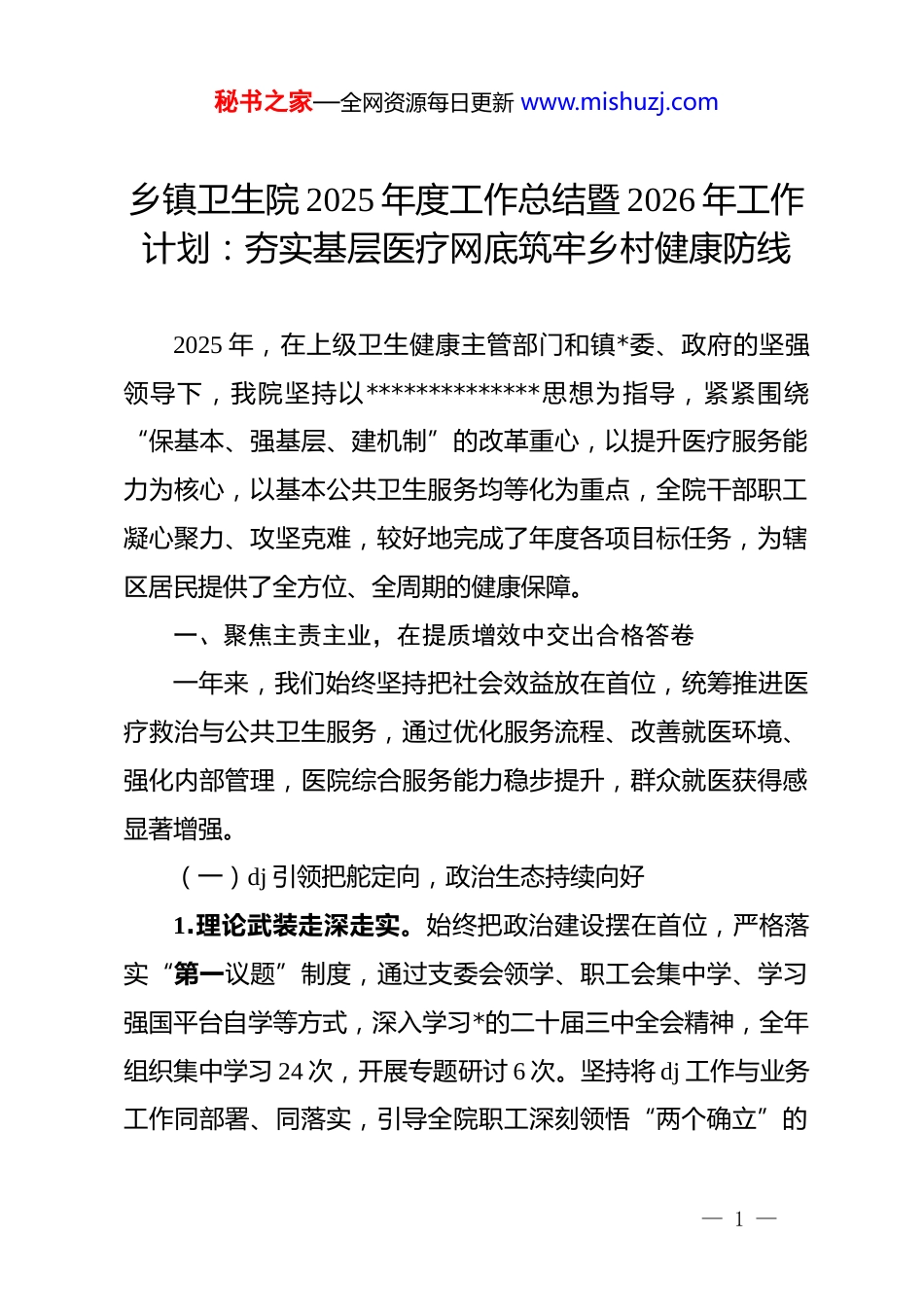 秘书之家—全网资源每日更新 www.mishuzj.com乡镇卫生院 2025 年度工作总结暨 2026 年工作计划:夯实基层医疗网底筑牢乡村健康防线2025 年,在上级卫生健康主管部门和镇*委、政府的坚强领导下,我院坚持以**************思想为指导,紧紧围绕“保基本、强基层、建机制”的改革重心,以提升医疗服务能力为核心,以基本公共卫生服务均等化为重点,全院干部职工凝心聚力、攻坚克难,较好地完成了年度各项目标任务,为辖区居民提供了全方位、全周期的健康保障。一、聚焦主责主业,在提质增效中交出合格答卷一年来,我们始终坚持把社会效益放在首位,统筹推进医疗救治与公共卫生服务,通过优化服务流程、改善就医环境、强化内部管理,医院综合服务能力稳步提升,群众就医获得感显著增强。(一)dj 引领把舵定向,政治生态持续向好1.理论武装走深走实。始终把政治建设摆在首位,严格落实“第一议题”制度,通过支委会领学、职工会集中学、学习强国平台自学等方式,深入学习*的二十届三中全会精神,全年组织集中学习 24 次,开展专题研讨 6 次。坚持将 dj 工作与业务工作同部署、同落实,引导全院职工深刻领悟“两个确立”的— 1 —秘书之家—全网资源每日更新 www.mishuzj.com决定性意义,增强“四个意识”、坚定“四个自信”、做到“两个维护”。2.医德医风常抓不懈。扎实开展群众身边不正之风和腐败问题集中整治,深入推进清廉医院建设。制定《医德医风考评实施细则》,建立医务人员医德医风档案,实行“一票否决”制。全年开展廉政谈话 3 轮次,签订《廉洁行医承诺书》50 余份,组织观看警示教育片 4 场,重点整治收受红包回扣、过度检查、不合理用药等顽疾,受理并妥善处理患者投诉 3 起,患者综合满意度达 96%以上。3.支部堡垒作用凸显。充分发挥*员先锋模范作用,设立“*员示范岗”和“*员先锋窗口”,在流感高发期、下乡义诊等急难险重任务中冲锋在前。全年组织*员志愿服务队开展送医送药下乡活动 12 场次,受益群众 1500 余人次,真正把*组织的温暖送到了群众心坎上,擦亮了“红心卫健”dj 品牌。(二)医疗业务稳步增长,服务能力显著增强1.临床诊疗量质齐升。持续规范诊疗行为,落实医疗核心制度。2025 年,全院总诊疗人次达 4.8 万人次,同比上升5.2%;住院治疗 1350 人次,同比上升 3.8%;业务总收入同比增长 6.5%,实现了良性增长。严格执行临床路径管理,抗生素使用率、门诊输液率均控制在达标范围内,药占比同比下降 1.5— 2 —秘书之家—全网资源每日更新 www.mishuzj.com个百分点,有效减轻了群众就医负担。2.中医特色优势彰显。大力推进“中医馆”内涵建设,提升中医药服务能力。新增中医适宜技术 2 项,常态化开展针灸、推拿、拔罐、理疗等 6 类 15 项中医服务。积极推广中医药在慢性病防治和疾病康复中的应用,全年门诊中药处方占比达35%,中医非药物疗法治疗人次同比增长 12%,中医药服务“简、便、验、廉”的优势得到充分发挥,深受农村老年患者欢迎。3.医疗质量严守底线。始终绷紧医疗安全这根弦,完善医疗质量管理委员会职能,坚持每月开展一次医疗质量与安全分析会,每季度进行一次病历处方点评。全年抽查运行病历 800余份,归档病历合格率达 98%以上。加强院感防控管理,严格执行预检分诊、医疗废物处置和消毒隔离制度,全年无院内感染暴发事件和重大医疗事故发生。(三)公卫服务精准落实,健康防线更加牢固1.重点人群管理规范化。做实做细国家基本公共卫生服务项目,依托家庭医生签约服务团队,对辖区重点人群实行网格化管理。截至 2025 年底,辖区常住人口电子健康档案建档率达92%;65 岁以上老年人健康管理率达 78%;高血压患者规范管理率达 82%,糖尿病患者规范管理率达 80%。特别是针对行动— 3 —秘书之家—全网资源每日更新 www.mishuzj.com不便的老年人,开展上门随访服务 3200 余人次,实现了健康管理“零距离”。2.妇幼计免工作精细化。扎实推进孕产妇和 0-6 岁儿童健康管理,早孕建册率达 95%以上,产后访视率达 98%。规范预防接种门诊建设,严格执行“三查七对一验证”,全年完...
