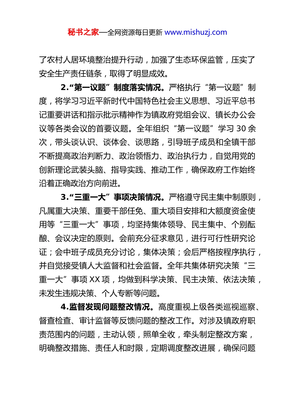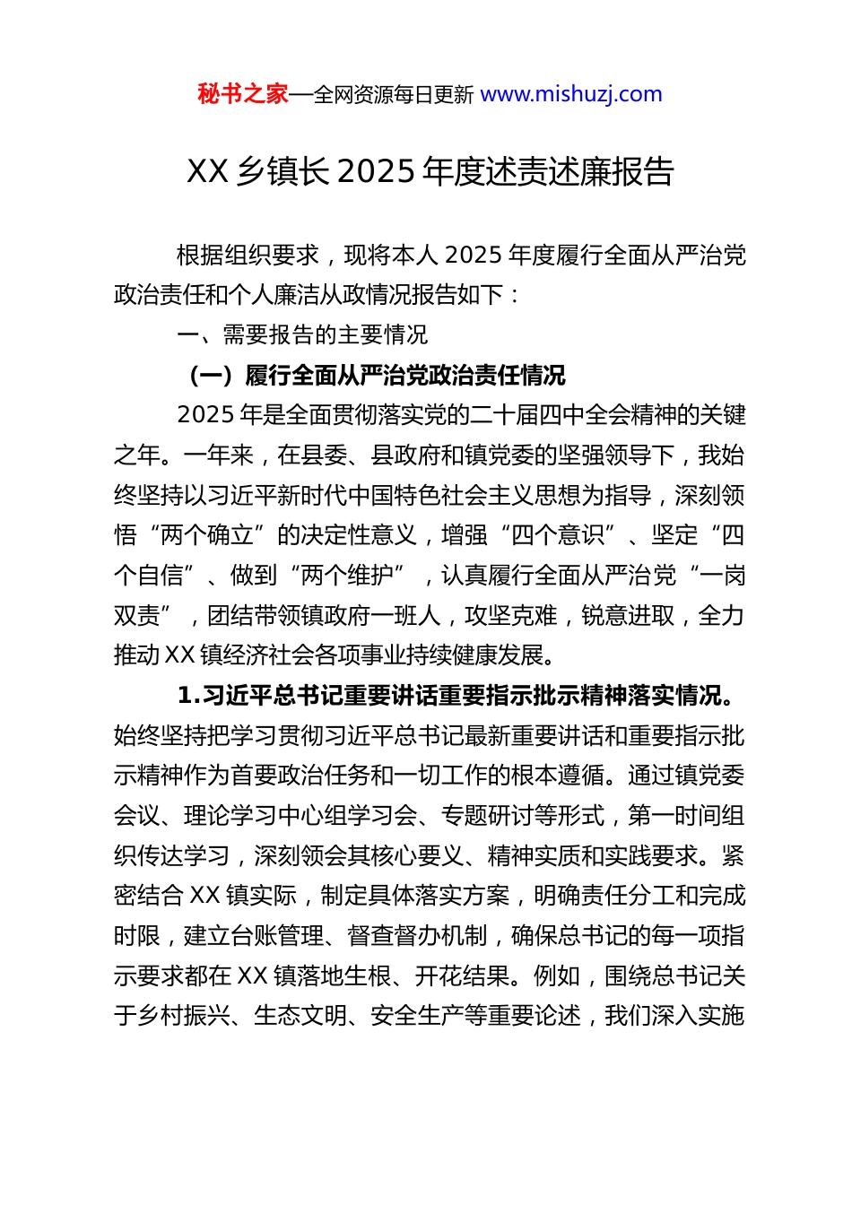 秘书之家—全网资源每日更新 www.mishuzj.comXX 乡镇长 2025 年度述责述廉报告根据组织要求,现将本人 2025 年度履行全面从严治党政治责任和个人廉洁从政情况报告如下:一、需要报告的主要情况(一)履行全面从严治党政治责任情况2025 年是全面贯彻落实党的二十届四中全会精神的关键之年。一年来,在县委、县政府和镇党委的坚强领导下,我始终坚持以习近平新时代中国特色社会主义思想为指导,深刻领悟“两个确立”的决定性意义,增强“四个意识”、坚定“四个自信”、做到“两个维护”,认真履行全面从严治党“一岗双责”,团结带领镇政府一班人,攻坚克难,锐意进取,全力推动 XX 镇经济社会各项事业持续健康发展。1.习近平总书记重要讲话重要指示批示精神落实情况。始终坚持把学习贯彻习近平总书记最新重要讲话和重要指示批示精神作为首要政治任务和一切工作的根本遵循。通过镇党委会议、理论学习中心组学习会、专题研讨等形式,第一时间组织传达学习,深刻领会其核心要义、精神实质和实践要求。紧密结合 XX 镇实际,制定具体落实方案,明确责任分工和完成时限,建立台账管理、督查督办机制,确保总书记的每一项指示要求都在 XX 镇落地生根、开花结果。例如,围绕总书记关于乡村振兴、生态文明、安全生产等重要论述,我们深入实施秘书之家—全网资源每日更新 www.mishuzj.com了农村人居环境整治提升行动,加强了生态环保监管,压实了安全生产责任链条,取得了明显成效。2.“第一议题”制度落实情况。严格执行“第一议题”制度,将学习习近平新时代中国特色社会主义思想、习近平总书记重要讲话和指示批示精神作为镇政府党组会议、镇长办公会议等各类会议的首要议题。全年组织“第一议题”学习 30 余次,带头谈认识、谈体会、谈思路,引导班子成员和全镇干部不断提高政治判断力、政治领悟力、政治执行力,自觉用党的创新理论武装头脑、指导实践、推动工作,确保政府工作始终沿着正确政治方向前进。3.“三重一大”事项决策情况。严格遵守民主集中制原则,凡属重大决策、重要干部任免、重大项目安排和大额度资金使用等“三重一大”事项,均坚持集体领导、民主集中、个别酝酿、会议决定的原则。会前充分征求意见,进行可行性研究论证;会中班子成员充分讨论,集体决策;会后严格按程序执行,并自觉接受镇人大监督和社会监督。全年共集体研究决策“三重一大”事项 XX 项,均做到科学决策、民主决策、依法决策,未发生违规决策、个人专断等问题。4.监督发现问题整改情况。高度重视上级各类巡视巡察、督查检查、审计监督等反馈问题的整改工作。对涉及镇政府职责范围内的问题,主动认领,照单全收,牵头制定整改方案,明确整改措施、责任人和时限,定期调度整改进展,确保问题秘书之家—全网资源每日更新 www.mishuzj.com真改实改、彻底整改。同时,注重举一反三,建章立制,堵塞漏洞,形成长效机制。例如,针对上级环保督察反馈的 XX 问题,我们不仅按时保质完成了整改任务,还修订完善了《XX 镇生态环境保护工作责任制》等 3 项制度,推动了全镇生态环境治理能力的提升。5.以案促改情况。深刻汲取近年来发生在身边的一些违纪违法案件教训,认真组织开展以案促改工作。通过召开警示教育大会、观看警示教育片、参观廉政教育基地、剖析典型案例等方式,教育引导全镇干部知敬畏、存戒惧、守底线。针对案件暴露出的制度机制漏洞和廉政风险点,组织相关科室深入排查,修订完善了《XX 镇财政资金管理办法》《XX 镇工程项目管理实施细则》等制度规定 X 项,扎紧了制度笼子,强化了风险防控。6.其他有关情况。认真贯彻落实党的二十届四中全会精神,将其作为谋划推进政府工作的总纲。围绕全会关于坚持和完善中国特色社会主义制度、推进国家治理体系和治理能力现代化的部署要求,结合我镇实际,重点在提升基层治理效能、优化营商环境、完善公共服务体系等方面下功夫,推动制度优势更好转化为治理效能。同时,持续深入开展贯彻中央八项规定精神学习教育,将其纳入干部日常教育培训的重要内容,紧盯“四风”隐形变异新动向,坚决防止反弹回潮。(二)个人廉洁从政情况秘...