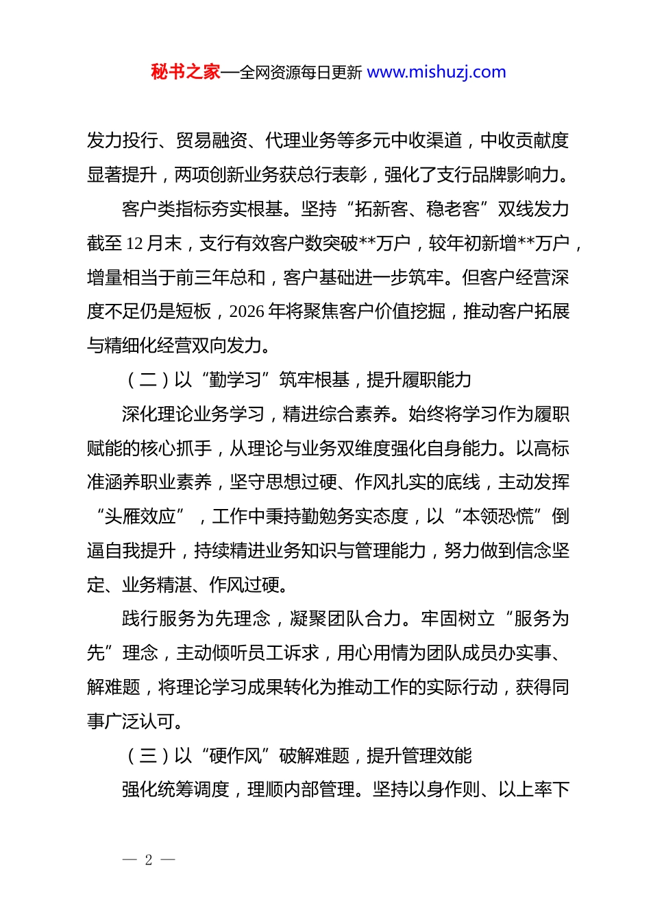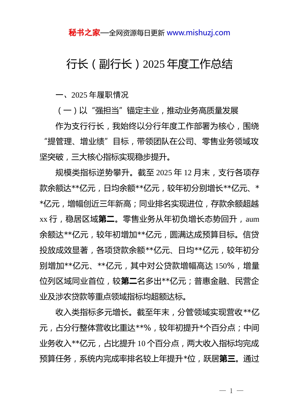 秘书之家—全网资源每日更新 www.mishuzj.com行长(副行长)2025 年度工作总结一、2025 年履职情况(一)以“强担当”锚定主业,推动业务高质量发展作为支行行长,我始终以分行年度工作部署为核心,围绕“提管理、增业绩”目标,带领团队在公司、零售业务领域攻坚突破,三大核心指标实现稳步提升。规模类指标逆势攀升。截至 2025 年 12 月末,支行各项存款余额达**亿元,日均余额**亿元,较年初分别增长**亿元、**亿元,增幅创近三年新高;同业排名实现进位,存款余额超越xx 行,稳居区域第二。零售业务从年初负增长态势回升,aum余额达**亿元,较年初增加**亿元,圆满达成预算目标。信贷投放成效显著,各项贷款余额**亿元、日均**亿元,较年初分别增加**亿元、**亿元,其中对公贷款增幅高达 150%,增量位列区域同业首位,较第二名多出**亿元;普惠金融、民营企业及涉农贷款等重点领域指标均超额达标。收入类指标多元增长。截至年末,分管领域实现营收**亿元,占分行整体营收比重达**%,较年初提升*个百分点;中间业务收入**亿元,占比提升 10 个百分点,两大收入指标均完成预算任务,系统内完成率排名较上年提升*位,跃居第三。通过— 1 —秘书之家—全网资源每日更新 www.mishuzj.com发力投行、贸易融资、代理业务等多元中收渠道,中收贡献度显著提升,两项创新业务获总行表彰,强化了支行品牌影响力。客户类指标夯实根基。坚持“拓新客、稳老客”双线发力截至 12 月末,支行有效客户数突破**万户,较年初新增**万户,增量相当于前三年总和,客户基础进一步筑牢。但客户经营深度不足仍是短板,2026 年将聚焦客户价值挖掘,推动客户拓展与精细化经营双向发力。(二)以“勤学习”筑牢根基,提升履职能力深化理论业务学习,精进综合素养。始终将学习作为履职赋能的核心抓手,从理论与业务双维度强化自身能力。以高标准涵养职业素养,坚守思想过硬、作风扎实的底线,主动发挥“头雁效应”,工作中秉持勤勉务实态度,以“本领恐慌”倒逼自我提升,持续精进业务知识与管理能力,努力做到信念坚定、业务精湛、作风过硬。践行服务为先理念,凝聚团队合力。牢固树立“服务为先”理念,主动倾听员工诉求,用心用情为团队成员办实事、解难题,将理论学习成果转化为推动工作的实际行动,获得同事广泛认可。(三)以“硬作风”破解难题,提升管理效能强化统筹调度,理顺内部管理。坚持以身作则、以上率下— 2 —秘书之家—全网资源每日更新 www.mishuzj.com通过常态化晨会、周例会等机制,精准锚定工作重点,系统梳理业务堵点难点,靶向制定破解方案。为筑牢团队凝聚力,常态化与员工开展谈心谈话、专题座谈,全面掌握队伍思想动态与工作实际,第一时间回应诉求、解决— 3 —