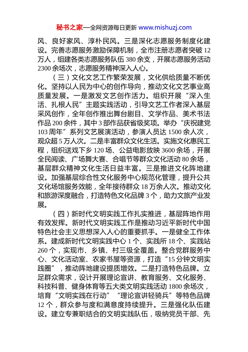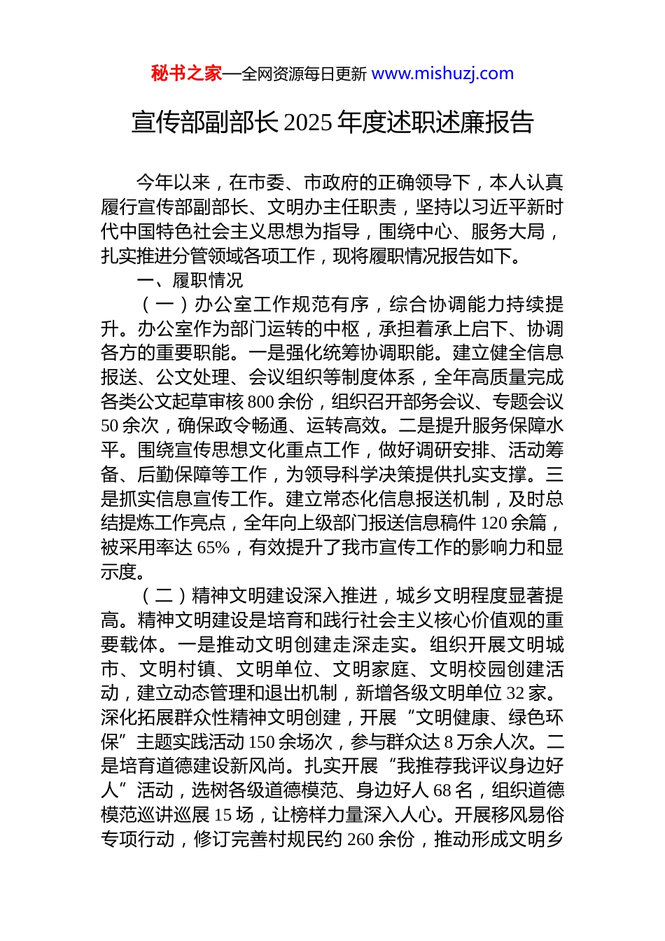 秘书之家—全网资源每日更新 www.mishuzj.com宣传部副部长 2025 年度述职述廉报告今年以来,在市委、市政府的正确领导下,本人认真履行宣传部副部长、文明办主任职责,坚持以习近平新时代中国特色社会主义思想为指导,围绕中心、服务大局,扎实推进分管领域各项工作,现将履职情况报告如下。一、履职情况(一)办公室工作规范有序,综合协调能力持续提升。办公室作为部门运转的中枢,承担着承上启下、协调各方的重要职能。一是强化统筹协调职能。建立健全信息报送、公文处理、会议组织等制度体系,全年高质量完成各类公文起草审核 800 余份,组织召开部务会议、专题会议50 余次,确保政令畅通、运转高效。二是提升服务保障水平。围绕宣传思想文化重点工作,做好调研安排、活动筹备、后勤保障等工作,为领导科学决策提供扎实支撑。三是抓实信息宣传工作。建立常态化信息报送机制,及时总结提炼工作亮点,全年向上级部门报送信息稿件 120 余篇,被采用率达 65%,有效提升了我市宣传工作的影响力和显示度。(二)精神文明建设深入推进,城乡文明程度显著提高。精神文明建设是培育和践行社会主义核心价值观的重要载体。一是推动文明创建走深走实。组织开展文明城市、文明村镇、文明单位、文明家庭、文明校园创建活动,建立动态管理和退出机制,新增各级文明单位 32 家。深化拓展群众性精神文明创建,开展“文明健康、绿色环保”主题实践活动 150 余场次,参与群众达 8 万余人次。二是培育道德建设新风尚。扎实开展“我推荐我评议身边好人”活动,选树各级道德模范、身边好人 68 名,组织道德模范巡讲巡展 15 场,让榜样力量深入人心。开展移风易俗专项行动,修订完善村规民约 260 余份,推动形成文明乡秘书之家—全网资源每日更新 www.mishuzj.com风、良好家风、淳朴民风。三是深化志愿服务制度化建设。完善志愿服务激励保障机制,全市注册志愿者突破 12万人,组建各类志愿服务队伍 380 余支,开展志愿服务活动2300 余场次,志愿服务精神深入人心。(三)文化文艺工作繁荣发展,文化供给质量不断优化。坚持以人民为中心的创作导向,推动文化文艺事业高质量发展。一是激发文艺创作活力。组织开展“深入生活、扎根人民”主题实践活动,引导文艺工作者深入基层采风创作,全年创作推出舞台剧目、文学作品、美术书法作品 200 余件,其中 3 部作品获省级奖项。举办“庆祝建党103 周年”系列文艺展演活动,参演人员达 1500 余人次,观众超 5 万人次。二是丰富群众文化生活。实施文化惠民工程,组织送戏下乡 120 场、公益电影放映 3600 余场,开展全民阅读、广场舞大赛、合唱节等群众文化活动 80 余场,基层群众精神文化生活日益丰富。三是推进文化阵地建设。加强基层综合性文化服务中心规范化管理,提升公共文化场馆服务效能,全年接待群众 18 万余人次。推动文化和旅游深度融合,打造特色文化品牌 3 个,助力文旅产业发展。(四)新时代文明实践工作扎实推进,基层阵地作用有效发挥。新时代文明实践工作是推动习近平新时代中国特色社会主义思想深入人心的重要抓手。一是健全工作体系。建成新时代文明实践中心 1 个、实践所 18 个、实践站260 个,实现市、乡镇、村三级全覆盖。整合党群服务中心、文化活动室、农家书屋等资源,打造“15 分钟文明实践圈”,推动阵地建设提质增效。二是打造特色品牌。立足群众需求,设计开展理论宣讲、教育服务、文化服务、科技科普、健身体育等五大类文明实践活动 1800 余场次,培育“文明实践在行动”“理论宣讲轻骑兵”等特色品牌12 个,群众参与度和满意度持续提升。三是强化队伍建设。建立专兼职结合的文明实践队伍,吸纳党员干部、先秘书之家—全网资源每日更新 www.mishuzj.com进模范、乡土人才等加入,组建各类志愿服务分队 450 余支,培训志愿者骨干 2600 余人次,推动文明实践活动常态化开展。二、廉洁自律情况(一)强化理论武装,筑牢思想防线。把学习贯彻习近平新时代中国特色社会主义思想作为首要政治任务,深入学习贯彻党的二十大精神和习近平总书记关于党风廉政建设的重要论述,认...