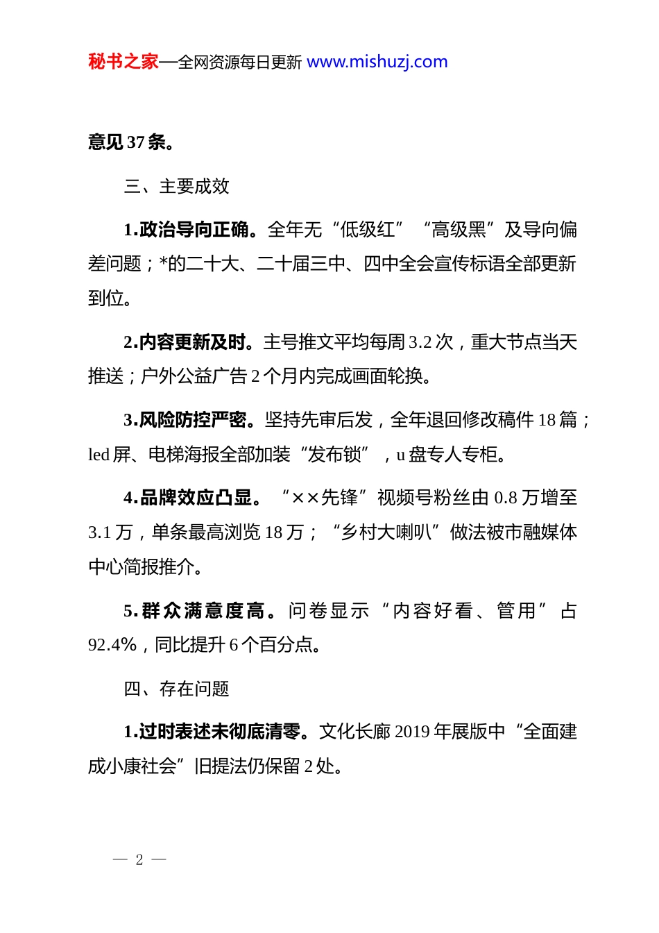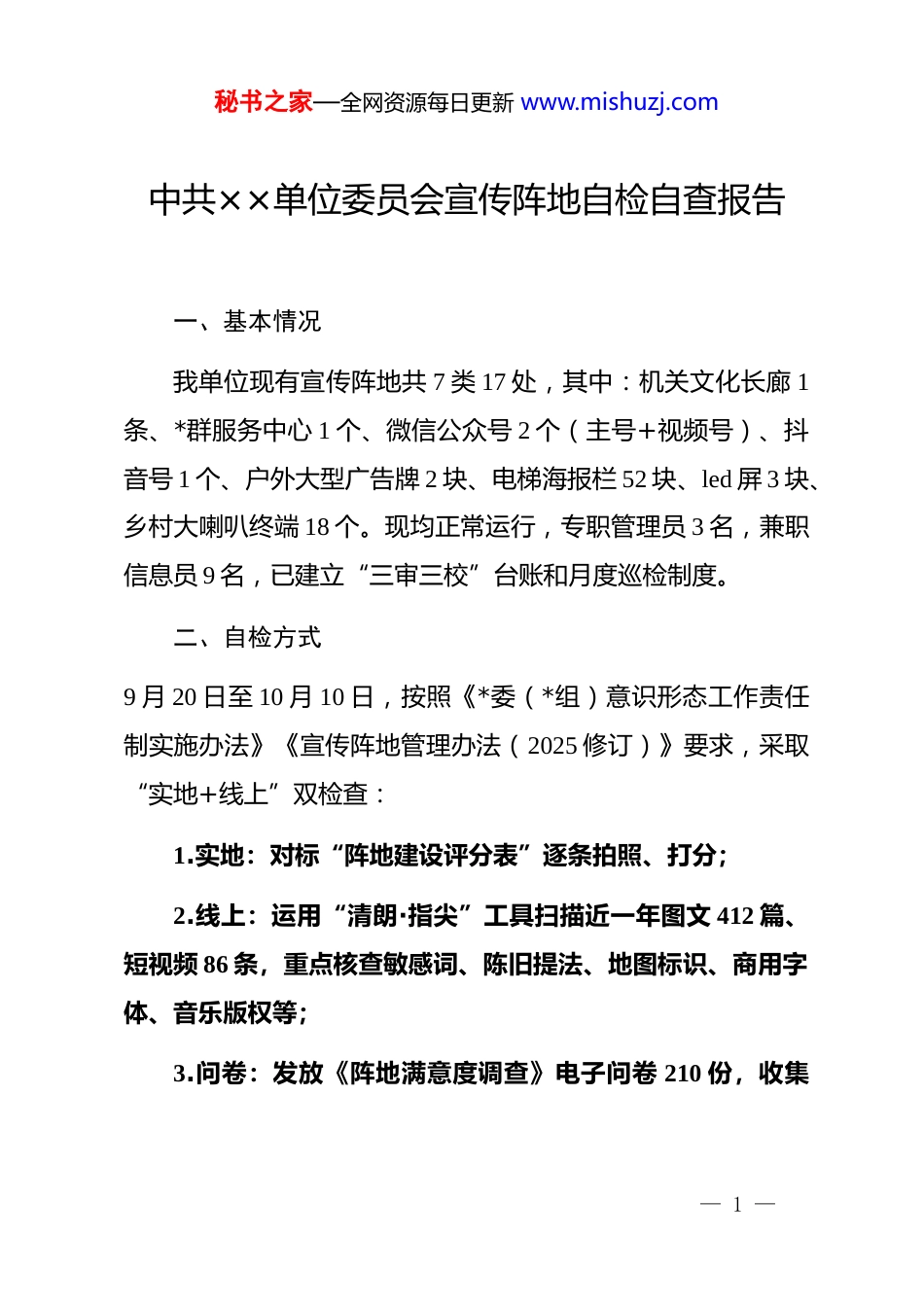 秘书之家—全网资源每日更新 www.mishuzj.com中共××单位委员会宣传阵地自检自查报告一、基本情况我单位现有宣传阵地共 7 类 17 处,其中:机关文化长廊 1条、*群服务中心 1 个、微信公众号 2 个(主号+视频号)、抖音号 1 个、户外大型广告牌 2 块、电梯海报栏 52 块、led 屏 3 块、乡村大喇叭终端 18 个。现均正常运行,专职管理员 3 名,兼职信息员 9 名,已建立“三审三校”台账和月度巡检制度。二、自检方式9 月 20 日至 10 月 10 日,按照《*委(*组)意识形态工作责任制实施办法》《宣传阵地管理办法(2025 修订)》要求,采取“实地+线上”双检查:1.实地:对标“阵地建设评分表”逐条拍照、打分;2.线上:运用“清朗·指尖”工具扫描近一年图文 412 篇、短视频 86 条,重点核查敏感词、陈旧提法、地图标识、商用字体、音乐版权等;3.问卷:发放《阵地满意度调查》电子问卷 210 份,收集— 1 —秘书之家—全网资源每日更新 www.mishuzj.com意见 37 条。三、主要成效1.政治导向正确。全年无“低级红”“高级黑”及导向偏差问题;*的二十大、二十届三中、四中全会宣传标语全部更新到位。2.内容更新及时。主号推文平均每周 3.2 次,重大节点当天推送;户外公益广告 2 个月内完成画面轮换。3.风险防控严密。坚持先审后发,全年退回修改稿件 18 篇;led 屏、电梯海报全部加装“发布锁”,u 盘专人专柜。4.品牌效应凸显。“××先锋”视频号粉丝由 0.8 万增至3.1 万,单条最高浏览 18 万;“乡村大喇叭”做法被市融媒体中心简报推介。5. 群 众 满 意 度 高 。 问 卷 显 示 “ 内 容 好 看 、 管 用 ” 占92.4%,同比提升 6 个百分点。四、存在问题1.过时表述未彻底清零。文化长廊 2019 年展版中“全面建成小康社会”旧提法仍保留 2 处。— 2 —秘书之家—全网资源每日更新 www.mishuzj.com2.版权意识仍显薄弱。抖音号 2024 年 12 月前 8 条视频使用未授权 bgm;电梯海报 3 张图片缺少视觉中国授权码。3.阵地功能单一。户外广告牌仅用于公益宣传,未兼顾政策解读、农文旅招商等多元需求。4.农村终端维护滞后。2 个村“大喇叭”蓄电池老化,音量不足;1 块村部 led 屏出现连续坏点。5.人员能力有短板。兼职信息员普遍不会使用 photoshop、剪映,依赖外包,导致响应慢、成本高。五、原因分析1.更新机制执行不到位,缺少“回头看”具体指标;2.版权培训覆盖不全,以为公益即“合理使用”;3.阵地规划前期调研不足,重“有”轻“用”;4.村级终端未纳入年度预算,重建设轻运维;5.培训经费压缩,致使技能提升滞后。六、整改措施(一)即知即改(10 月底前)— 3 —秘书之家—全网资源每日更新 www.mishuzj.com① 拆除或覆盖旧提法展板 2 块;②下架无版权视频 8 条、海报 3 张,购买音乐、图片商用授权各 1 套;③更换蓄电池 2组、维修 led 屏 1 块。(二)阶段整改(12 月底前)① 制定《宣传阵地内容动态更新细则》,明确重大提法变更后 15 日内完成替换;②建立版权“白名单”库,统一采购正版素材;③将村级终端运维费纳入 2026 年财政预算,每季度巡检一次。(三)长期提升(2026 年 6 月底前)① 举办“宣传技能夜校”,ps、剪映、航拍轮训 2 期,培养 30 名本土“多面手”;②打造“1+n”功能户外牌:主栏公益,副栏政策、招商、招聘可旋转更换;③引入第三方监测机构,每半年出具“体检报告”,形成常态化闭环。七、下一步工作打算1.突出首要任务。把学习宣传贯彻**************思想作为首要政治任务,抓紧抓好。2.强化风险排查。用好“清朗·指尖”系统,日巡+月报+季评,确保零事故。— 4 —秘书之家—全网资源每日更新 www.mishuzj.com3.提升融合效能。探索“宣传+服务+电商”模式,让阵地既“发声”又“发力”。4.压实责任链条。完善“书记牵头、分管领导主抓、专人运维”三级责任制,对履责不到位造成负面影响的,依纪依规追责问责。八、结论本次自检显示,我单位宣传阵地总体运行良好、导向正确管理规范,但也存在细节性、运维性问题。通过集中整改,目前已完成 80%即知即改事项,其余正按节点推进。下一步,我们将以更高标准、更严要求管好、用好各类阵地,为意识形态安全提供坚强保障。附件:1.宣传阵地问题清单及整改台账2.阵地满意度调查统计表中共××单位委员会2025 年 xx 月 xx 日— 5 —