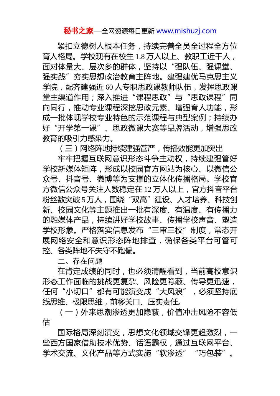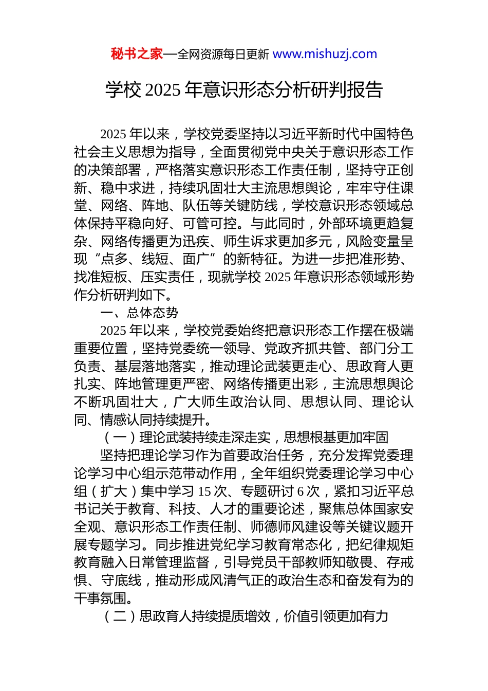 秘书之家—全网资源每日更新 www.mishuzj.com学校 2025 年意识形态分析研判报告2025 年以来,学校党委坚持以习近平新时代中国特色社会主义思想为指导,全面贯彻党中央关于意识形态工作的决策部署,严格落实意识形态工作责任制,坚持守正创新、稳中求进,持续巩固壮大主流思想舆论,牢牢守住课堂、网络、阵地、队伍等关键防线,学校意识形态领域总体保持平稳向好、可管可控。与此同时,外部环境更趋复杂、网络传播更为迅疾、师生诉求更加多元,风险变量呈现“点多、线短、面广”的新特征。为进一步把准形势、找准短板、压实责任,现就学校 2025 年意识形态领域形势作分析研判如下。一、总体态势2025 年以来,学校党委始终把意识形态工作摆在极端重要位置,坚持党委统一领导、党政齐抓共管、部门分工负责、基层落地落实,推动理论武装更走心、思政育人更扎实、阵地管理更严密、网络传播更出彩,主流思想舆论不断巩固壮大,广大师生政治认同、思想认同、理论认同、情感认同持续提升。(一)理论武装持续走深走实,思想根基更加牢固坚持把理论学习作为首要政治任务,充分发挥党委理论学习中心组示范带动作用,全年组织党委理论学习中心组(扩大)集中学习 15 次、专题研讨 6 次,紧扣习近平总书记关于教育、科技、人才的重要论述,聚焦总体国家安全观、意识形态工作责任制、师德师风建设等关键议题开展专题学习。同步推进党纪学习教育常态化,把纪律规矩教育融入日常管理监督,引导党员干部教师知敬畏、存戒惧、守底线,推动形成风清气正的政治生态和奋发有为的干事氛围。(二)思政育人持续提质增效,价值引领更加有力秘书之家—全网资源每日更新 www.mishuzj.com紧扣立德树人根本任务,持续完善全员全过程全方位育人格局。学校现有在校生 1.8 万人以上、教职工近千人,面对体量大、层次多的群体,坚持以“强队伍、强课堂、强实践”夯实思想政治教育主阵地。建强建优马克思主义学院,配齐建强近 60 人专职思政课教师队伍,发挥思政课堂主渠道作用;深入推进“课程思政”与“思政课程”同向同行,推动专业课程深挖思政元素、增强育人功能,形成一批体现学校专业特色的示范课程与典型案例;持续办好“开学第一课”、思政微课大赛等品牌活动,增强思政教育的吸引力感染力。(三)网络阵地持续建强管严,传播效能更加突出牢牢把握互联网意识形态斗争主动权,持续建强管好学校新媒体矩阵,形成以校园官方网站为核心、以微信公众号、抖音号、微博等为支撑的立体化传播格局。学校官方微信公众号关注人数稳定在 12 万人以上,官方抖音平台粉丝数突破 5 万人,围绕“双高”建设、人才培养、科技创新、校园文化等主题推出一批有深度、有温度、有传播力的融媒体产品,持续讲好学校故事、传播学校声音、塑造学校形象。严格落实信息发布“三审三校”制度,常态开展网络安全和意识形态阵地排查,确保各类平台可管可控、各类阵地不失守不跑偏。二、存在问题在肯定成绩的同时,也必须清醒看到,当前高校意识形态工作面临的挑战更复杂、风险更隐蔽、传导更迅速,任何“小切口”都有可能演变成“大风浪”,必须坚持底线思维、极限思维,前移关口、压实责任。(一)外来思潮渗透更加隐蔽,价值冲击风险不容低估国际格局深刻演变,思想文化领域交锋更趋激烈,一些西方国家借助技术优势、话语霸权,通过互联网平台、学术交流、文化产品等方式实施“软渗透”“巧包装”。秘书之家—全网资源每日更新 www.mishuzj.com历史虚无主义、新自由主义等错误思潮在网络空间碎片化传播,个别学生对境外社交媒体与流行文化黏性较强,辨别力、批判力仍需加强,存在被带节奏、被情绪裹挟的潜在风险。(二)网络舆情生成更加突发,小事放大风险不容忽视自媒体时代舆情传播呈现链条更短、发酵更快、扩散更广的特点,校园管理服务中的细小问题,如食宿保障、评奖评优、实习就业、师生沟通等,均可能被短时间放大,形成热点舆情。黄金处置窗口期进一步压缩,一旦回应不及时、表达不精准、处置不规范,容易由“反映诉求”滑向“对立情绪”,由“校园事件”外溢为“公共议题”,对学校形象和正常秩序造成冲...
