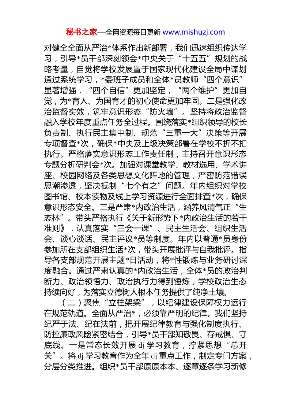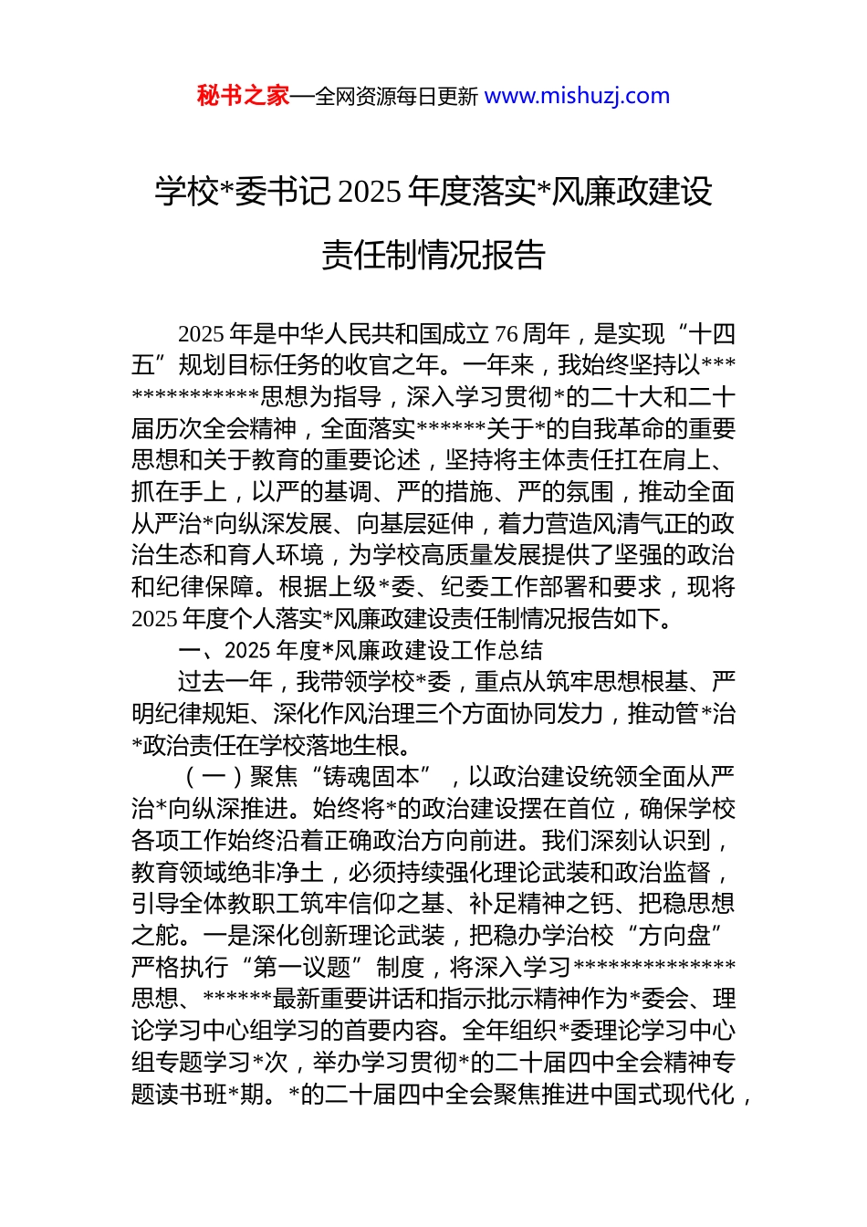 秘书之家—全网资源每日更新 www.mishuzj.com学校*委书记 2025 年度落实*风廉政建设责任制情况报告2025 年是中华人民共和国成立 76 周年,是实现“十四五”规划目标任务的收官之年。一年来,我始终坚持以**************思想为指导,深入学习贯彻*的二十大和二十届历次全会精神,全面落实******关于*的自我革命的重要思想和关于教育的重要论述,坚持将主体责任扛在肩上、抓在手上,以严的基调、严的措施、严的氛围,推动全面从严治*向纵深发展、向基层延伸,着力营造风清气正的政治生态和育人环境,为学校高质量发展提供了坚强的政治和纪律保障。根据上级*委、纪委工作部署和要求,现将2025 年度个人落实*风廉政建设责任制情况报告如下。一、2025 年度*风廉政建设工作总结过去一年,我带领学校*委,重点从筑牢思想根基、严明纪律规矩、深化作风治理三个方面协同发力,推动管*治*政治责任在学校落地生根。(一)聚焦“铸魂固本”,以政治建设统领全面从严治*向纵深推进。始终将*的政治建设摆在首位,确保学校各项工作始终沿着正确政治方向前进。我们深刻认识到,教育领域绝非净土,必须持续强化理论武装和政治监督,引导全体教职工筑牢信仰之基、补足精神之钙、把稳思想之舵。一是深化创新理论武装,把稳办学治校“方向盘”严格执行“第一议题”制度,将深入学习**************思想、******最新重要讲话和指示批示精神作为*委会、理论学习中心组学习的首要内容。全年组织*委理论学习中心组专题学习*次,举办学习贯彻*的二十届四中全会精神专题读书班*期。*的二十届四中全会聚焦推进中国式现代化,秘书之家—全网资源每日更新 www.mishuzj.com对健全全面从严治*体系作出新部署,我们迅速组织传达学习,引导*员干部深刻领会*中央关于“十五五”规划的战略考量,自觉将学校发展置于国家现代化建设全局中谋划通过系统学习,*委班子成员和全体*员教师“四个意识”显著增强,“四个自信”更加坚定,“两个维护”更加自觉,为*育人、为国育才的初心使命更加牢固。二是强化政治监督实效,筑牢意识形态“防火墙”。坚持将政治监督融入学校年度重点任务全过程。围绕落实*组织领导的校长负责制、执行民主集中制、规范“三重一大”决策等开展专项督查*次,确保*中央及上级决策部署在学校不折不扣执行。严格落实意识形态工作责任制,主持召开意识形态专题分析研判会*次。加强对课堂教学、教材选用、学术讲座、校园网络及各类思想文化阵地的管理,严密防范错误思潮渗透,坚决抵制“七个有之”问题。年内组织对学校图书馆、校本读物及线上学习资源进行全面排查*次,确保意识形态安全。三是严肃*内政治生活,涵养风清气正“生态林”。带头严格执行《关于新形势下*内政治生活的若干准则》,认真落实“三会一课”、民主生活会、组织生活会、谈心谈话、民主评议*员等制度。年内以普通*员身份参加所在支部组织生活*次,带头开展批评与自我批评。指导各支部规范开展主题*日活动,将*性锻炼与业务研讨深度融合。通过严肃认真的*内政治生活,全体*员的政治判断力、政治领悟力、政治执行力得到锤炼,学校政治生态持续向好,为落实立德树人根本任务提供了纯净土壤。(二)聚焦“立柱架梁”,以纪律建设保障权力运行在规范轨道。全面从严治*,必须靠严明的纪律。我们坚持纪严于法、纪在法前,把开展纪律教育与强化制度执行、防控廉政风险紧密结合,引导*员干部知敬畏、存戒惧、守底线。一是常态长效开展 dj 学习教育,拧紧思想“总开关”。将 dj 学习教育作为全年 dj 重点工作,制定专门方案,分层分类推进。组织*员干部原原本本、逐章逐条学习新修秘书之家—全网资源每日更新 www.mishuzj.com订的《中国共产 dj 律处分条例》。全年开展专题廉政*课*场,组织观看警示教育片*部,赴廉政教育基地开展现场教学*次。重点加强对学校班子成员、中层干部、年轻干部、关键岗位人员的纪律培训。结合教育系统典型案例,开展“以案说纪、以案说法”活动*次,用身边事教育身边人,切实增强纪律教育的穿透力和感染力。二是强化制度执行监督检查,架起权力“探照灯”。坚持问题导向,紧盯权力运行的关键点、...