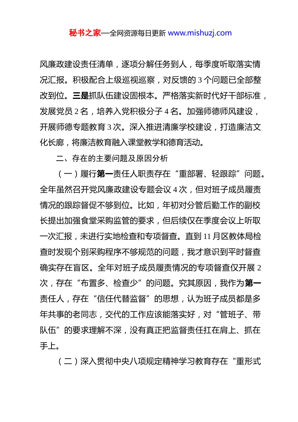 秘书之家—全网资源每日更新 www.mishuzj.com学校党委书记 2025 年落实全面从严治党主体责任述职报告 2025 年,我认真履行全面从严治党第一责任人职责,坚持以习近平新时代中国特色社会主义思想为指导,深入学习贯彻党的二十大和二十届二中、三中、四中全会精神,贯彻落实习近平总书记视察山东重要讲话和重要指示精神,落实区委十一届七次、八次、九次全会部署和区纪委五次全会精神,扎实开展深入贯彻中央八项规定精神学习教育,推动清廉学校建设。现将履责情况报告如下:一、主要做法及成效一是抓政治建设强引领。坚持把政治建设摆在首位,组织班子成员和全体党员学习党的二十届四中全会精神及习近平总书记视察山东重要讲话精神 12 次,开展“第一议题”学习 18次。严格执行民主集中制,全年召开党支部委员会 16 次,“三重一大”事项全部集体研究决定。扎实开展深入贯彻中央八项规定精神学习教育,一体推进学查改,全体党员签订廉洁承诺书,组织观看警示教育片 3 部。二是抓责任落实促担当。对重要工作亲自部署、重大问题亲自过问,全年听取班子成员分管领域工作汇报 8 次,与班子成员开展谈心谈话 26 人次。制定党秘书之家—全网资源每日更新 www.mishuzj.com风廉政建设责任清单,逐项分解任务到人,每季度听取落实情况汇报。积极配合上级巡视巡察,对反馈的 3 个问题已全部整改到位。三是抓队伍建设固根本。严格落实新时代好干部标准,发展党员 2 名,培养入党积极分子 4 名。加强师德师风建设,开展师德专题教育 3 次。深入推进清廉学校建设,打造廉洁文化长廊,将廉洁教育融入课堂教学和德育活动。二、存在的主要问题及原因分析(一)履行第一责任人职责存在“重部署、轻跟踪”问题。全年虽然召开党风廉政建设专题会议 4 次,但对班子成员履责情况的跟踪督促不够到位。比如,年初对分管后勤工作的副校长提出加强食堂采购监管的要求,但后续仅在季度会议上听取一次汇报,未进行实地检查和专项督查。直到 11 月区教体局检查时发现个别采购程序不够规范的问题,我才意识到平时督查确实存在盲区。全年对班子成员履责情况的专项督查仅开展 2次,存在“布置多、检查少”的问题。究其原因,我作为第一责任人,存在“信任代替监督”的思想,认为班子成员都是多年共事的老同志,交代的工作应该能落实好,对“管班子、带队伍”的要求理解不深,没有真正把监督责任扛在肩上、抓在手上。(二)深入贯彻中央八项规定精神学习教育存在“重形式秘书之家—全网资源每日更新 www.mishuzj.com轻实效”问题。在开展学习教育过程中,组织集中学习 8 次,但学习形式较为单一,主要以读文件、听传达为主,研讨交流不够深入。比如,5 月组织学习中央八项规定及其实施细则精神时,会议用时不到 1 小时,发言交流仅 3 人,部分教师存在“只听不思、学用脱节”现象。在查摆问题环节,党支部收集到的问题仅 12 条,且多为“理论学习不够深入”“工作作风还需改进”等泛泛而谈的共性问题,真正触及灵魂、见人见事的问题较少。对整改情况的“回头看”仅开展 1 次,3 个问题的整改停留在制定措施层面,未建立长效机制。究其原因,我对学习教育的政治意义认识不够到位,存在“完成任务”心态,在学习教育的谋划设计上投入精力不足,习惯于用老办法应对新要求,缺乏创新意识。(三)清廉学校建设存在“重创建、轻融入”问题。在清廉学校建设中,硬件设施投入较多,建成廉洁文化长廊 1 处、廉政书架 2 个,但将清廉理念融入教育教学的工作不够深入。比如,年初制定了“廉洁进课堂”计划,要求各学科教师挖掘廉洁教育元素,但全年仅开展廉洁主题班会 12 节,仅占班会总数的 15%,未能实现廉洁教育常态化。对学生的廉洁教育仅停留在主题活动层面,6 月举办的廉洁文化作品征集活动,学生参与率不足 40%。对教职工廉洁从教的监督也存在薄弱环节,秘书之家—全网资源每日更新 www.mishuzj.com全年仅开展师德师风专项检查 2 次,对有偿补课等问题的防范措施还不够有力。究其原因,我对清廉学校建设的内涵理解不够深刻,存在“重形象工程、轻内涵建设”的倾向...