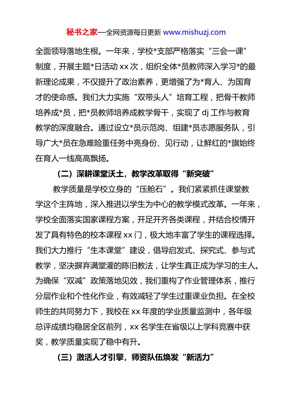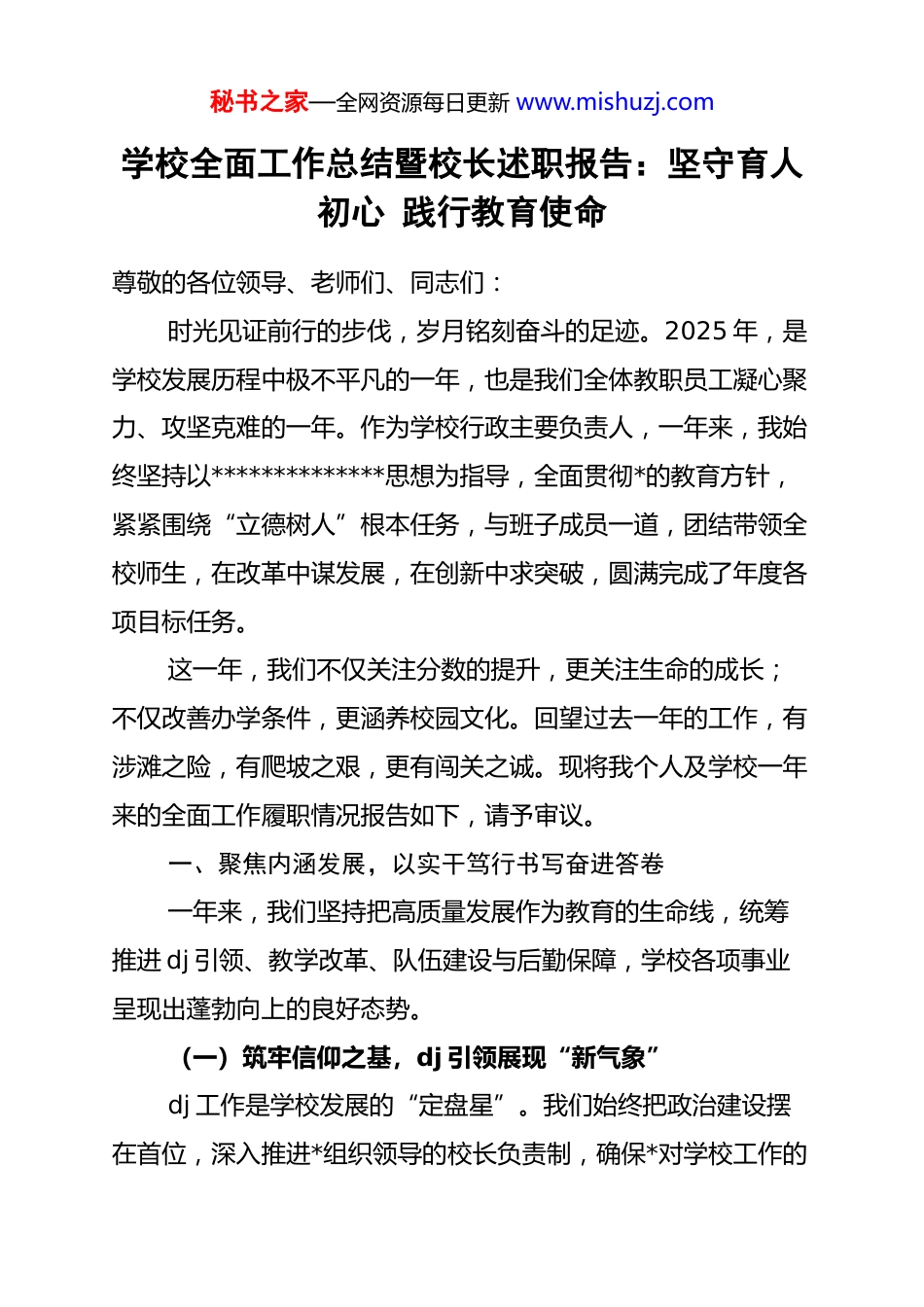 秘书之家—全网资源每日更新 www.mishuzj.com学校全面工作总结暨校长述职报告:坚守育人初心 践行教育使命尊敬的各位领导、老师们、同志们:时光见证前行的步伐,岁月铭刻奋斗的足迹。2025 年,是学校发展历程中极不平凡的一年,也是我们全体教职员工凝心聚力、攻坚克难的一年。作为学校行政主要负责人,一年来,我始终坚持以**************思想为指导,全面贯彻*的教育方针,紧紧围绕“立德树人”根本任务,与班子成员一道,团结带领全校师生,在改革中谋发展,在创新中求突破,圆满完成了年度各项目标任务。这一年,我们不仅关注分数的提升,更关注生命的成长;不仅改善办学条件,更涵养校园文化。回望过去一年的工作,有涉滩之险,有爬坡之艰,更有闯关之诚。现将我个人及学校一年来的全面工作履职情况报告如下,请予审议。一、聚焦内涵发展,以实干笃行书写奋进答卷一年来,我们坚持把高质量发展作为教育的生命线,统筹推进 dj 引领、教学改革、队伍建设与后勤保障,学校各项事业呈现出蓬勃向上的良好态势。(一)筑牢信仰之基,dj 引领展现“新气象”dj 工作是学校发展的“定盘星”。我们始终把政治建设摆在首位,深入推进*组织领导的校长负责制,确保*对学校工作的秘书之家—全网资源每日更新 www.mishuzj.com全面领导落地生根。一年来,学校*支部严格落实“三会一课”制度,开展主题*日活动 xx 次,组织全体*员教师深入学习*的最新理论成果,不仅提升了政治素养,更增强了为*育人、为国育才的使命感。我们大力实施“双带头人”培育工程,把骨干教师培养成*员,把*员教师培养成教学骨干,实现了 dj 工作与教育教学的深度融合。通过设立*员示范岗、组建*员志愿服务队,引导广大*员在急难险重任务中亮身份、见行动,让鲜红的*旗始终在育人一线高高飘扬。(二)深耕课堂沃土,教学改革取得“新突破”教学质量是学校立身的“压舱石”。我们紧紧抓住课堂教学这个主阵地,深入推进以学生为中心的教学模式改革。一年来,学校全面落实国家课程方案,开足开齐各类课程,并结合校情开发了具有特色的校本课程 xx 门,极大地丰富了学生的课程选择。我们大力推行“生本课堂”建设,倡导启发式、探究式、参与式教学,坚决摒弃满堂灌的陈旧教法,让学生真正成为学习的主人。为确保“双减”政策落地见效,我们重构了作业管理体系,推行分层作业和个性化作业,有效减轻了学生过重课业负担。在全校师生的共同努力下,我校在 xx 年度的学业质量监测中,各年级总评成绩均稳居全区前列,xx 名学生在省级以上学科竞赛中获奖,教学质量实现了稳中有升。(三)激活人才引擎,师资队伍焕发“新活力”秘书之家—全网资源每日更新 www.mishuzj.com教师是教育发展的“第一资源”。我们始终把教师队伍建设作为学校发展的核心工程,着力打造一支师德高尚、业务精湛、结构合理的高素质教师队伍。一年来,我们扎实开展师德师风专项整治行动,签订师德承诺书 xx 份,建立了师德负面清单制度,实行师德“一票否决”制,引导教师以德立身、以德立学、以德施教。在业务提升方面,我们实施了“青蓝工程”和“名师领航”计划,通过师徒结对、课例研讨、专家讲座等多种形式,搭建起教师专业成长的立体平台。全学年共派出教师外出培训 xx人次,开展校内公开课 xx 节。特别值得一提的是,我校 xx 位青年教师在市级教学比武中斩获一等奖,一批骨干教师正脱颖而出,成为学校发展的坚实脊梁。(四)织密保障网底,平安校园构建“新格局”安全稳定是学校发展的“底板”。我们牢固树立“安全第一,生命至上”的理念,建立健全了全员参与、全过程管理的安全责任体系。一年来,学校累计投入资金 xx 万元,对校园监控系统、消防设施、食堂设备进行了全面升级改造,彻底消除了校园周边的安全隐患 xx 处。我们高度重视心理健康教育,建成了标准的心理咨询室,配备了专职心理教师,建立了学生心理健康档案,对特异体质和心理异常学生实行“一生一案”动态管理,有效防范了校园欺凌和极端事件的发生。同时,我们不断优化后勤服务品质,严把食品安全关,开展“光盘行动”,努力打造绿秘书之家—全网资...