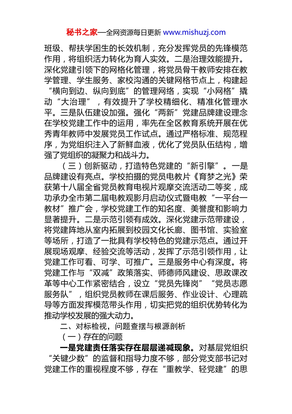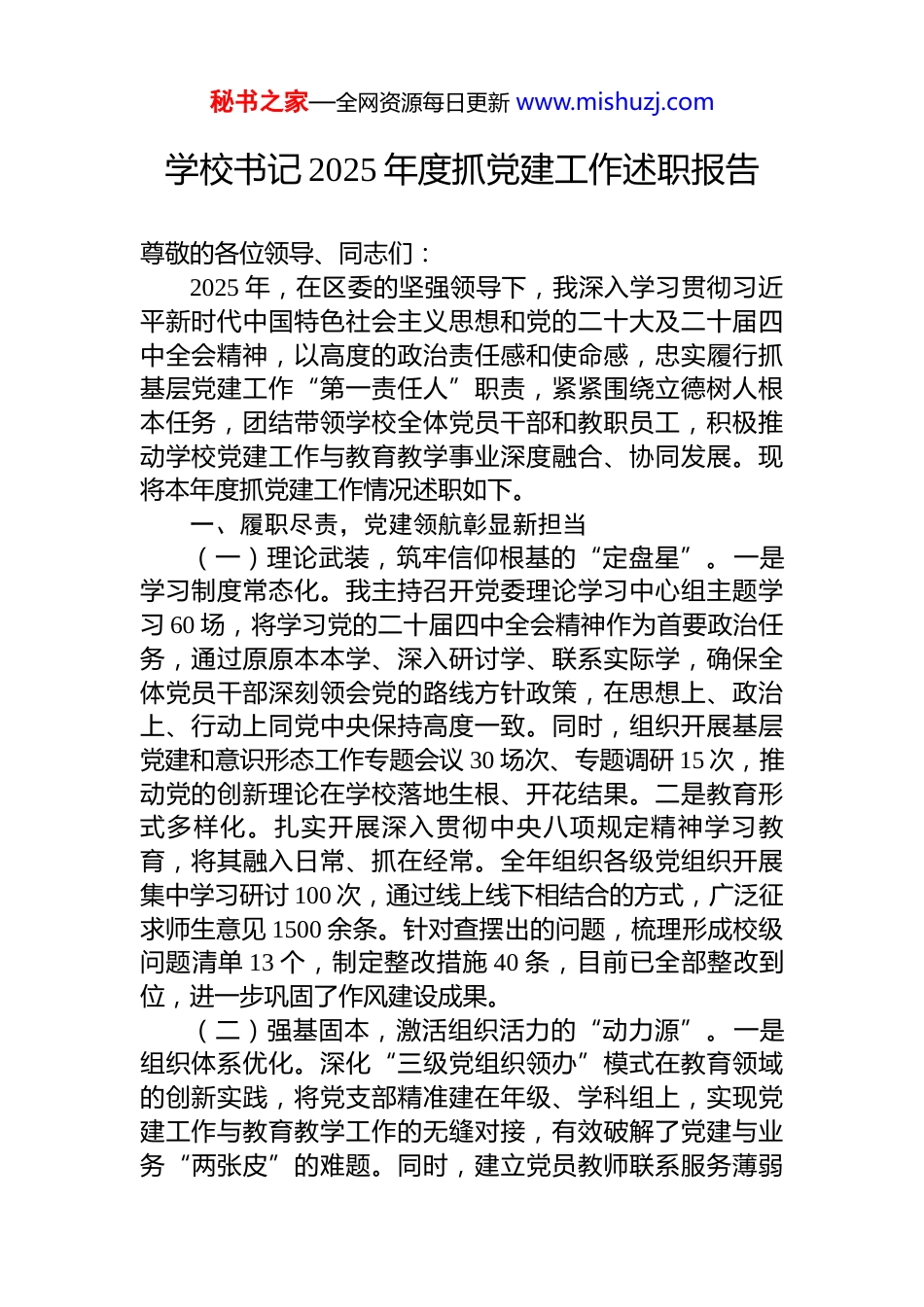秘书之家—全网资源每日更新 www.mishuzj.com学校书记 2025 年度抓党建工作述职报告尊敬的各位领导、同志们:2025 年,在区委的坚强领导下,我深入学习贯彻习近平新时代中国特色社会主义思想和党的二十大及二十届四中全会精神,以高度的政治责任感和使命感,忠实履行抓基层党建工作“第一责任人”职责,紧紧围绕立德树人根本任务,团结带领学校全体党员干部和教职员工,积极推动学校党建工作与教育教学事业深度融合、协同发展。现将本年度抓党建工作情况述职如下。一、履职尽责,党建领航彰显新担当(一)理论武装,筑牢信仰根基的“定盘星”。一是学习制度常态化。我主持召开党委理论学习中心组主题学习 60 场,将学习党的二十届四中全会精神作为首要政治任务,通过原原本本学、深入研讨学、联系实际学,确保全体党员干部深刻领会党的路线方针政策,在思想上、政治上、行动上同党中央保持高度一致。同时,组织开展基层党建和意识形态工作专题会议 30 场次、专题调研 15 次,推动党的创新理论在学校落地生根、开花结果。二是教育形式多样化。扎实开展深入贯彻中央八项规定精神学习教育,将其融入日常、抓在经常。全年组织各级党组织开展集中学习研讨 100 次,通过线上线下相结合的方式,广泛征求师生意见 1500 余条。针对查摆出的问题,梳理形成校级问题清单 13 个,制定整改措施 40 条,目前已全部整改到位,进一步巩固了作风建设成果。(二)强基固本,激活组织活力的“动力源”。一是组织体系优化。深化“三级党组织领办”模式在教育领域的创新实践,将党支部精准建在年级、学科组上,实现党建工作与教育教学工作的无缝对接,有效破解了党建与业务“两张皮”的难题。同时,建立党员教师联系服务薄弱秘书之家—全网资源每日更新 www.mishuzj.com班级、帮扶学困生的长效机制,充分发挥党员的先锋模范作用,将组织活力转化为育人实效。二是治理效能提升。深化党建引领下的网格化管理,将党员骨干教师安排在教学管理、学生服务、家校沟通的关键网格节点上,构建起“横向到边、纵向到底”的管理网络,实现“小网格”撬动“大治理”,有效提升了学校精细化、精准化管理水平。三是队伍建设加强。强化“两新”党建品牌建设理念在学校党建工作中的运用,率先在全区教育系统开展在优秀青年教师中发展党员工作试点。通过严格标准、规范程序,为党组织注入了新鲜血液,优化了党员队伍结构,增强了党组织的凝聚力和战斗力。(三)创新驱动,打造特色党建的“新引擎”。一是品牌建设有亮点。学校拍摄的党员电教片《育梦之光》荣获第十八届全省党员教育电视片观摩交流活动二等奖,成功承办全市第二届电教观影月启动仪式暨电教“一平台一教材”推广会,学校党建工作的知名度、美誉度和影响力显著提升。二是示范引领有成效。深化党建示范带建设,将党建阵地从室内拓展到校园文化长廊、图书馆、实验室等场所,打造了一批具有学校特色的党建示范点。通过开展现场观摩、经验交流等活动,发挥了示范引领作用,让党建工作可看、可学、可推广。三是服务中心有深度。将党建工作与“双减”政策落实、师德师风建设、思政课改革等中心工作紧密结合,设立“党员先锋岗”“党员志愿服务队”,组织党员教师在课后服务、作业设计、心理疏导等方面发挥模范带头作用,切实把党的组织优势转化为推动学校发展的强大动力。二、对标检视,问题查摆与根源剖析(一)存在的问题一是党建责任落实存在层层递减现象。对基层党组织“关键少数”的监督和指导力度不够,部分党支部书记对党建工作的重视程度不够,存在“重教学、轻党建”的思秘书之家—全网资源每日更新 www.mishuzj.com想,履行党建工作职责的主动性和创造性不足。在党建工作检查中发现,个别党支部“三会一课”制度落实不到位,组织生活不规范,记录不完整。二是党建与业务融合还不够紧密。虽然在党建与教育教学融合方面做了一些探索和尝试,但在深度和广度上还有待进一步加强。部分党员教师在教学工作中未能充分发挥党员的先锋模范作用,存在党建工作与业务工作“两张皮”的现象,党建引领教育教学的作用没有得到充分体现。三是党员教育...