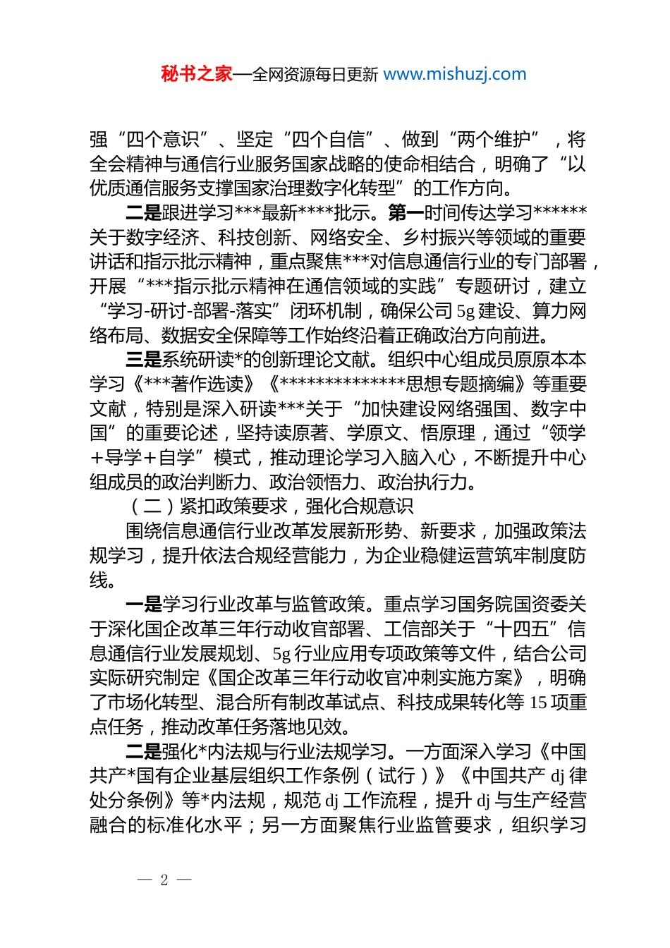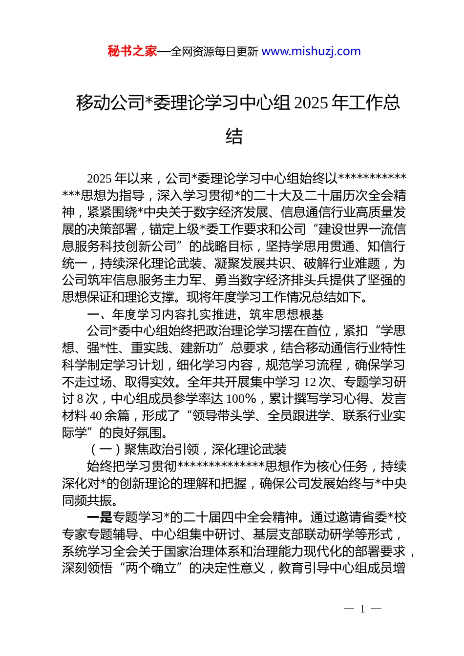 秘书之家—全网资源每日更新 www.mishuzj.com移动公司*委理论学习中心组 2025 年工作总结2025 年以来,公司*委理论学习中心组始终以**************思想为指导,深入学习贯彻*的二十大及二十届历次全会精神,紧紧围绕*中央关于数字经济发展、信息通信行业高质量发展的决策部署,锚定上级*委工作要求和公司“建设世界一流信息服务科技创新公司”的战略目标,坚持学思用贯通、知信行统一,持续深化理论武装、凝聚发展共识、破解行业难题,为公司筑牢信息服务主力军、勇当数字经济排头兵提供了坚强的思想保证和理论支撑。现将年度学习工作情况总结如下。一、年度学习内容扎实推进,筑牢思想根基公司*委中心组始终把政治理论学习摆在首位,紧扣“学思想、强*性、重实践、建新功”总要求,结合移动通信行业特性科学制定学习计划,细化学习内容,规范学习流程,确保学习不走过场、取得实效。全年共开展集中学习 12 次、专题学习研讨 8 次,中心组成员参学率达 100%,累计撰写学习心得、发言材料 40 余篇,形成了“领导带头学、全员跟进学、联系行业实际学”的良好氛围。(一)聚焦政治引领,深化理论武装始终把学习贯彻**************思想作为核心任务,持续深化对*的创新理论的理解和把握,确保公司发展始终与*中央同频共振。一是专题学习*的二十届四中全会精神。通过邀请省委*校专家专题辅导、中心组集中研讨、基层支部联动研学等形式,系统学习全会关于国家治理体系和治理能力现代化的部署要求,深刻领悟“两个确立”的决定性意义,教育引导中心组成员增— 1 —秘书之家—全网资源每日更新 www.mishuzj.com强“四个意识”、坚定“四个自信”、做到“两个维护”,将全会精神与通信行业服务国家战略的使命相结合,明确了“以优质通信服务支撑国家治理数字化转型”的工作方向。二是跟进学习***最新****批示。第一时间传达学习******关于数字经济、科技创新、网络安全、乡村振兴等领域的重要讲话和指示批示精神,重点聚焦***对信息通信行业的专门部署,开展“***指示批示精神在通信领域的实践”专题研讨,建立“学习-研讨-部署-落实”闭环机制,确保公司 5g 建设、算力网络布局、数据安全保障等工作始终沿着正确政治方向前进。三是系统研读*的创新理论文献。组织中心组成员原原本本学习《***著作选读》《**************思想专题摘编》等重要文献,特别是深入研读***关于“加快建设网络强国、数字中国”的重要论述,坚持读原著、学原文、悟原理,通过“领学+导学+自学”模式,推动理论学习入脑入心,不断提升中心组成员的政治判断力、政治领悟力、政治执行力。(二)紧扣政策要求,强化合规意识围绕信息通信行业改革发展新形势、新要求,加强政策法规学习,提升依法合规经营能力,为企业稳健运营筑牢制度防线。一是学习行业改革与监管政策。重点学习国务院国资委关于深化国企改革三年行动收官部署、工信部关于“十四五”信息通信行业发展规划、5g 行业应用专项政策等文件,结合公司实际研究制定《国企改革三年行动收官冲刺实施方案》,明确了市场化转型、混合所有制改革试点、科技成果转化等 15 项重点任务,推动改革任务落地见效。二是强化*内法规与行业法规学习。一方面深入学习《中国共产*国有企业基层组织工作条例(试行)》《中国共产 dj 律处分条例》等*内法规,规范 dj 工作流程,提升 dj 与生产经营融合的标准化水平;另一方面聚焦行业监管要求,组织学习— 2 —秘书之家—全网资源每日更新 www.mishuzj.com《电信条例》《数据安全法》《个人信息保护法》《网络安全法》等法规,开展“数据合规专项学习月”活动,邀请行业监管专家解读政策红线,确保公司业务开展合法合规。三是筑牢廉洁与安全生产防线。组织学习《国有企业领导人员廉洁从业若干规定》《安全生产法》《监察法》等法规,开展警示教育 6 次,通报通信行业违纪违法、安全生产事故典型案例,引导中心组成员知敬畏、存戒惧、守底线;同步建立“廉洁风险防控清单”,梳理出基站建设、采购招标、客户服务等领域 20 项廉洁风险点,制定针对性防控措施,筑牢廉洁自律和安全生产的双重思想防线...