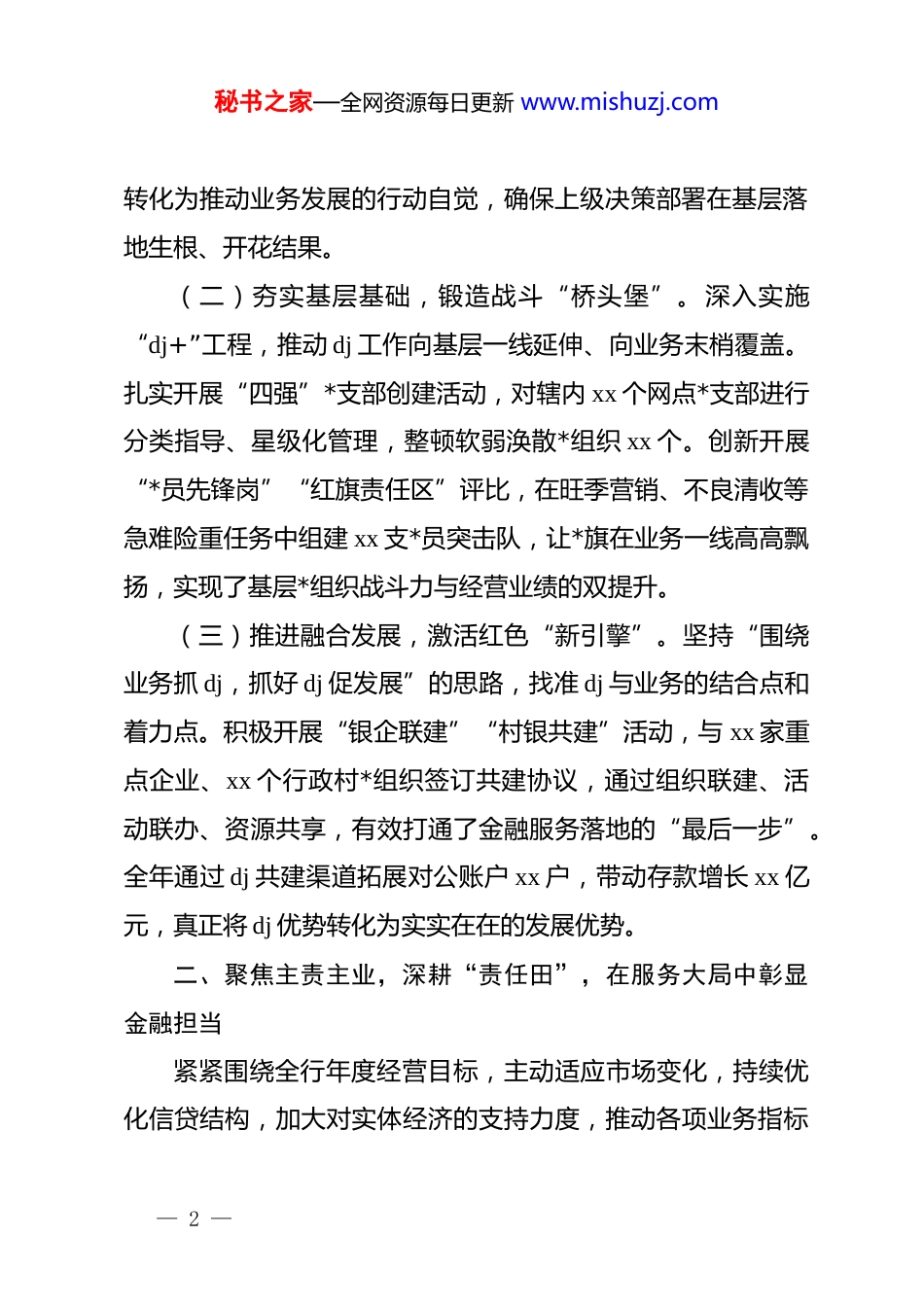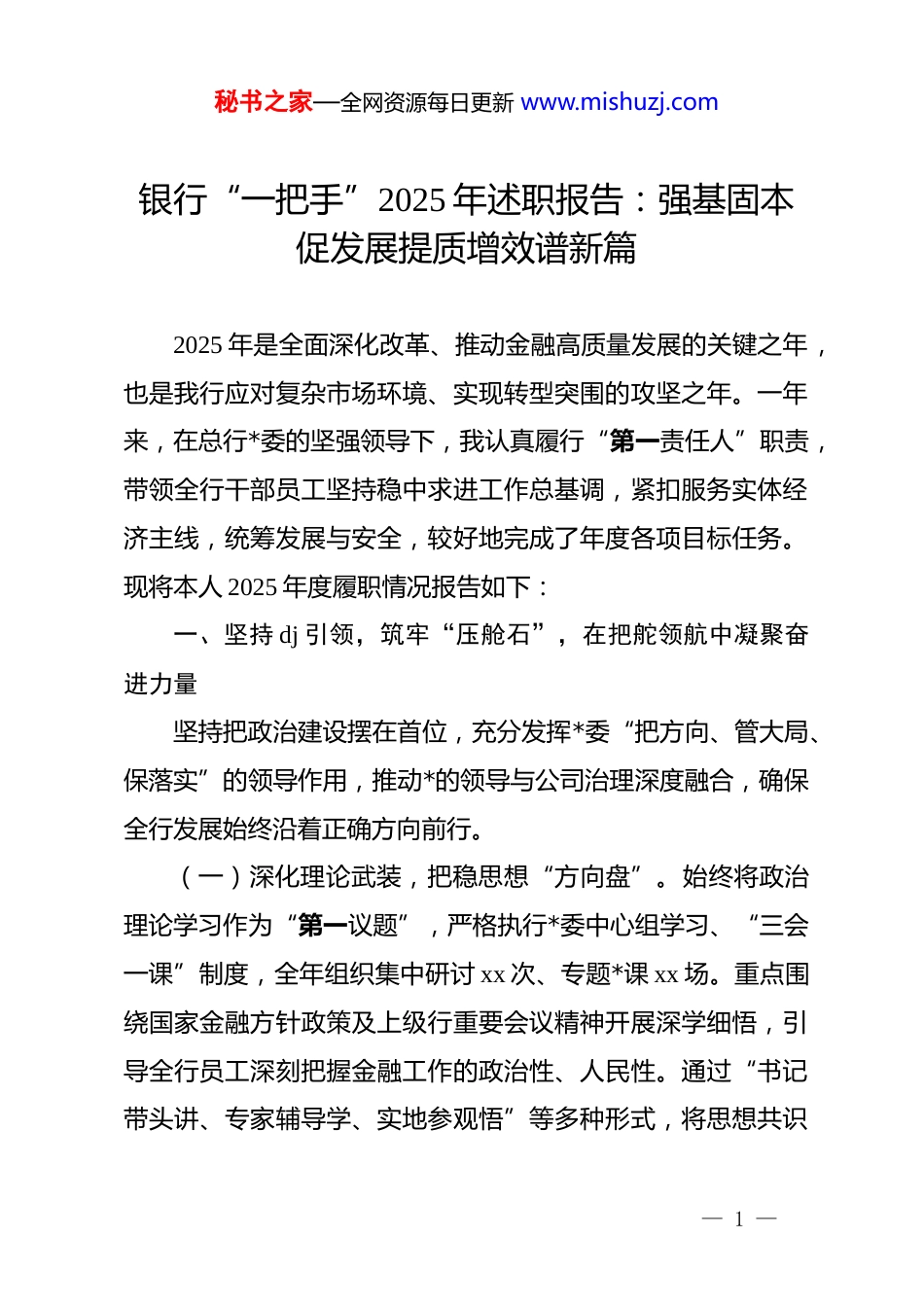秘书之家—全网资源每日更新 www.mishuzj.com银行“一把手”2025 年述职报告:强基固本促发展提质增效谱新篇2025 年是全面深化改革、推动金融高质量发展的关键之年,也是我行应对复杂市场环境、实现转型突围的攻坚之年。一年来,在总行*委的坚强领导下,我认真履行“第一责任人”职责,带领全行干部员工坚持稳中求进工作总基调,紧扣服务实体经济主线,统筹发展与安全,较好地完成了年度各项目标任务。现将本人 2025 年度履职情况报告如下:一、坚持 dj 引领,筑牢“压舱石”,在把舵领航中凝聚奋进力量坚持把政治建设摆在首位,充分发挥*委“把方向、管大局、保落实”的领导作用,推动*的领导与公司治理深度融合,确保全行发展始终沿着正确方向前行。(一)深化理论武装,把稳思想“方向盘”。始终将政治理论学习作为“第一议题”,严格执行*委中心组学习、“三会一课”制度,全年组织集中研讨 xx 次、专题*课 xx 场。重点围绕国家金融方针政策及上级行重要会议精神开展深学细悟,引导全行员工深刻把握金融工作的政治性、人民性。通过“书记带头讲、专家辅导学、实地参观悟”等多种形式,将思想共识— 1 —秘书之家—全网资源每日更新 www.mishuzj.com转化为推动业务发展的行动自觉,确保上级决策部署在基层落地生根、开花结果。(二)夯实基层基础,锻造战斗“桥头堡”。深入实施“dj+”工程,推动 dj 工作向基层一线延伸、向业务末梢覆盖。扎实开展“四强”*支部创建活动,对辖内 xx 个网点*支部进行分类指导、星级化管理,整顿软弱涣散*组织 xx 个。创新开展“*员先锋岗”“红旗责任区”评比,在旺季营销、不良清收等急难险重任务中组建 xx 支*员突击队,让*旗在业务一线高高飘扬,实现了基层*组织战斗力与经营业绩的双提升。(三)推进融合发展,激活红色“新引擎”。坚持“围绕业务抓 dj,抓好 dj 促发展”的思路,找准 dj 与业务的结合点和着力点。积极开展“银企联建”“村银共建”活动,与 xx 家重点企业、xx 个行政村*组织签订共建协议,通过组织联建、活动联办、资源共享,有效打通了金融服务落地的“最后一步”。全年通过 dj 共建渠道拓展对公账户 xx 户,带动存款增长 xx 亿元,真正将 dj 优势转化为实实在在的发展优势。二、聚焦主责主业,深耕“责任田”,在服务大局中彰显金融担当紧紧围绕全行年度经营目标,主动适应市场变化,持续优化信贷结构,加大对实体经济的支持力度,推动各项业务指标— 2 —秘书之家—全网资源每日更新 www.mishuzj.com实现质的有效提升和量的合理增长。(一)深耕普惠金融,当好助企“及时雨”。坚决扛起服务中小微企业的政治责任,持续下沉服务重心,开展“进园区、进商圈、进社区”专项营销行动。优化信贷审批流程,推广“xx 贷”“xx 通”等线上化、纯信用拳头产品,有效解决小微企业融资难、融资贵问题。全年累计投放普惠型小微企业贷款xx 亿元,增速高于各项贷款平均增速 xx 个百分点,惠及市场主体 xx 户,在当地金融机构中持续保持普惠金融主力军地位。(二)攻坚重点项目,注入发展“强动能”。紧跟地方重大战略部署,主动对接基础设施建设、绿色低碳转型、先进制造业等重点领域融资需求。建立重大项目“行长直通车”机制,组建柔性服务团队,实行清单式管理、全流程跟踪。成功落地xx 个省市级重点项目贷款,投放金额 xx 亿元,特别是对 xx 绿色能源项目的信贷支持,实现了我行在绿色金融领域的突破,有力支持了地方经济新旧动能转换。(三)发力零售转型,做大客户“蓄水池”。坚持“存款立行”不动摇,抢抓旺季营销机遇,深入推进网点效能提升和数字化转型。大力发展场景金融,围绕教育、医疗、智慧社区等民生领域,搭建 xx 个缴费支付场景,有效增强了客户粘性。实施客户分层分类精细化管理,构建全生命周期服务体系,个— 3 —秘书之家—全网资源每日更新 www.mishuzj.com人存款余额突破 xx 亿元,较年初新增 xx 亿元,理财、基金等中间业务收入同比增长 xx%,零售业务贡献度进一步提升。三、强化底线思维,织密“防护网”,在合规经营中夯实稳健根基深刻认...