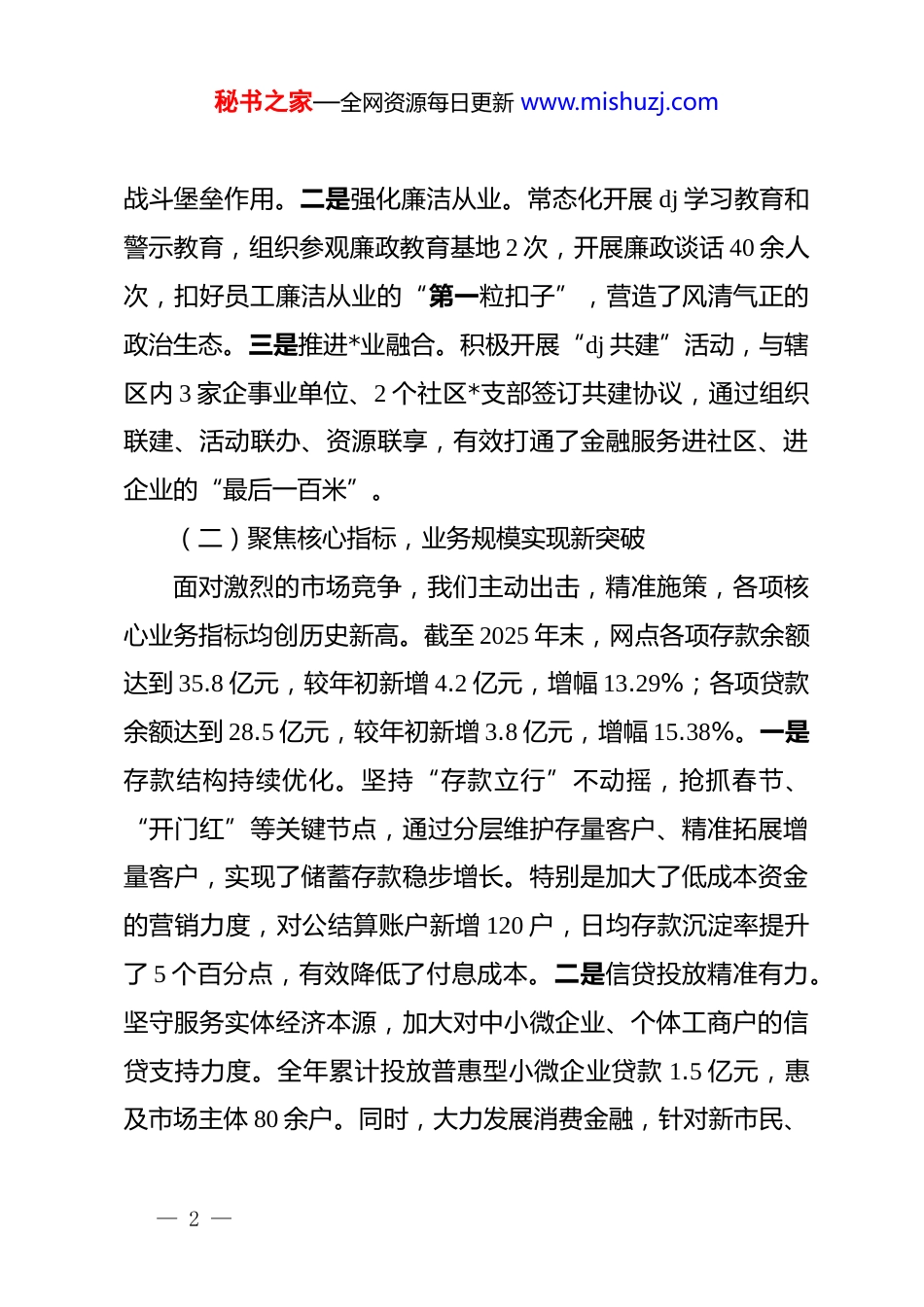秘书之家—全网资源每日更新 www.mishuzj.com银行网点 2025 年度工作总结及 2026 年工作计划:强基固本提质增效,守正创新行稳致远2025 年,在分行*委的坚强领导下,我网点坚持以**************思想为指导,深入贯彻落实中央金融工作会议精神,紧紧围绕服务实体经济、防控金融风险、深化金融改革三大任务,以“提质增效”为主线,顶住复杂多变的经济下行压力,统筹推进业务发展与风险合规管理,圆满完成了全年各项经营指标,为区域经济发展贡献了坚实的金融力量。一、坚持 dj 引领,深耕主责主业,经营质效迈上新台阶一年来,我们始终坚持“抓 dj 就是抓发展”的理念,将政治优势转化为竞争优势,通过全员的不懈努力,实现了规模、质量、效益的协调发展。(一)筑牢思想根基,政治建设展现新气象我们始终把*的政治建设摆在首位,严格落实“第一议题”制度,全年累计开展专题理论学习 24 次,深入研讨**************思想,确保全员在思想上、政治上、行动上同*中央保持高度一致。一是夯实组织基础。规范开展“三会一课”、主题*日活动,创新推出“*员先锋岗+业务攻坚”模式,设立 3 个*员突击队,在旺季营销、不良清收等急难险重任务中充分发挥了— 1 —秘书之家—全网资源每日更新 www.mishuzj.com战斗堡垒作用。二是强化廉洁从业。常态化开展 dj 学习教育和警示教育,组织参观廉政教育基地 2 次,开展廉政谈话 40 余人次,扣好员工廉洁从业的“第一粒扣子”,营造了风清气正的政治生态。三是推进*业融合。积极开展“dj 共建”活动,与辖区内 3 家企事业单位、2 个社区*支部签订共建协议,通过组织联建、活动联办、资源联享,有效打通了金融服务进社区、进企业的“最后一百米”。(二)聚焦核心指标,业务规模实现新突破面对激烈的市场竞争,我们主动出击,精准施策,各项核心业务指标均创历史新高。截至 2025 年末,网点各项存款余额达到 35.8 亿元,较年初新增 4.2 亿元,增幅 13.29%;各项贷款余额达到 28.5 亿元,较年初新增 3.8 亿元,增幅 15.38%。一是存款结构持续优化。坚持“存款立行”不动摇,抢抓春节、“开门红”等关键节点,通过分层维护存量客户、精准拓展增量客户,实现了储蓄存款稳步增长。特别是加大了低成本资金的营销力度,对公结算账户新增 120 户,日均存款沉淀率提升了 5 个百分点,有效降低了付息成本。二是信贷投放精准有力。坚守服务实体经济本源,加大对中小微企业、个体工商户的信贷支持力度。全年累计投放普惠型小微企业贷款 1.5 亿元,惠及市场主体 80 余户。同时,大力发展消费金融,针对新市民、— 2 —秘书之家—全网资源每日更新 www.mishuzj.com青年群体推出特色消费贷产品,个人消费贷款余额较年初增长25%,有效激发了消费潜力。三是中间业务多元发展。依托财富管理体系,发力代理保险、基金、理财等中间业务,实现中间业务收入 450 万元,同比增长 18%。成功落地 2 单家族信托业务,实现了财富管理高端业务的破冰。(三)优化客户体验,服务能级实现新提升坚持以客户为中心,深化网点转型,着力打造“有温度”的百姓银行。一是推进网点智能化转型。全面升级智能柜员机(stm)功能,高频业务分流率达到 95%以上,柜面业务办理时长缩短 30%,极大提升了服务效率。设立“银发服务专区”,配备老花镜、轮椅等便民设施,为老年客户提供“陪同式”服务,保留现金柜台,有效解决了老年人“数字鸿沟”问题。二是深化网格化营销服务。将辖区划分为 8 个营销网格,实行“行长+客户经理+柜员”的“铁三角”服务模式,开展进社区、进商圈、进园区“三进”活动 150 余场,开展金融知识普及、反诈宣传等公益活动 30 余次,覆盖受众 5000 余人次,不仅提升了品牌形象,也挖掘了大量潜在客户。三是完善投诉处理机制。建立“首问负责制”和“投诉快速响应机制”,对客户诉求实行清单式管理、销号式落实。全年客户满意度调查评分达到 99.2 分,未发生一起重大监管投诉或舆情事件。— 3 —秘书之家—全网资源每日更新 www.mishuzj.com(四)严守风险底线,内控合规构筑新防线坚持“合规创...